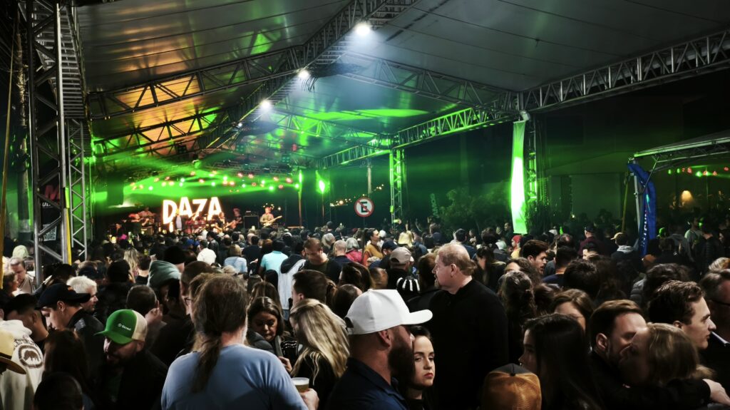 Às 19h, a banda Dazaranha subiu ao palco como a atração principal da noite. Com mais de 30 anos de trajetória, o “Daza”, como é carinhosamente chamado pelos fãs, apresentou um repertório repleto de sucessos, além de covers e canções inéditas. Natural de Florianópolis, o grupo mistura reggae e rock com elementos da cultura local, e é reconhecido como uma das principais expressões musicais de Santa Catarina.