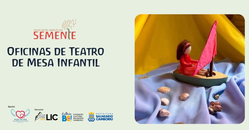 Inscrições estão abertas para professores da educação infantil, estudantes de pedagogia e demais interessados Com patrocínio da Lei de Incentivo à Cultura de Balneário Camboriú (LIC), a Associação Amigos da Semente oferecerá um ciclo de oficinas de teatro de mesa infantil a partir de agosto e até outubro (confira as datas abaixo). As atividades são […]