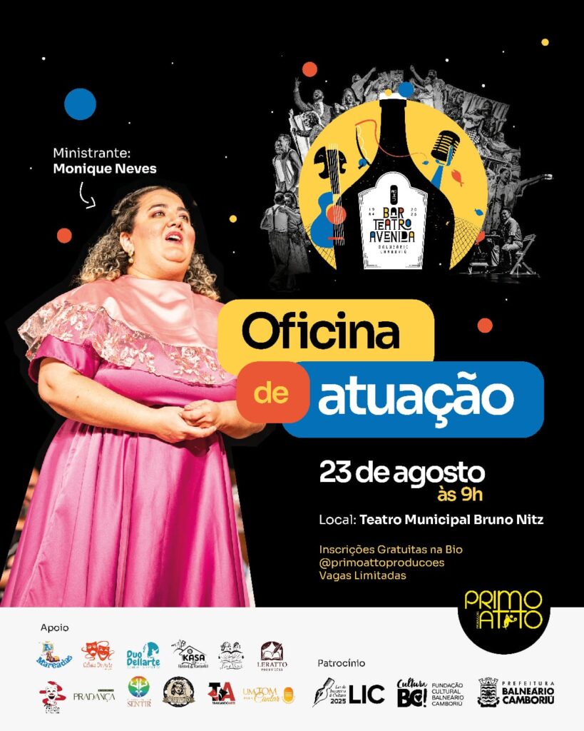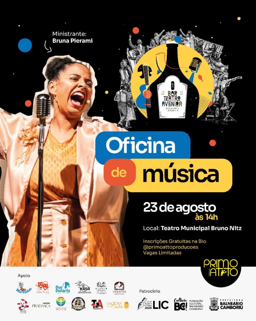 As atividades fazem parte da contrapartida social do projeto, o qual resultará na apresentação do espetáculo “Bar Teatro Avenida” no Teatro Municipal Bruno Nitz nos dias 21, 22, 23 e 24 de agosto de 2025, com entrada gratuita. Inspirado no lendário bar homônimo que existiu na década de 1950 em Balneário Camboriú, o espetáculo tem direção-geral da atriz e diretora Monique Neves e direção musical da compositora, atriz e cantora Bruna Pierami.