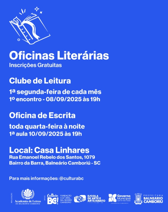 Inscrições Gratuitas Clube de Leitura1ª segunda-feira de cada mês1º encontro – 08/09/2025 às 19h Oficina de Escritatoda quarta-feira à noite1ª aula 10/09/2025 às 19h Local: Casa LinharesRua Emanoel Rebelo dos Santos, 1079Bairro da Barra, Balneário Camboriú – SC Para mais informações: @culturabc Inscreva-se aqui Dúvidas whatsapp: (47) 9111-6169
