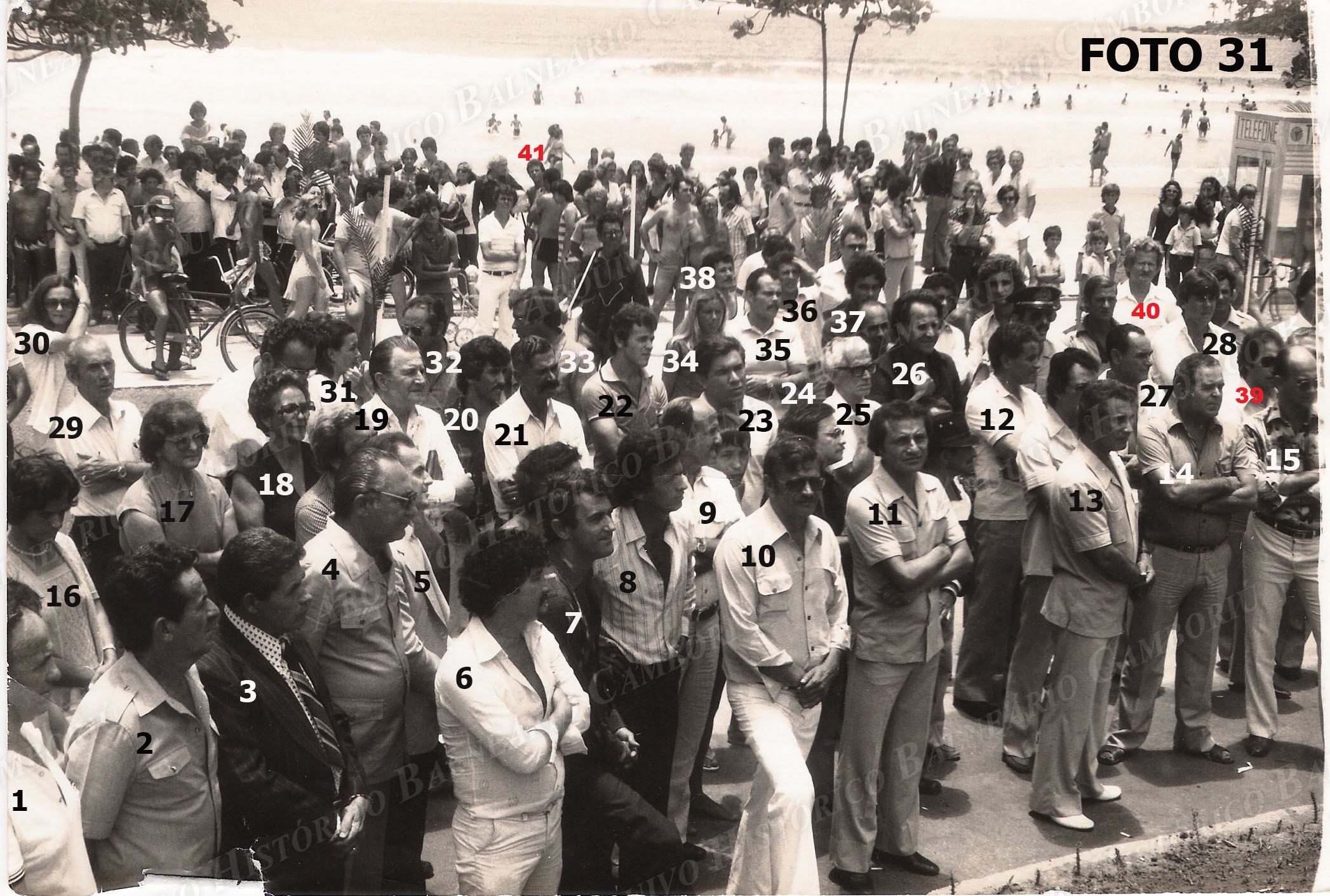 Foto 2373 – Evento na Praça Almirante Tamandaré, Av. Atlântica, década de 1970. Foram identificadas 27 pessoas: 2 – Professor David Husadel, 3 – Jonas Paulo de Andrade (Baiano), 4 – Wilson Achutti, 5 – Álvaro Silva, 6 – Walmir Correa, 7 – Bento Guilherme Pereira, 8 – Paulo Roberto dos Santos, 9 – Nildo Teixeira de Melo (Teixeirinha), 10 – Antonio Bernardo Passos, 11 – Renato da Silva (Renato charmoso), 12 – Roberto (desenhista da prefeitura), 14 – Gil Nunes, 15 – Moacir Schlup, 16 – Lúcia Nascimento, 19 – Ari Garcia, 20 – Luizinho 21 – João Bigode, 25 – Irineu Bittencourt (Tico-Tico), 26 – João (filho do proprietário do Hotel Hamburgo), 27 – Heraldo Arruda, 28 – Carlos (funcionário da prefeitura), 33 – Joel Gall, 36 – João Santos Linhares (Kiko Kalhas), 38 – Nilson Manoel de Borba (Neném), 39 – Delegado Renato Ribas, 40 – Rubem Braun, 41 – Aliomar Passos.