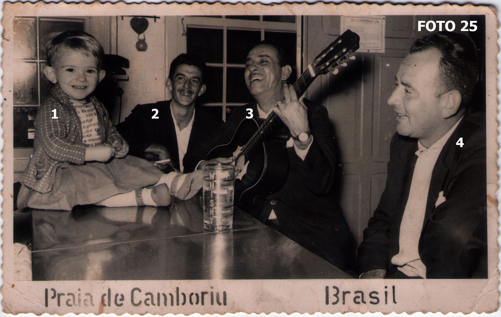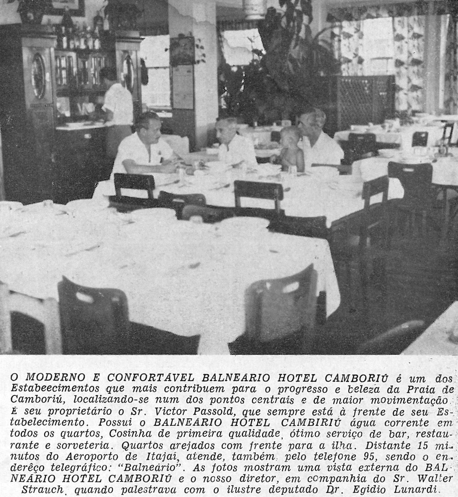 Foto 4000 – Interior do Hotel Balneário. Data provável: dezembro de 1961, pois a foto aparece na Revista do Sul, edição de janeiro de 1962. Identificados: 1 – Deputado Egídio Lunardi; 2 – Diretor da Revista do Sul, Osias Guimarães; 3 – (Pepi?); 4 – Walter Strauch.