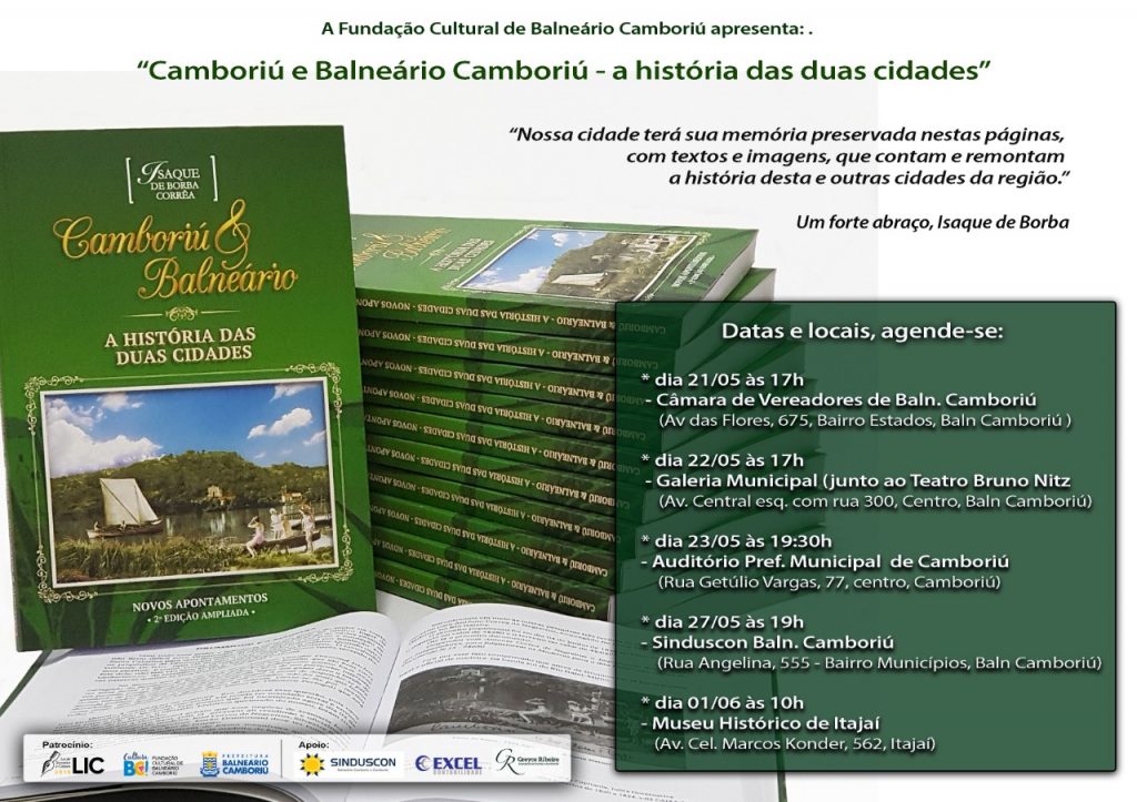 O livro “Camboriú & Balneário – a história das duas cidades”, do autor e historiógrafo Isaque de Borba Corrêa, será lançado nesta quarta-feira (22), às 17h, na Galeria Municipal de Arte Patrocinada pela Lei de Incentivo à Cultura de Balneário Camboriú (LIC), a obra será lançada posteriormente em outros quatro lugares nesta e na próxima semana […]