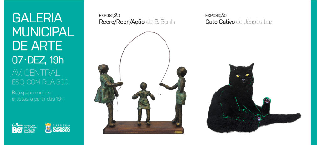A Galeria Municipal de Arte de Balneário Camboriú recebe duas exposições nesta quinta-feira (07). “Gato Cativo”, de Jéssica Luz, e “Recre/Recri/Ação”, de Beliria Boni, serão abertas à visitação às 19h. A entrada é gratuita. Às 18h, as duas artistas já estarão no local, para um bate-papo com o público. “Gato Cativo” abrange diferentes linguagens sobre […]