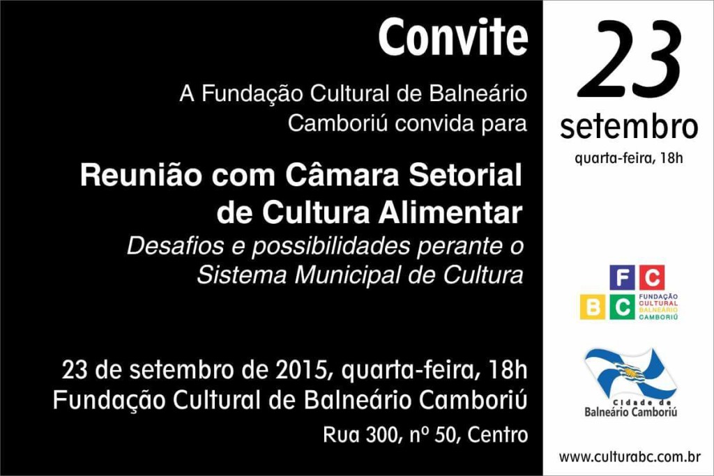 A Fundação Cultural convida para Reunião com a Câmara Setorial de Cultura Alimentar: Desafios e possibildiades perante o Sistema Municipal de Cultura 23 de setembro, quarta-feira, 18h Fundação Cultural de Balneário Camboriú Rua 300, nº 50 – Centro