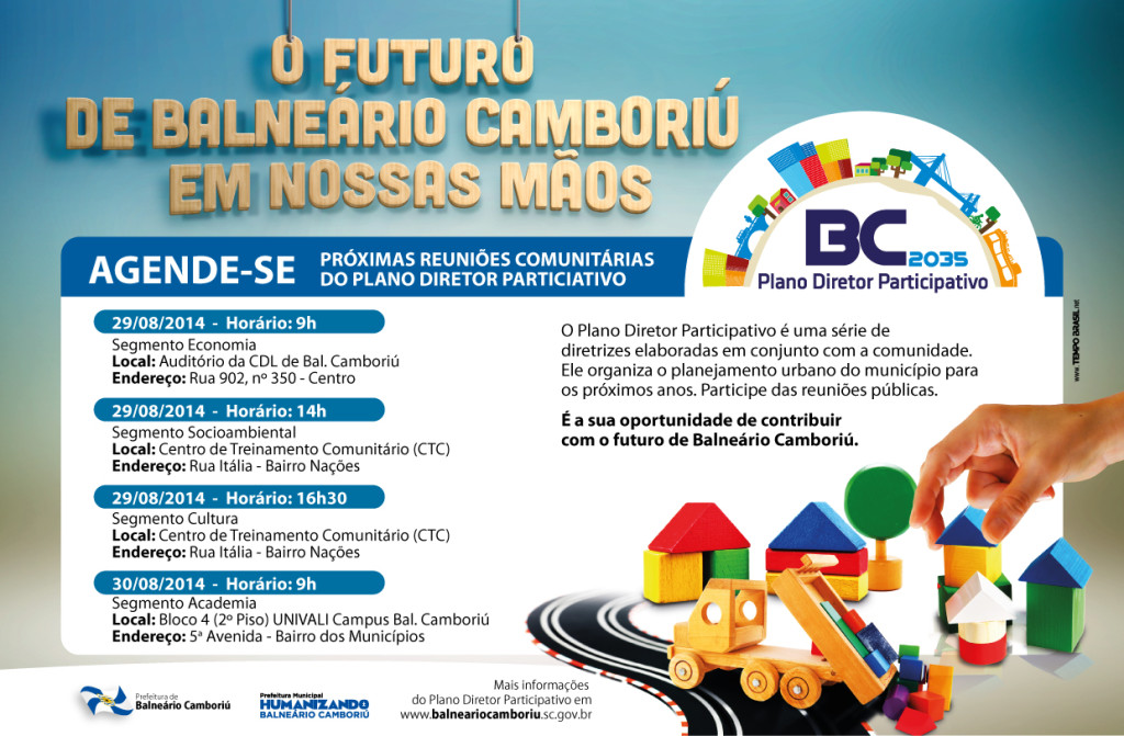 A Fundação Cultural de Balneário Camboriú (FCBC) convida os agentes culturais cadastrados ou não nas câmaras setoriais a participar da reunião do Plano Diretor Participativo voltada à Cultura. O encontro é público e está programado para 29 de agosto, às 16h30, no Centro de Treinamento Comunitário/CTC, localizado no final da rua Itália, bairro das Nações. […]