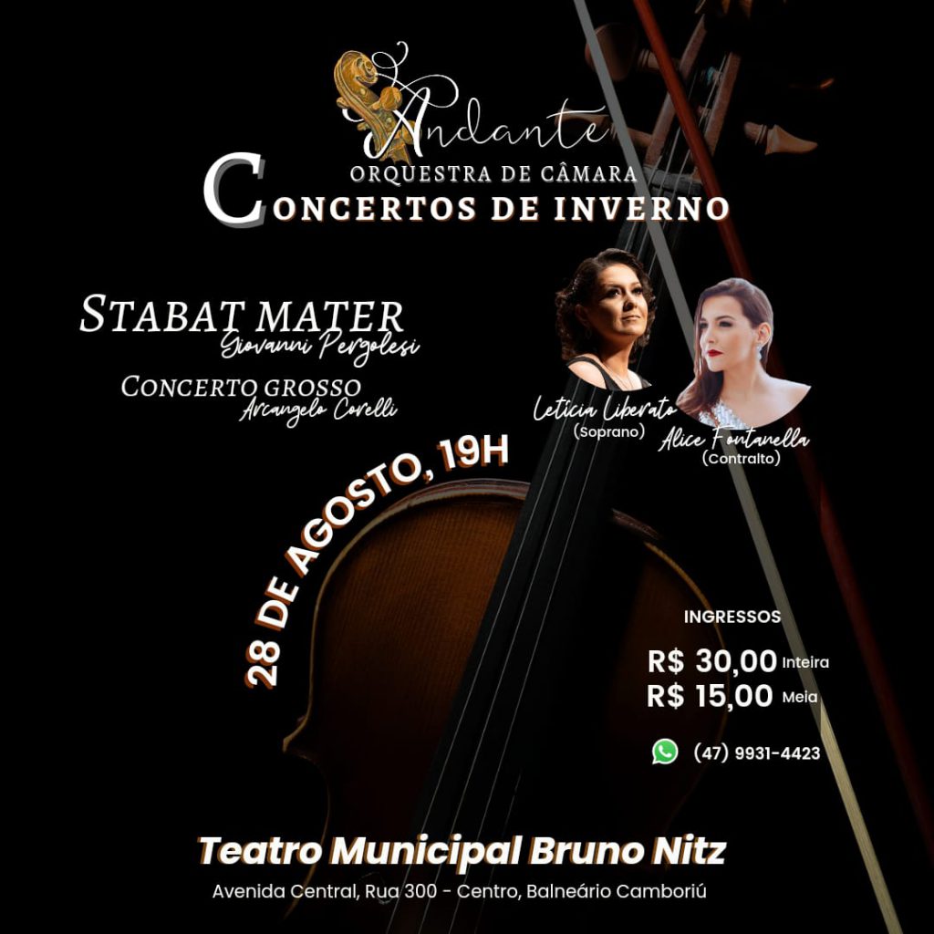 Com um repertório de música italiana do período barroco, a Orquestra Andante apresenta seu primeiro Concerto de Inverno no Teatro Municipal Bruno Nitz neste domingo (28), às 19h. O ingresso custa R$ 30, com meia-entrada de R$ 15. O espetáculo será a estreia da Orquestra Andante no teatro municipal. Criado em Balneário Camboriú em setembro […]