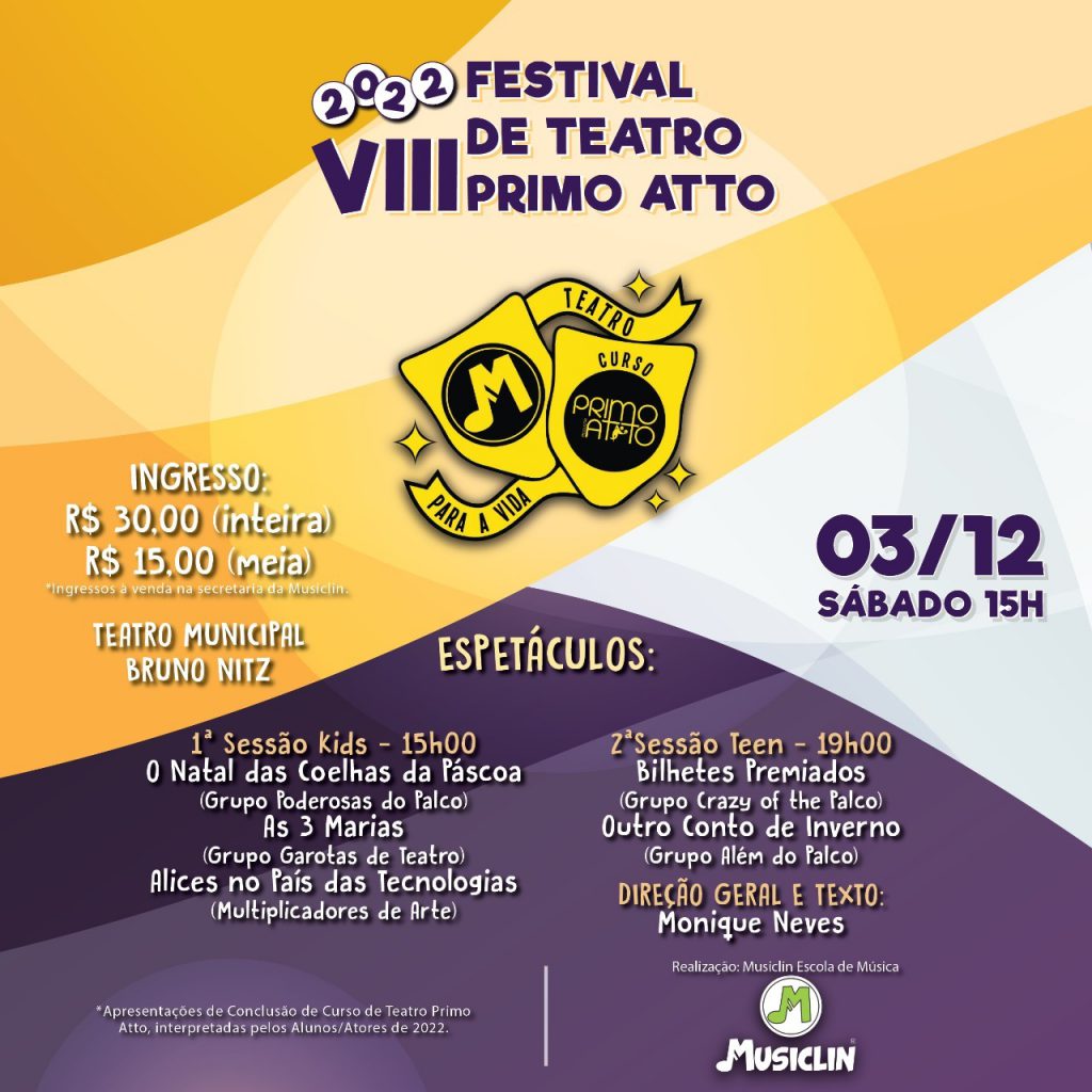 O Teatro Municipal Bruno Nitz recebe o VIII Festival de Teatro Primo Atto neste sábado (3), às 15h e às 19h. O ingresso para cada sessão custa R$ 30, com meia-entrada de R$ 15. Serão apresentadas cinco montagens teatrais idealizadas, produzidas e interpretadas por alunos/atores do Curso de Teatro Primo Atto, da escola Musiclin de […]