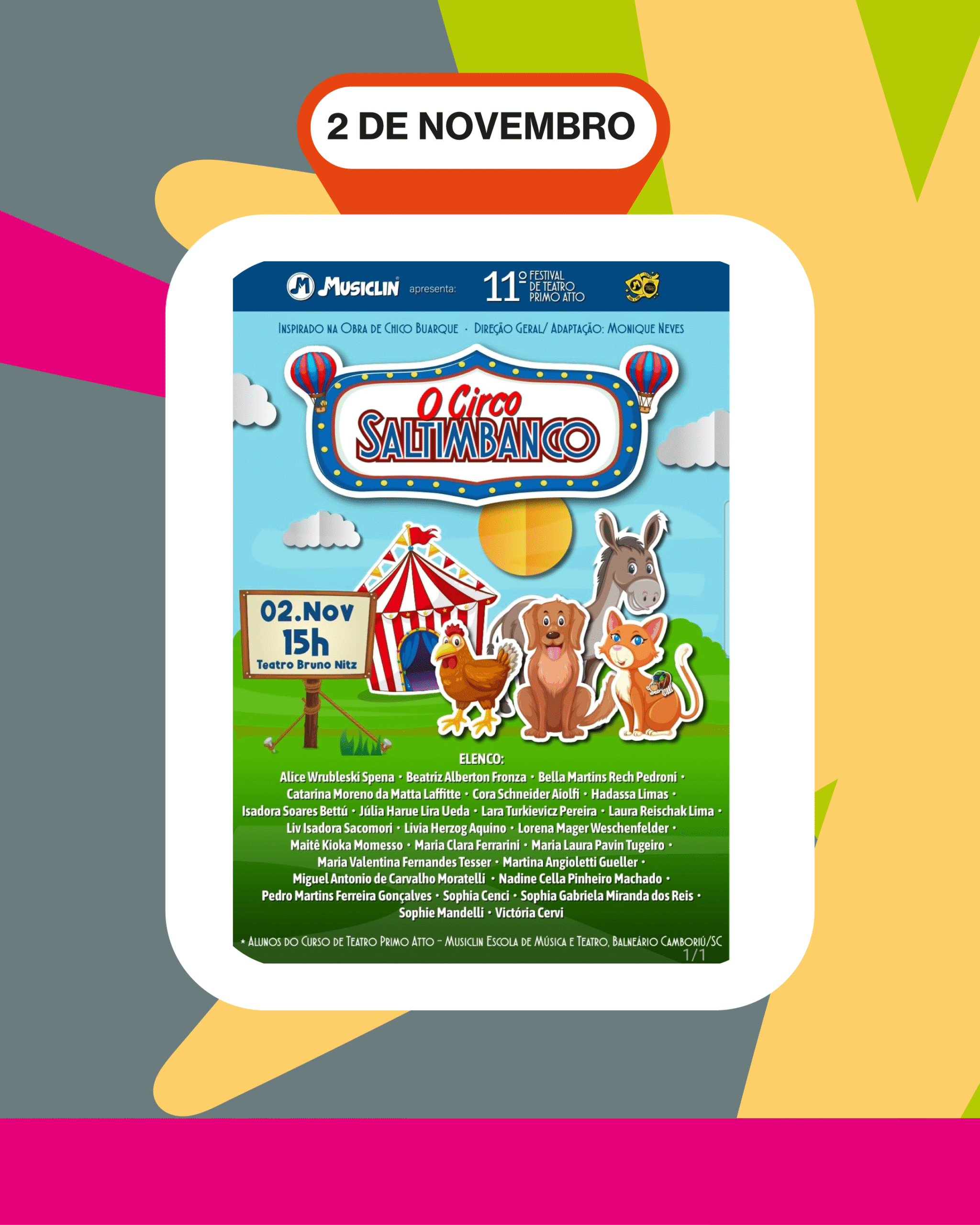 O festival chega à sua 11ª edição celebrando a imaginação e a formação de jovens artistas, com os espetáculos O Circo Saltimbanco e O Auto da Compadecida, interpretados pelos alunos do Curso de Teatro Primo Atto.