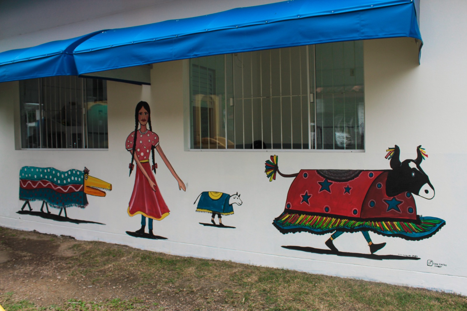 A obra representa uma menina de tranças e vestido vermelho juntamente com os personagens do tradicional “Boi de mamão”, o boi e a bernunça.