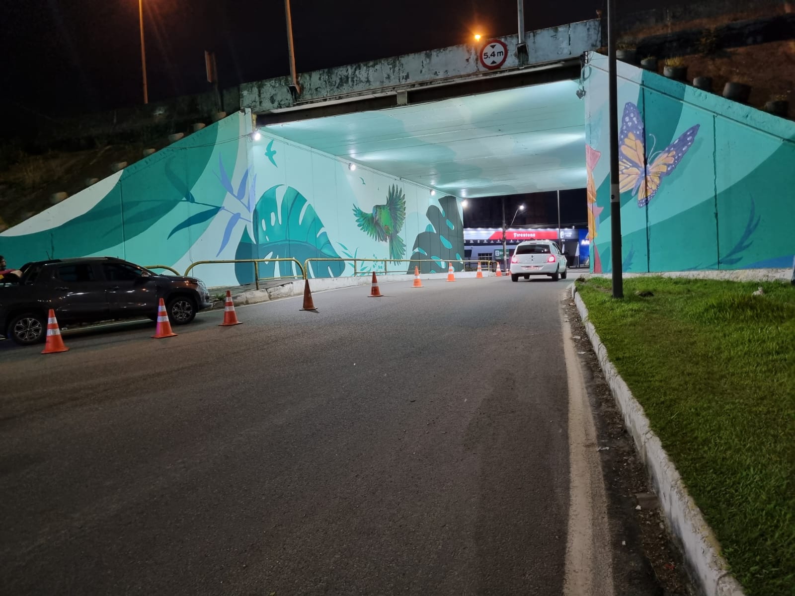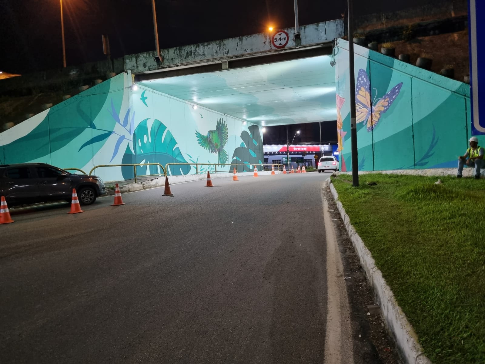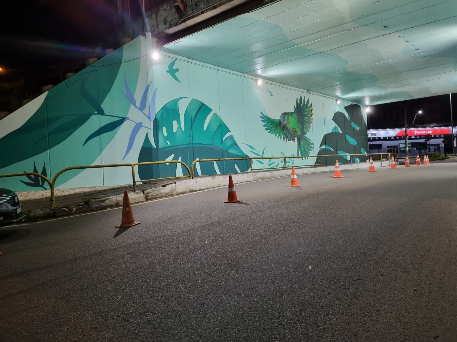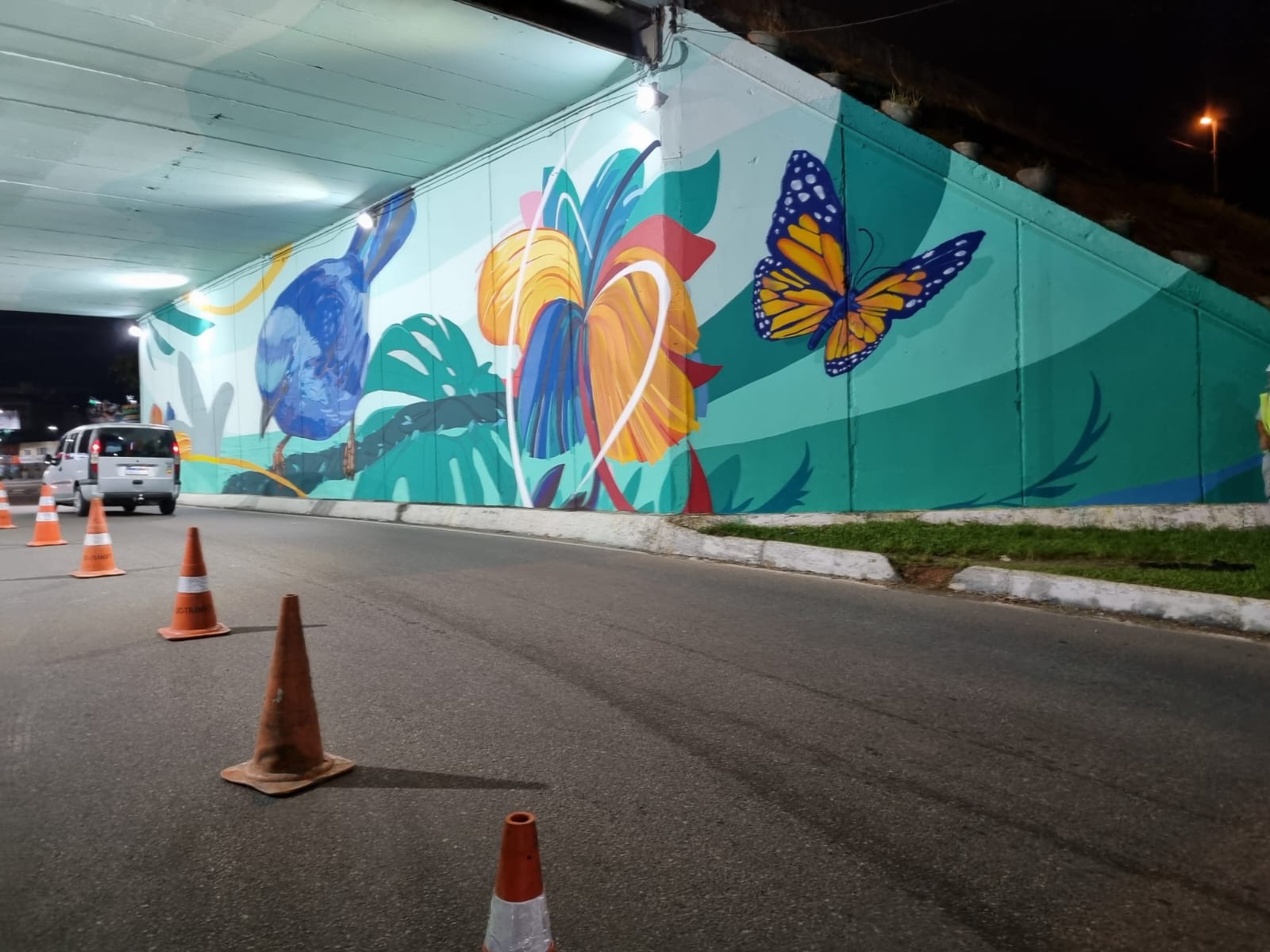 A pintura artística do viaduto retrata a saíra-bico-fino (ave-símbolo da cidade)