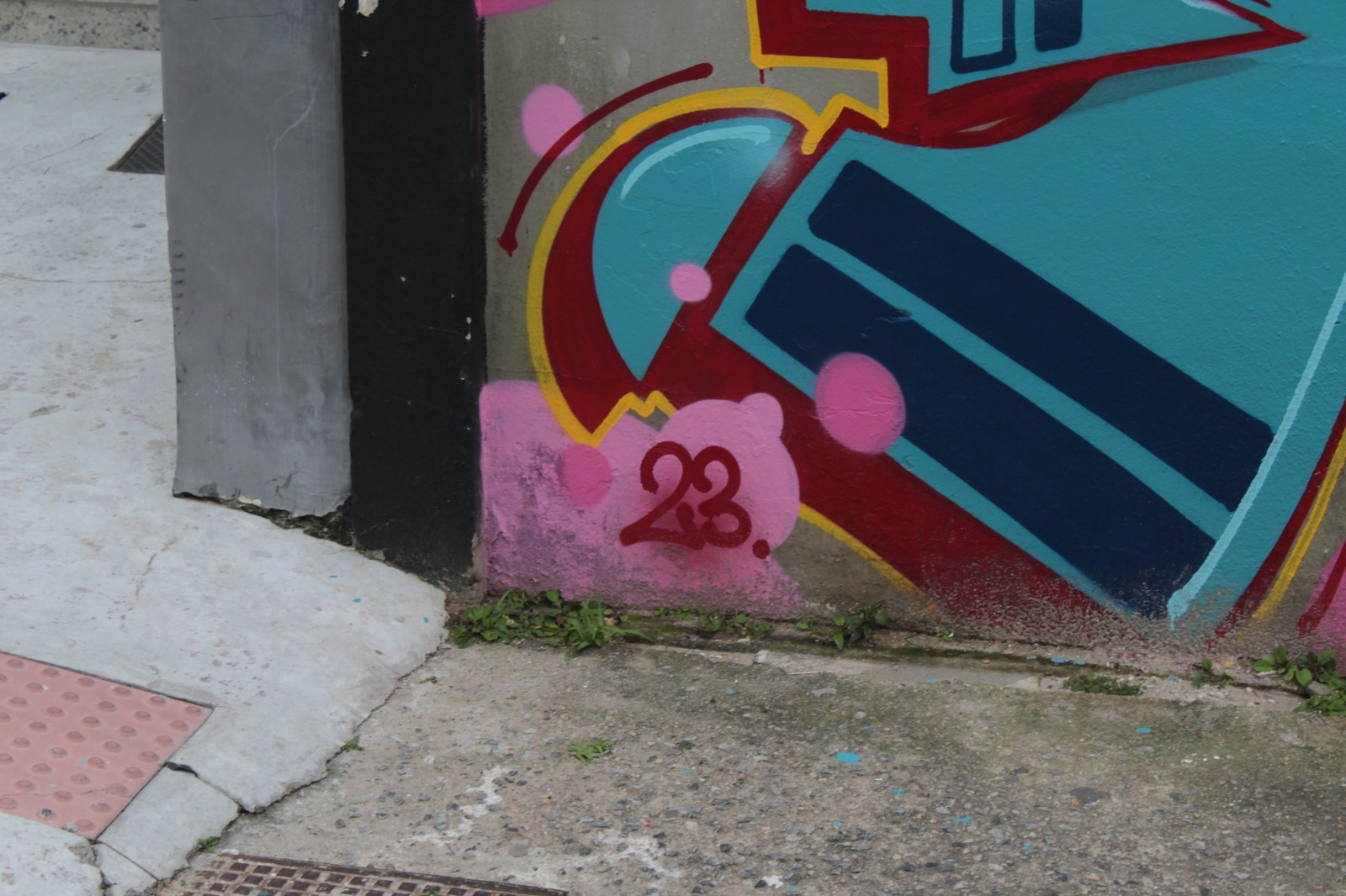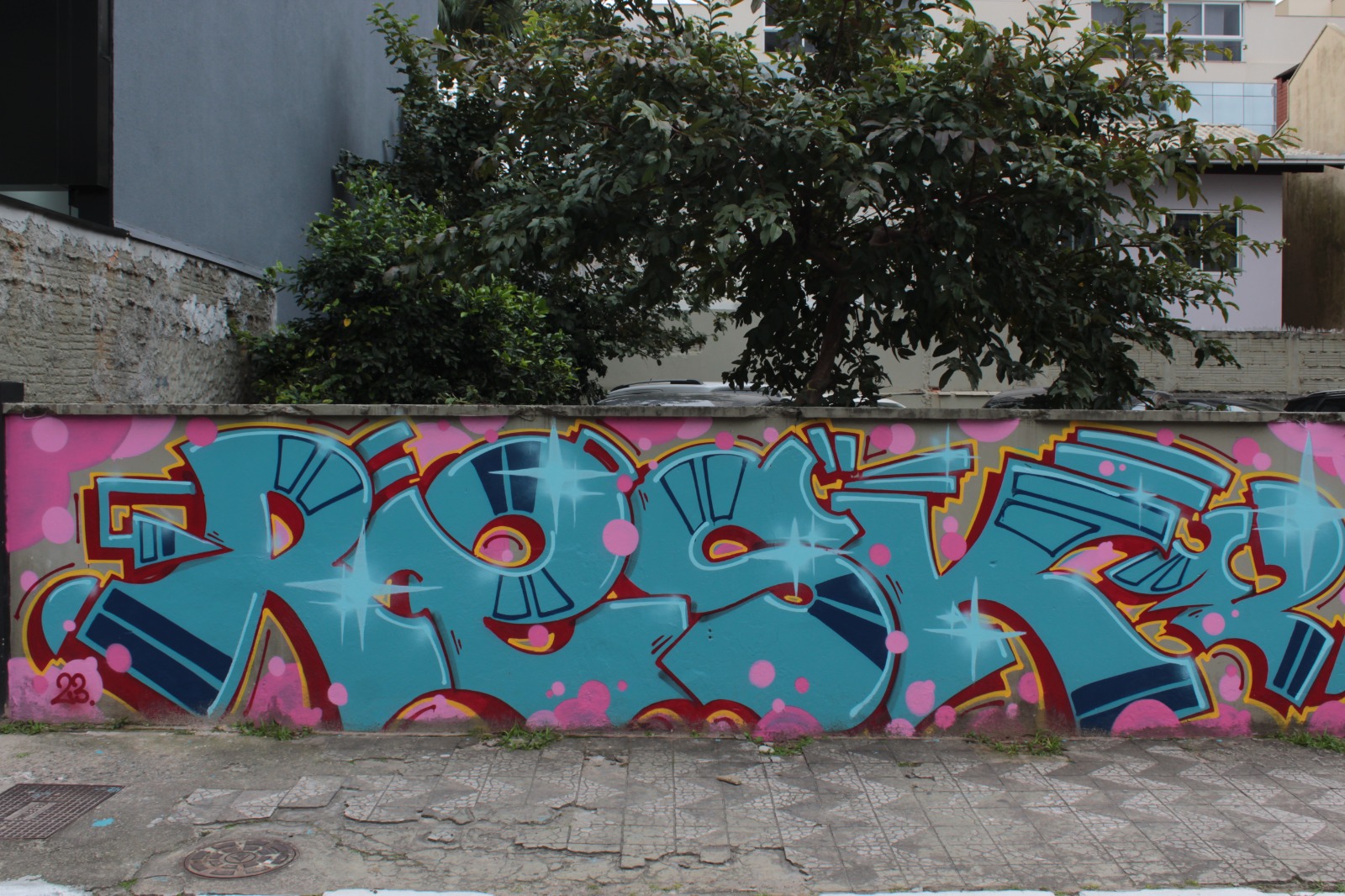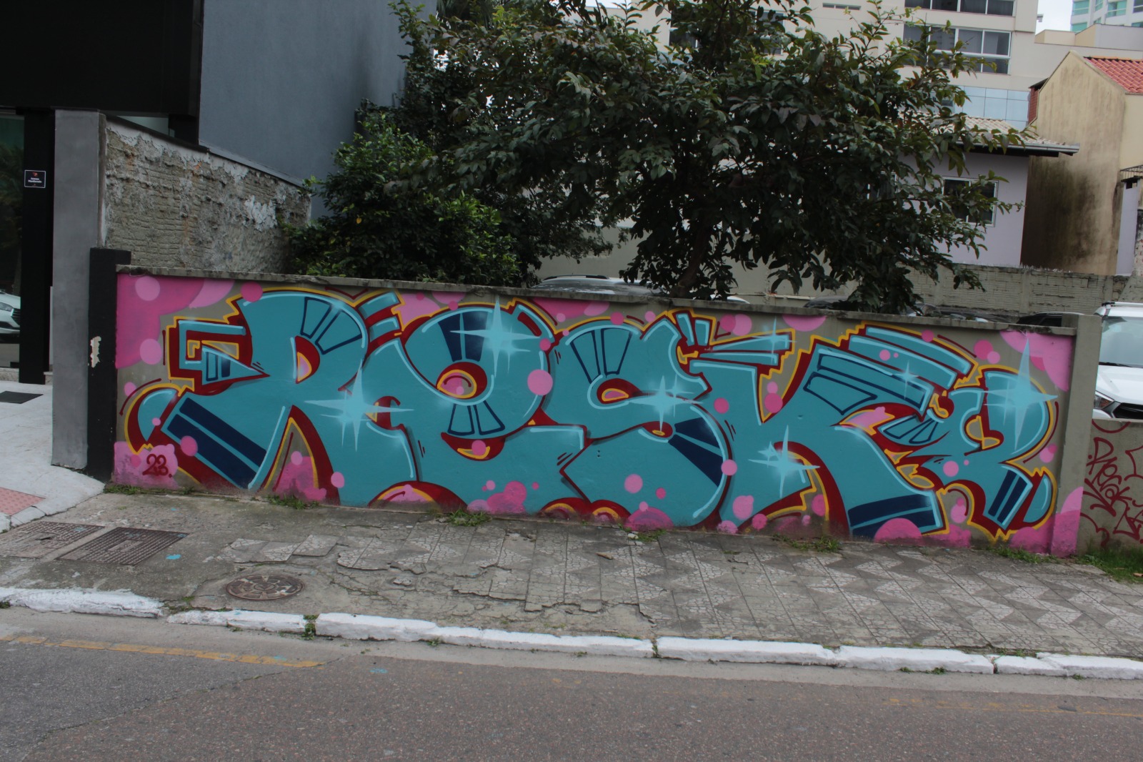 A obra representa letras com a escrita “Resk” em tons de azul com fundo na cor rosa.