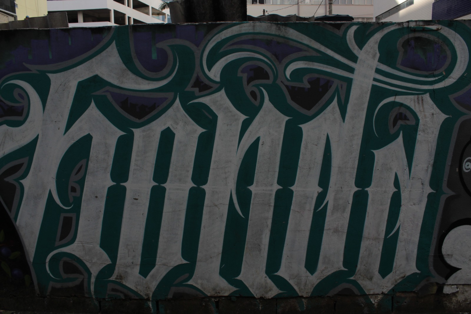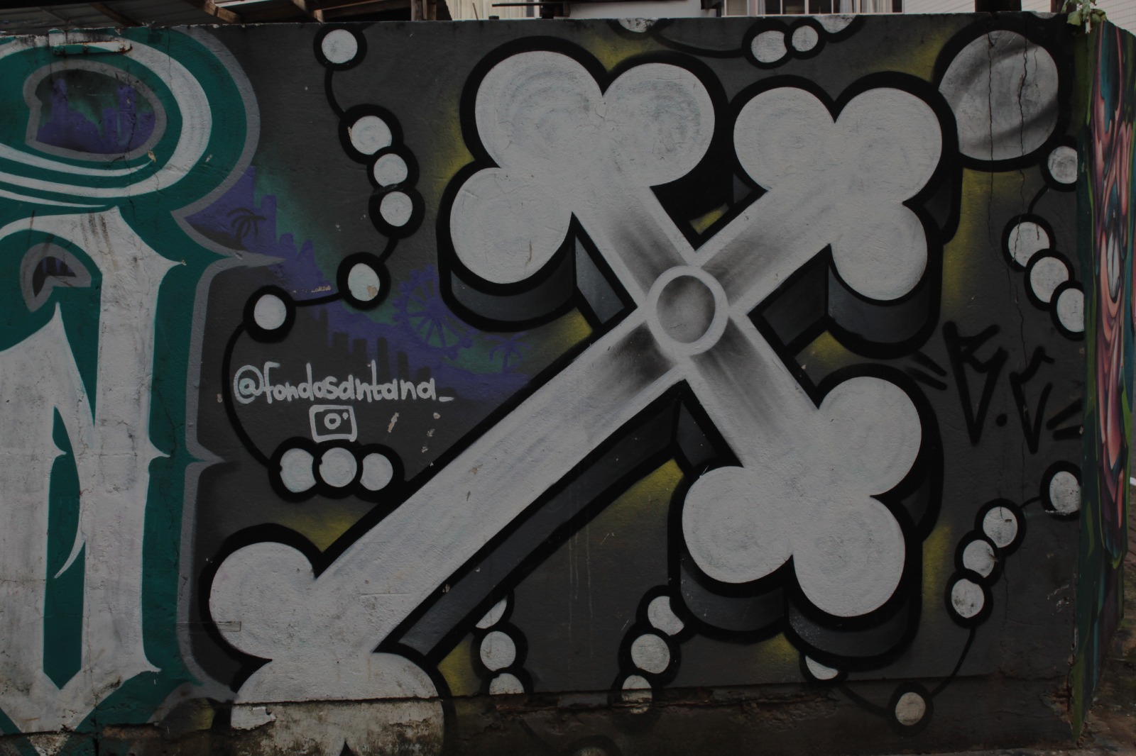 A obra representa uma cruz de cor branca com o fundo cinza e ao seu lado letras em estilo lettering de cor predominante branca e verde.