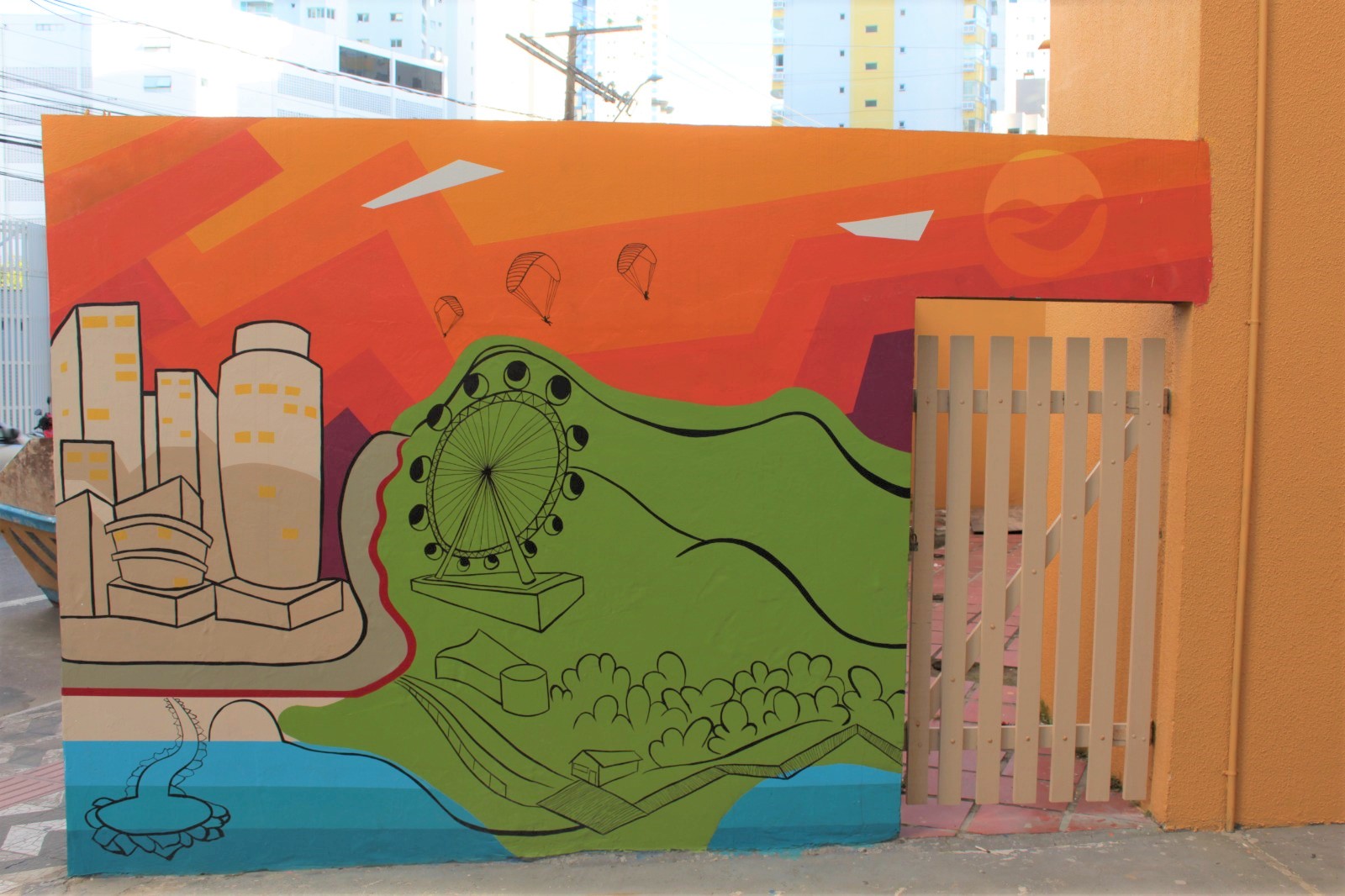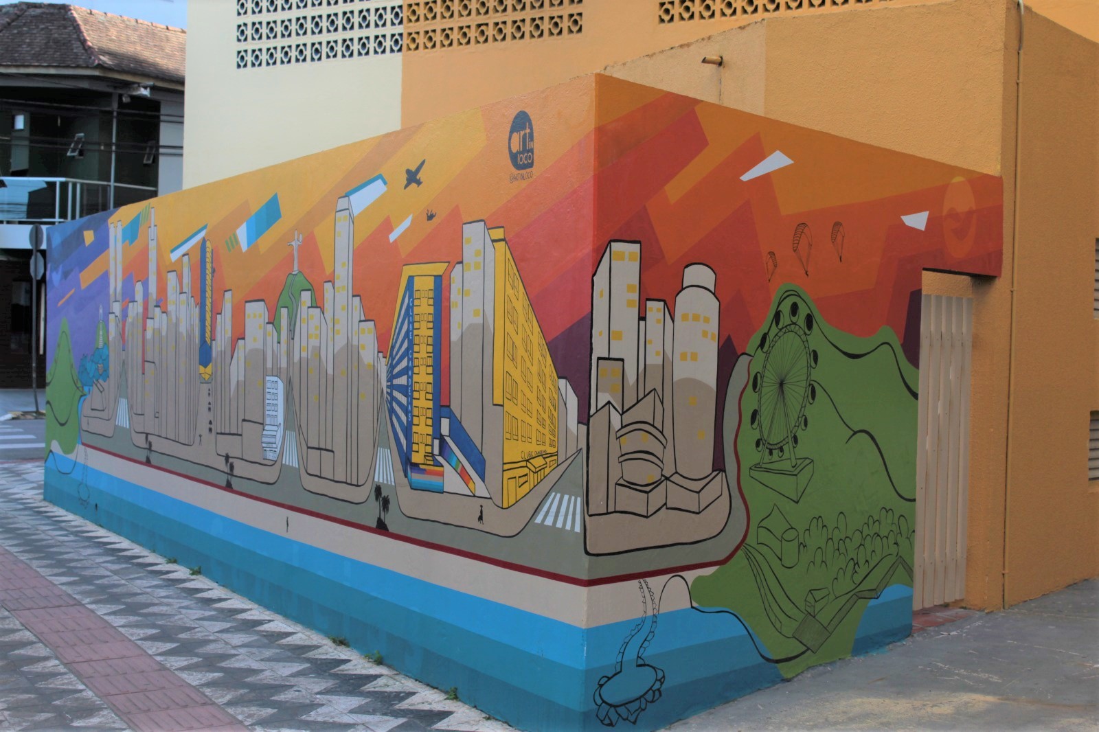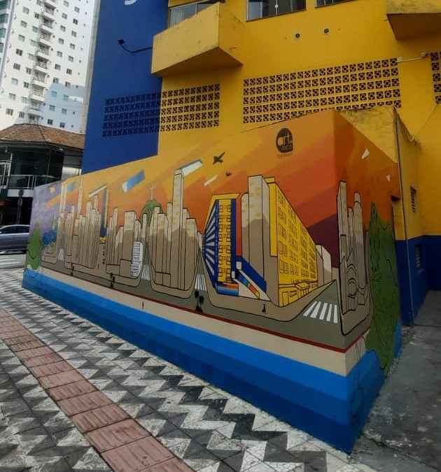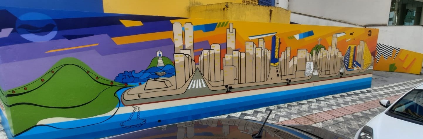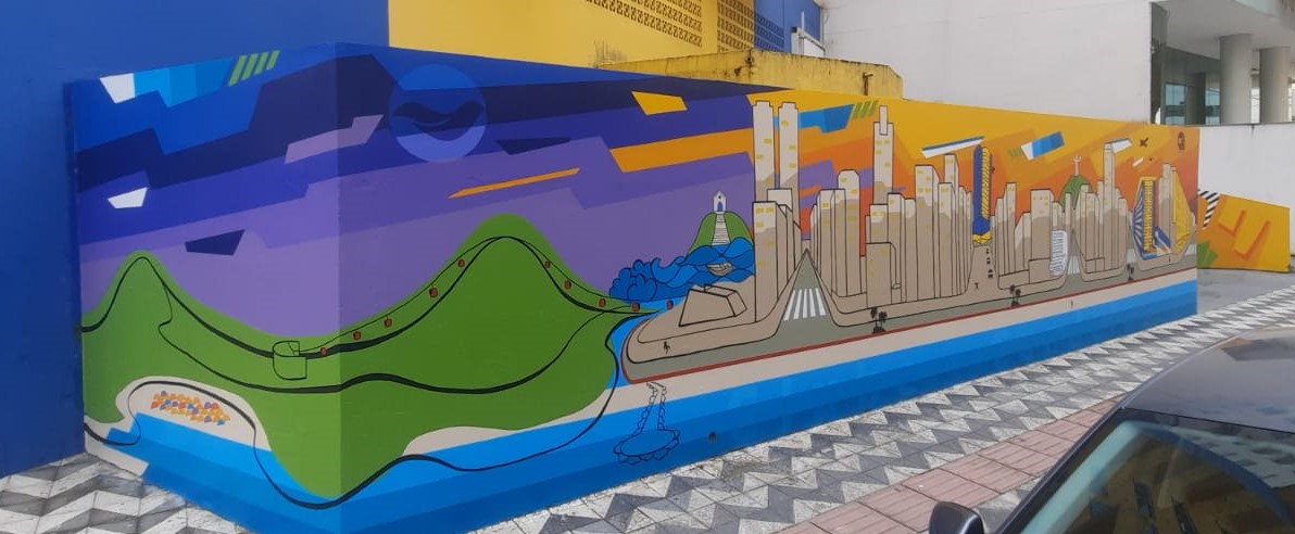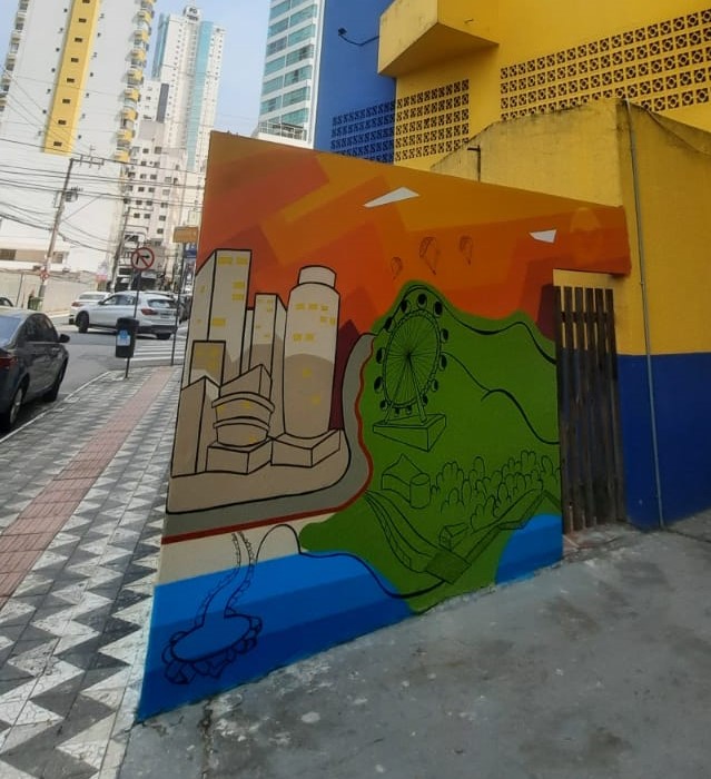 A obra representa a cidade de Balneário Camboriú com suas belezas naturais, seus arranha-céus e a igreja da Barra.
