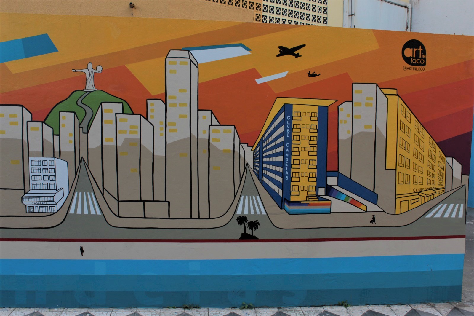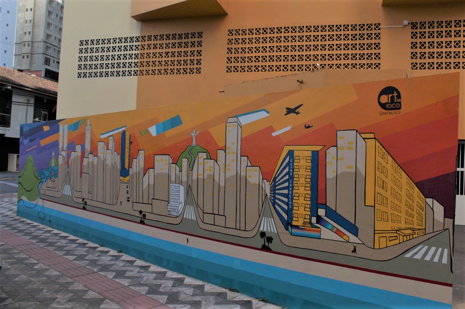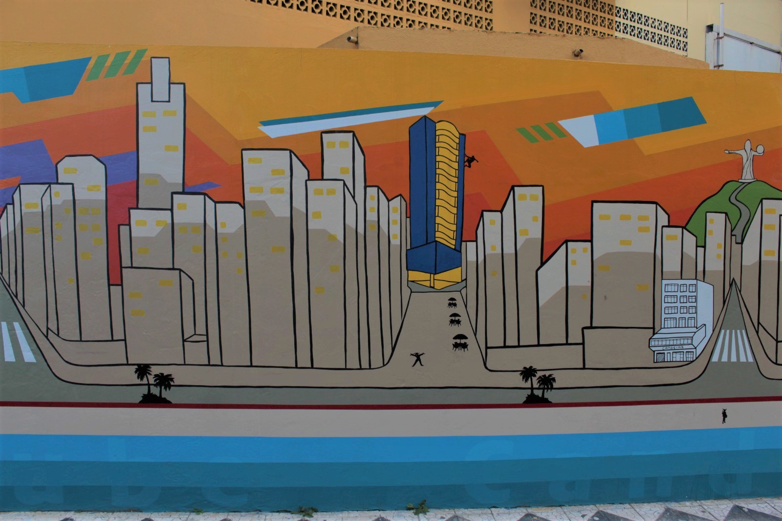 A obra representa a cidade de Balneário Camboriú com suas belezas naturais, seus arranha-céus e a igreja da Barra.