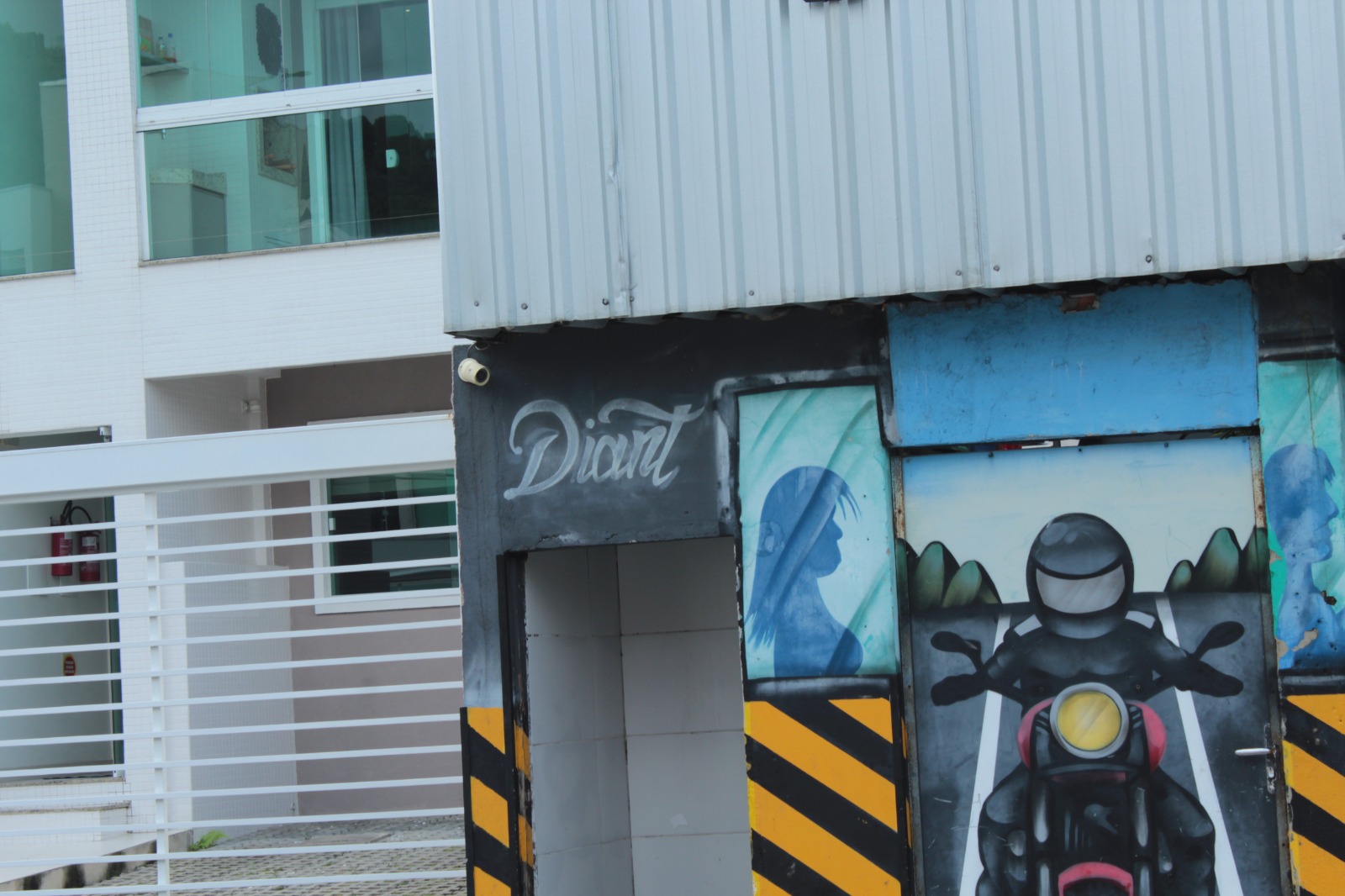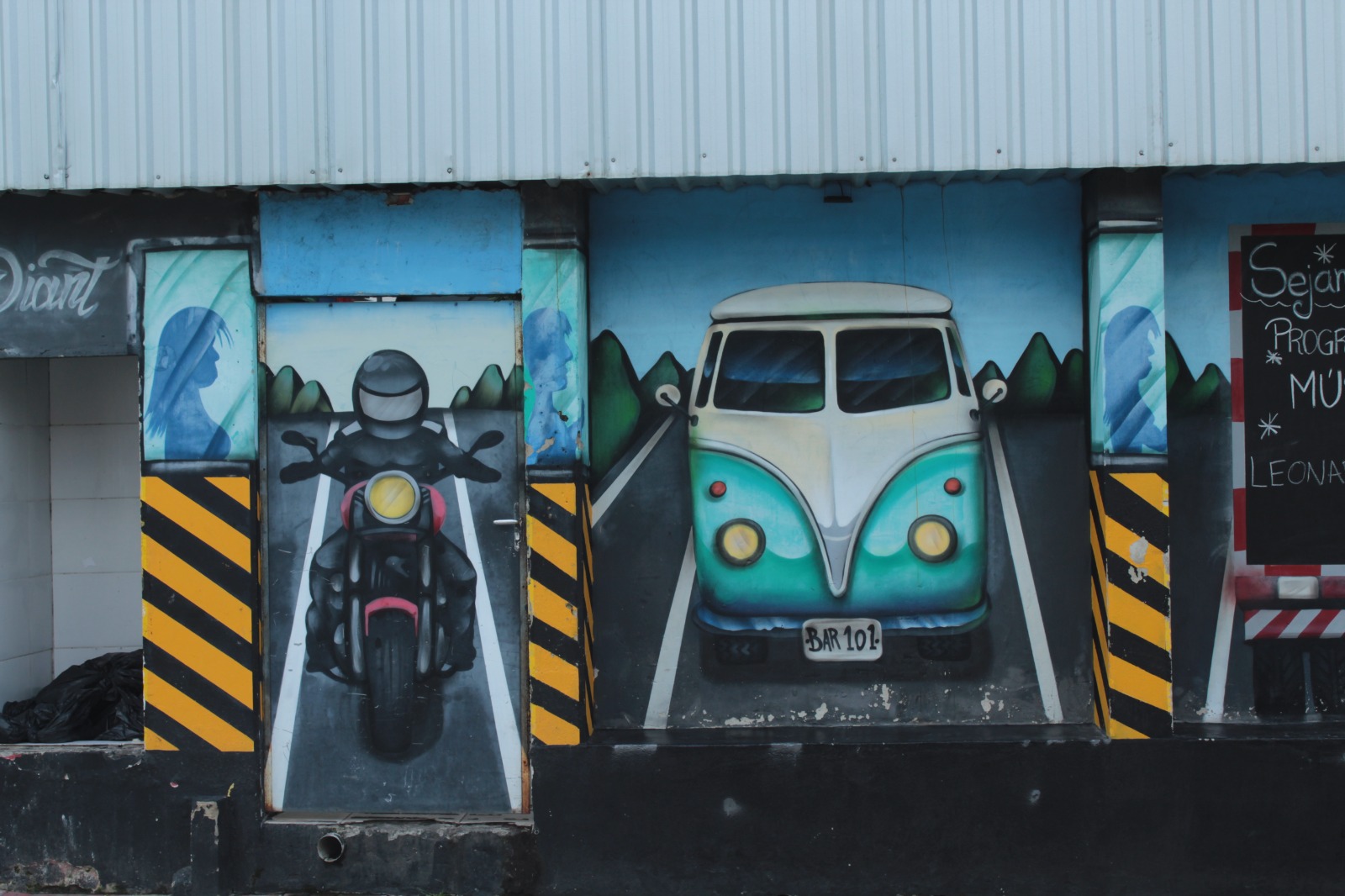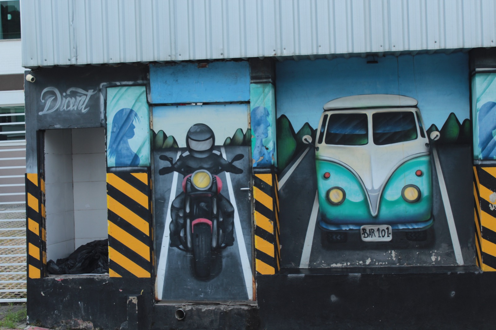 A obra representa a figura de um motociclista na estrada, com uma kombi ao lado.