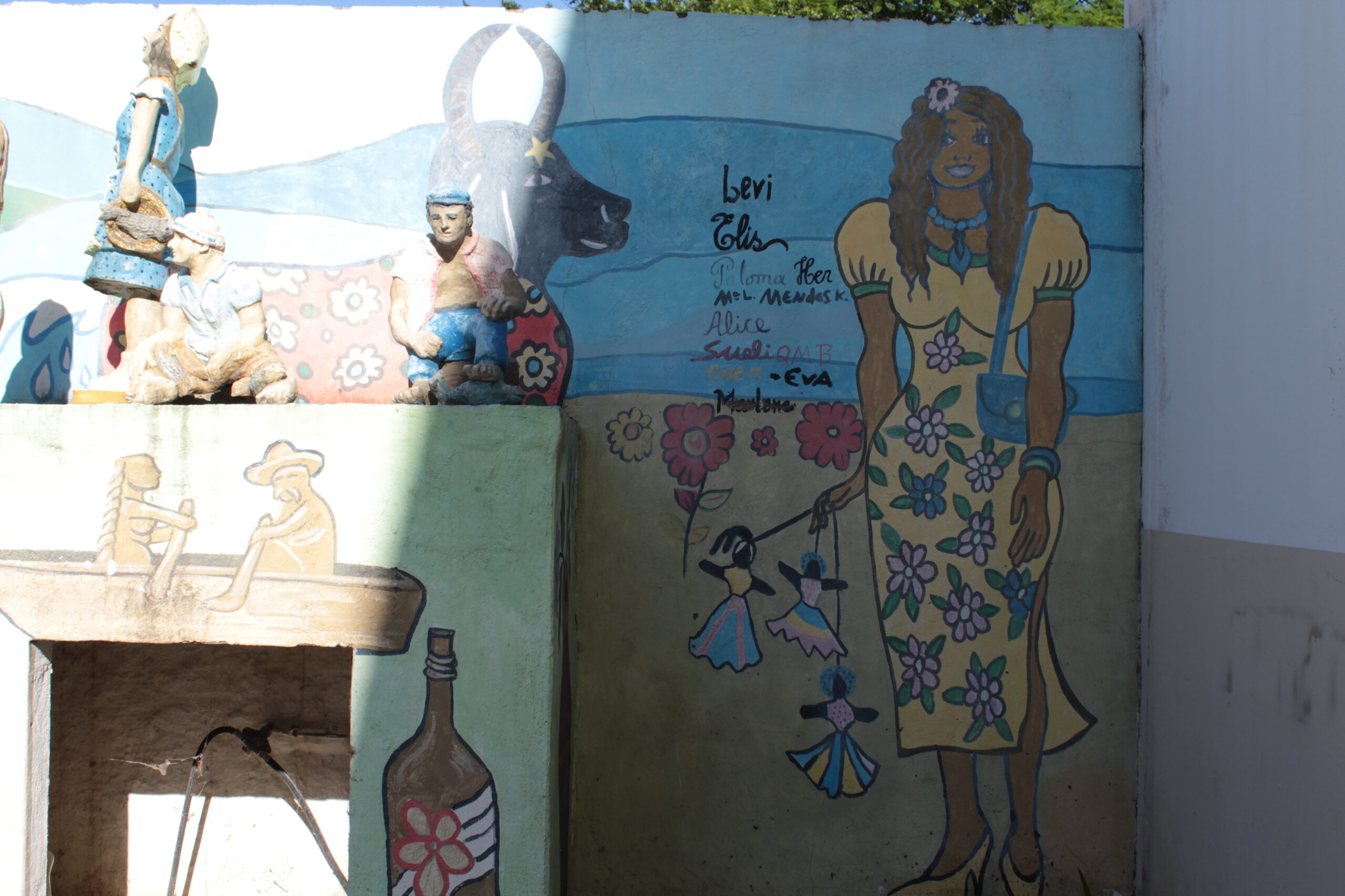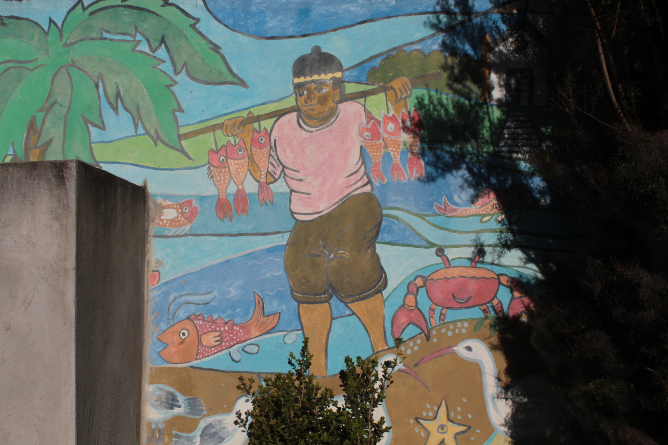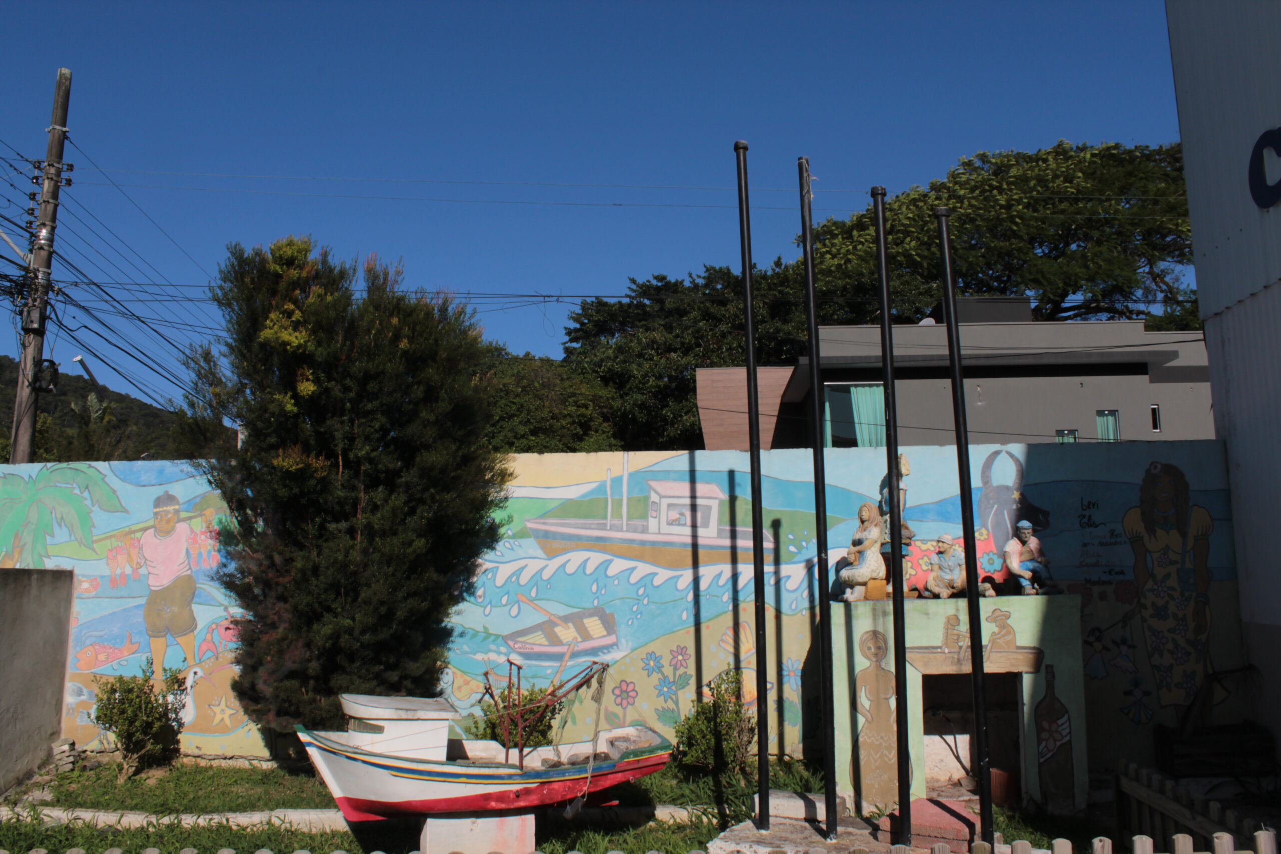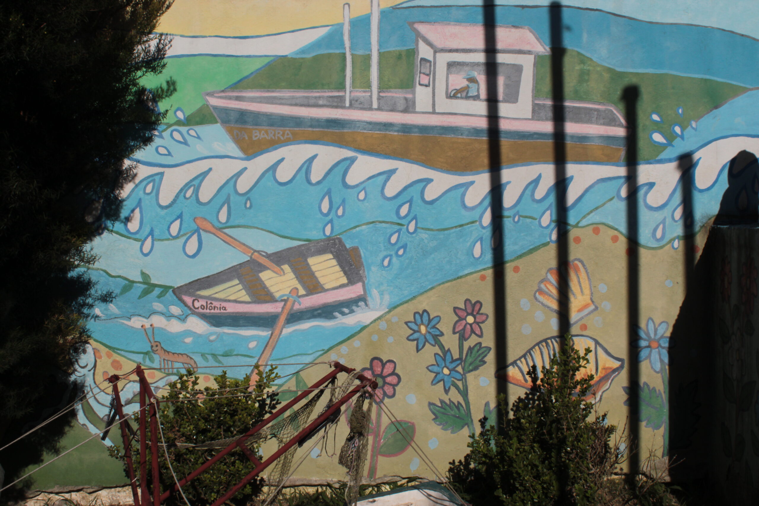 Mural com elementos que abordam a pesca local no bairro da barra.