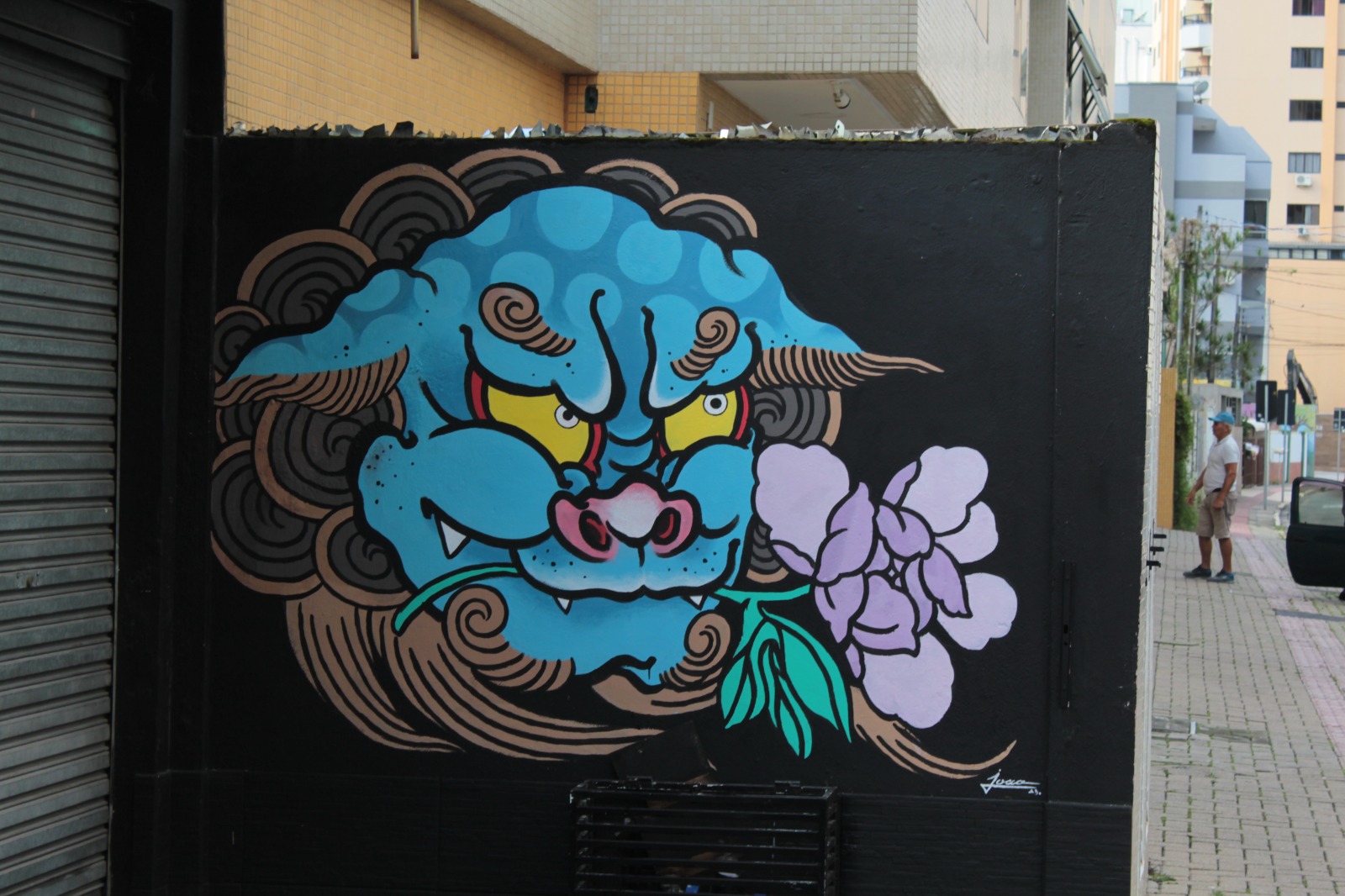 A obra representa um personagem de cor azul com uma flor na boca e o fundo de cor predominante preto.