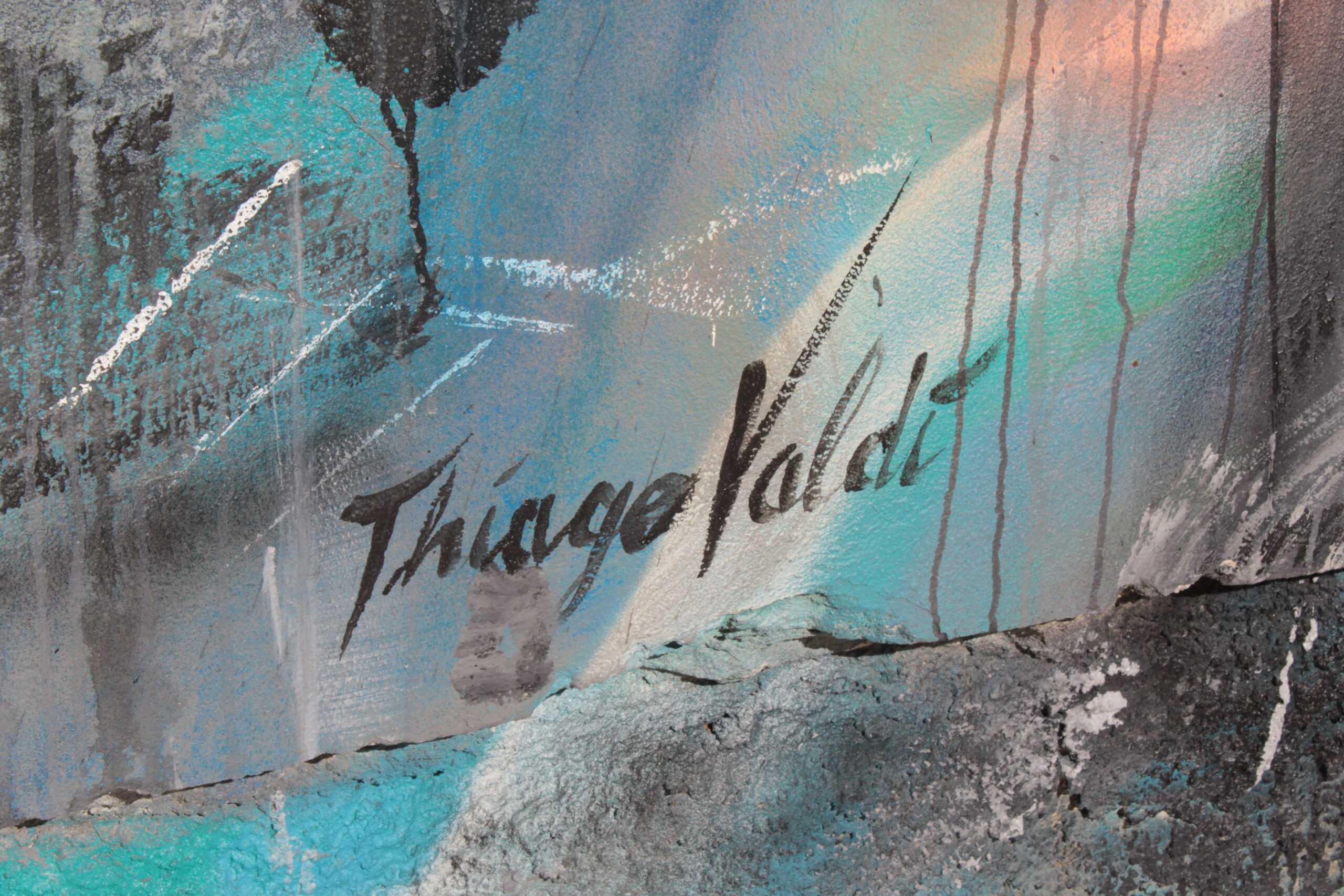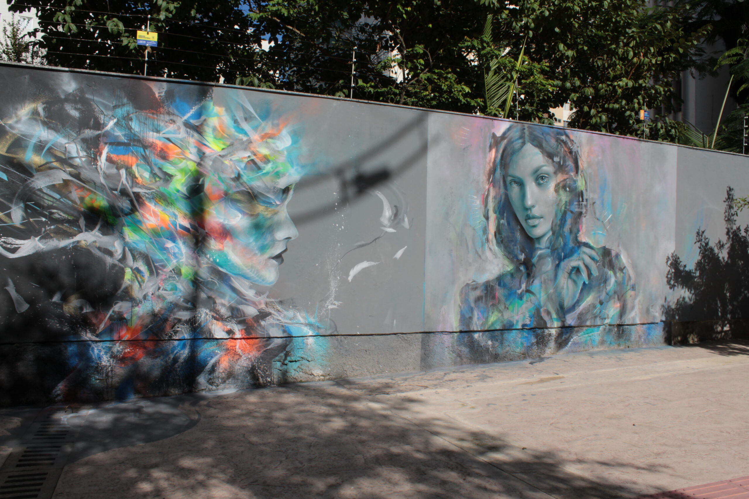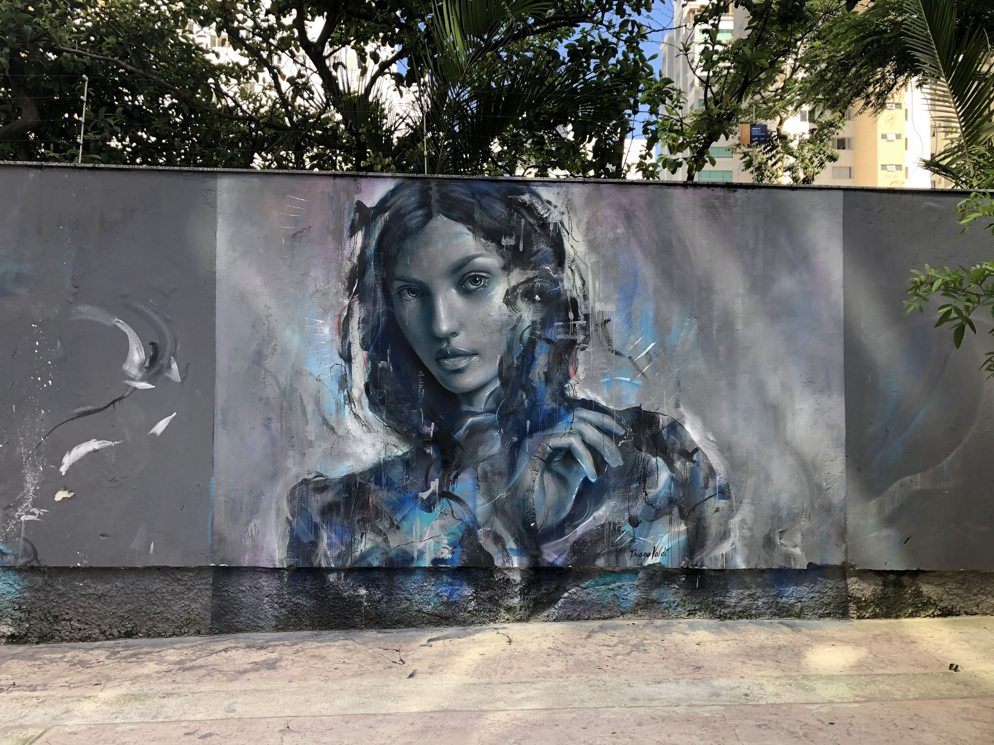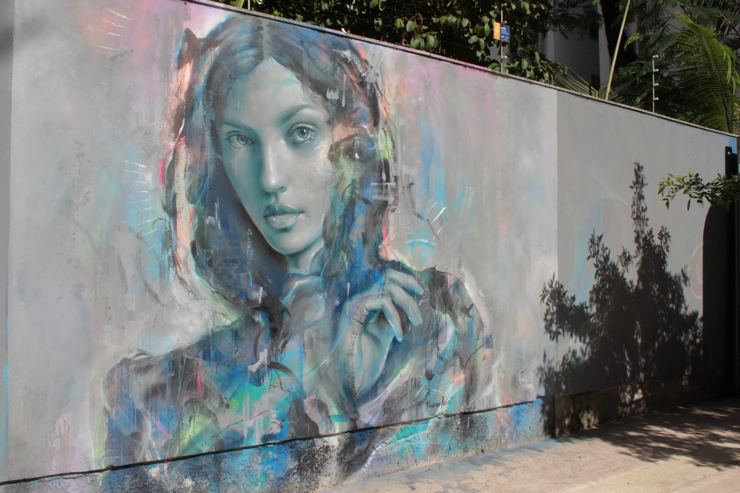 A obra representa uma figura de uma mulher colorida com diversos tons de azul sobre muro.