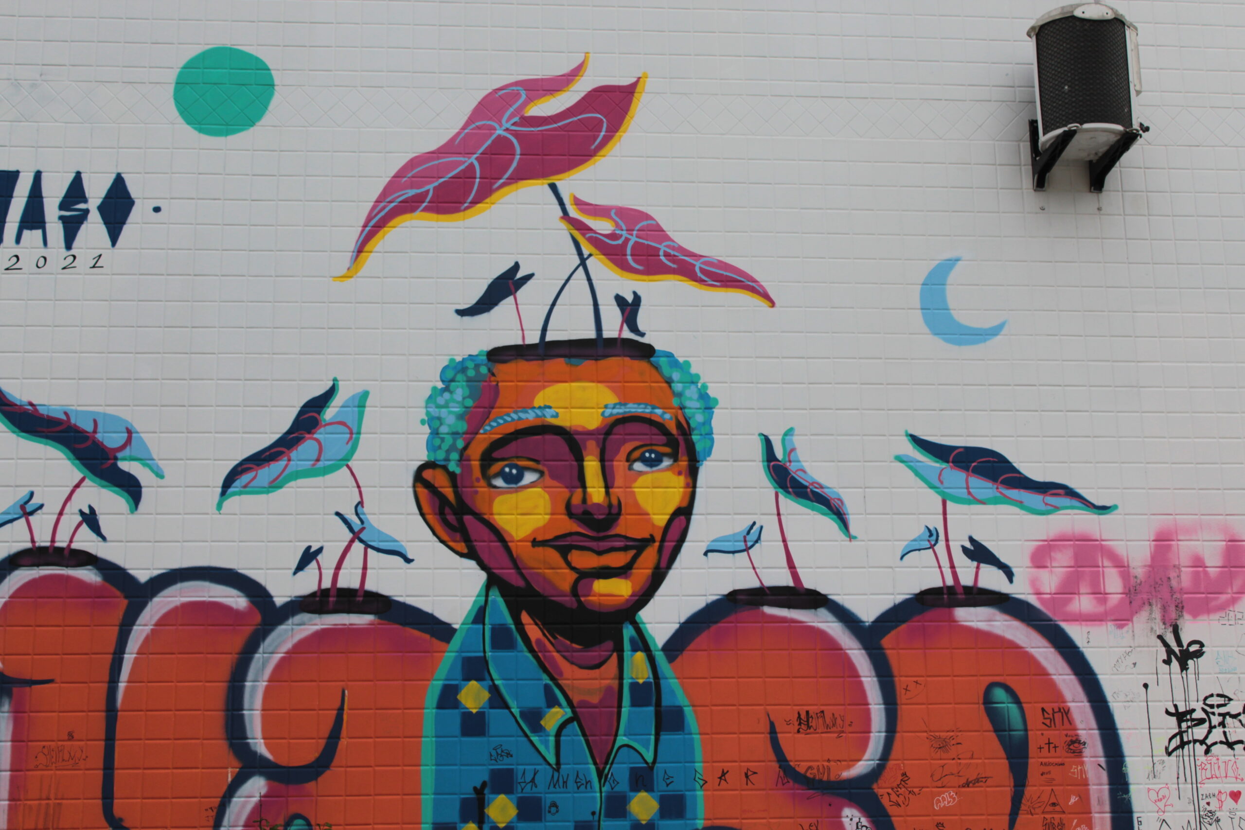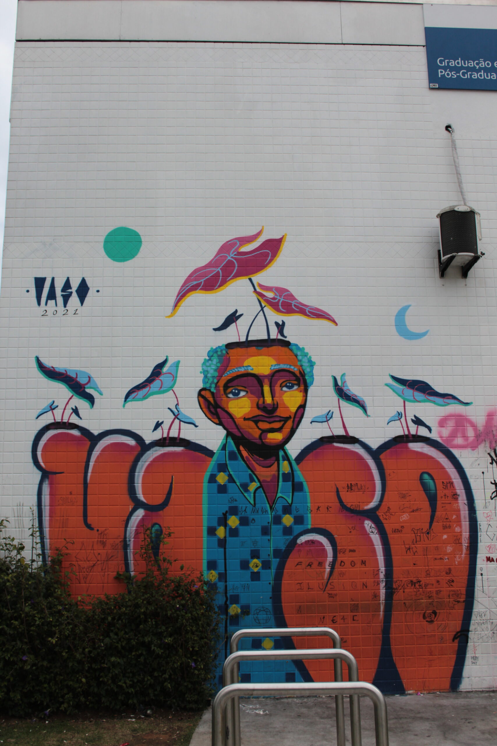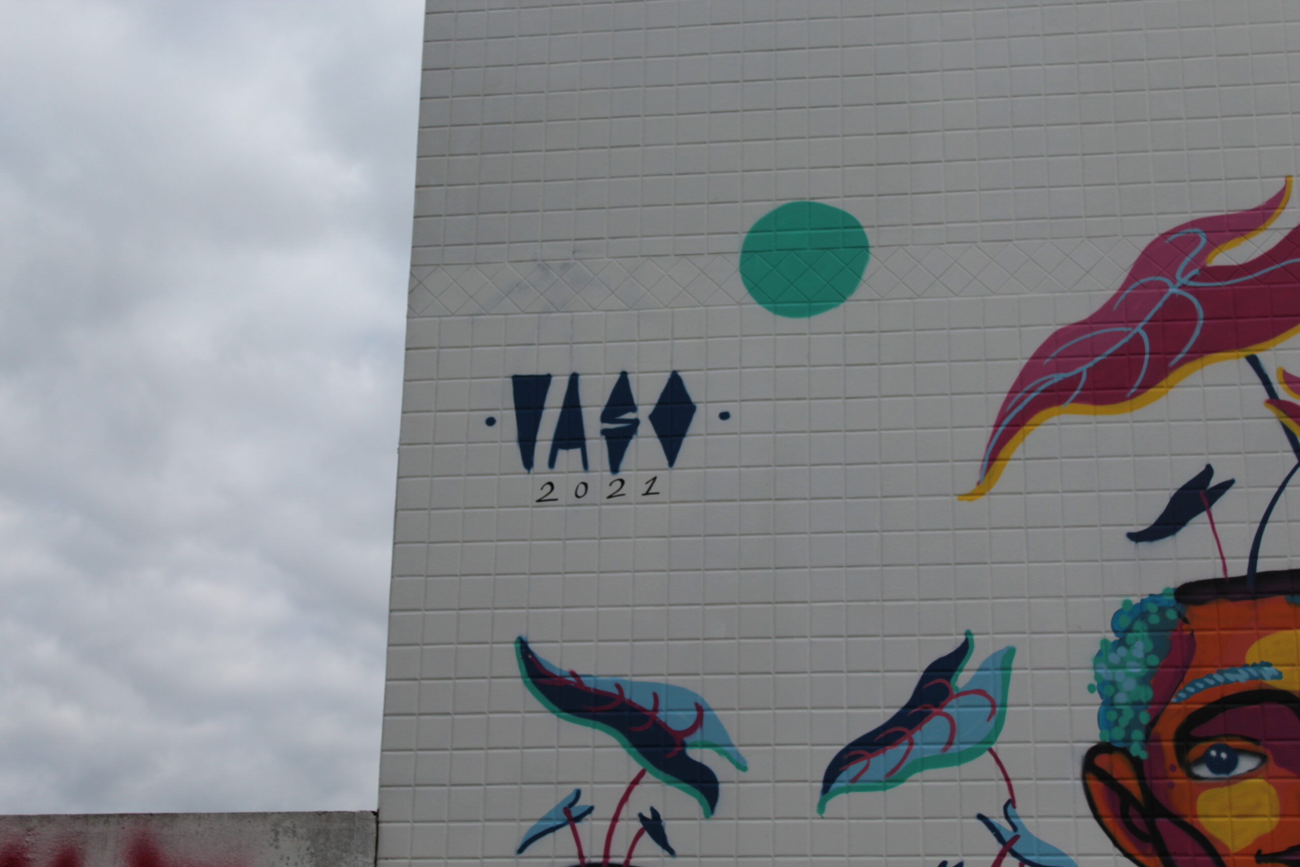 A obra representa um personagem de roupas azuis em meio a letras em estilo trow up com a escrita “Vaso”( autor da obra).