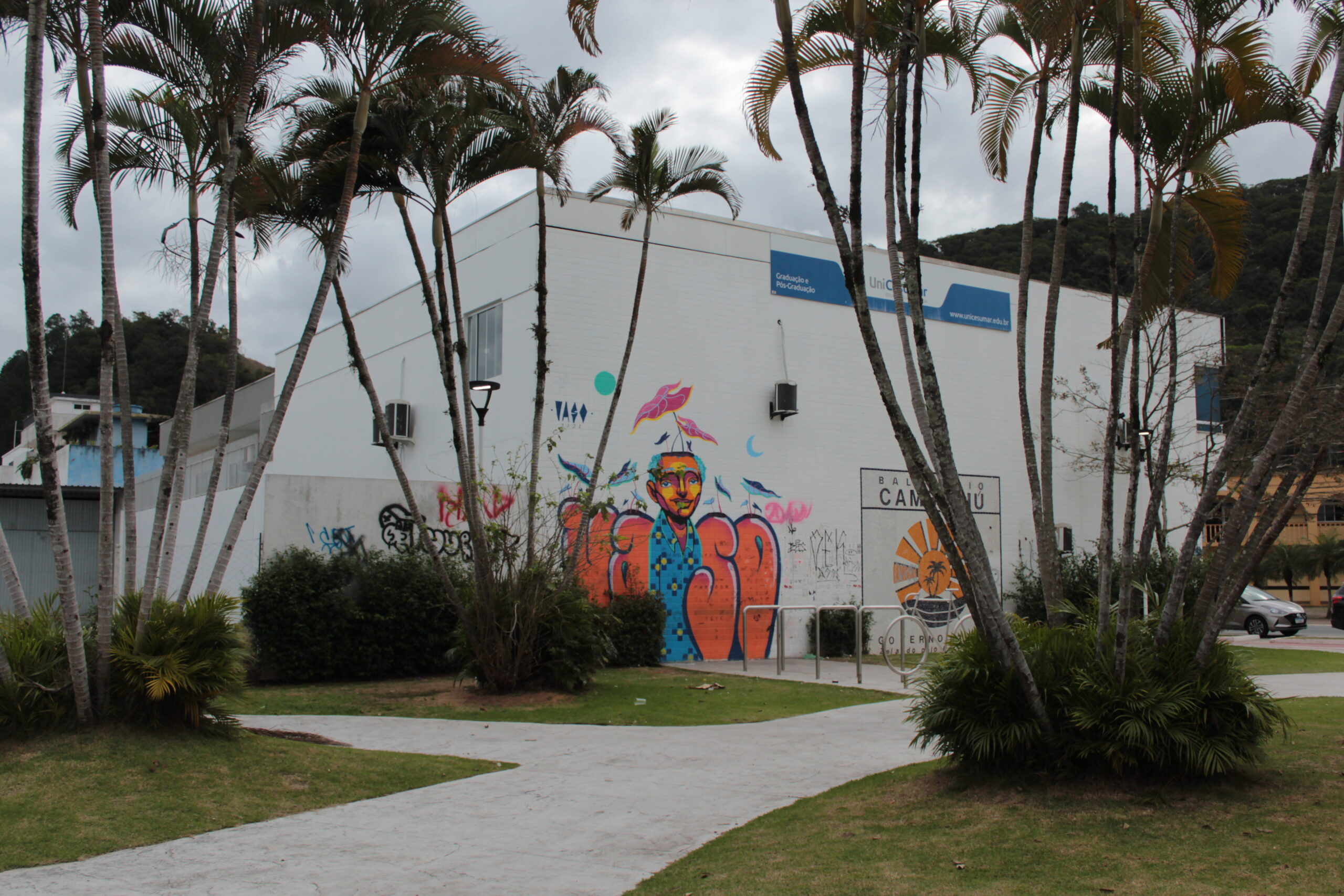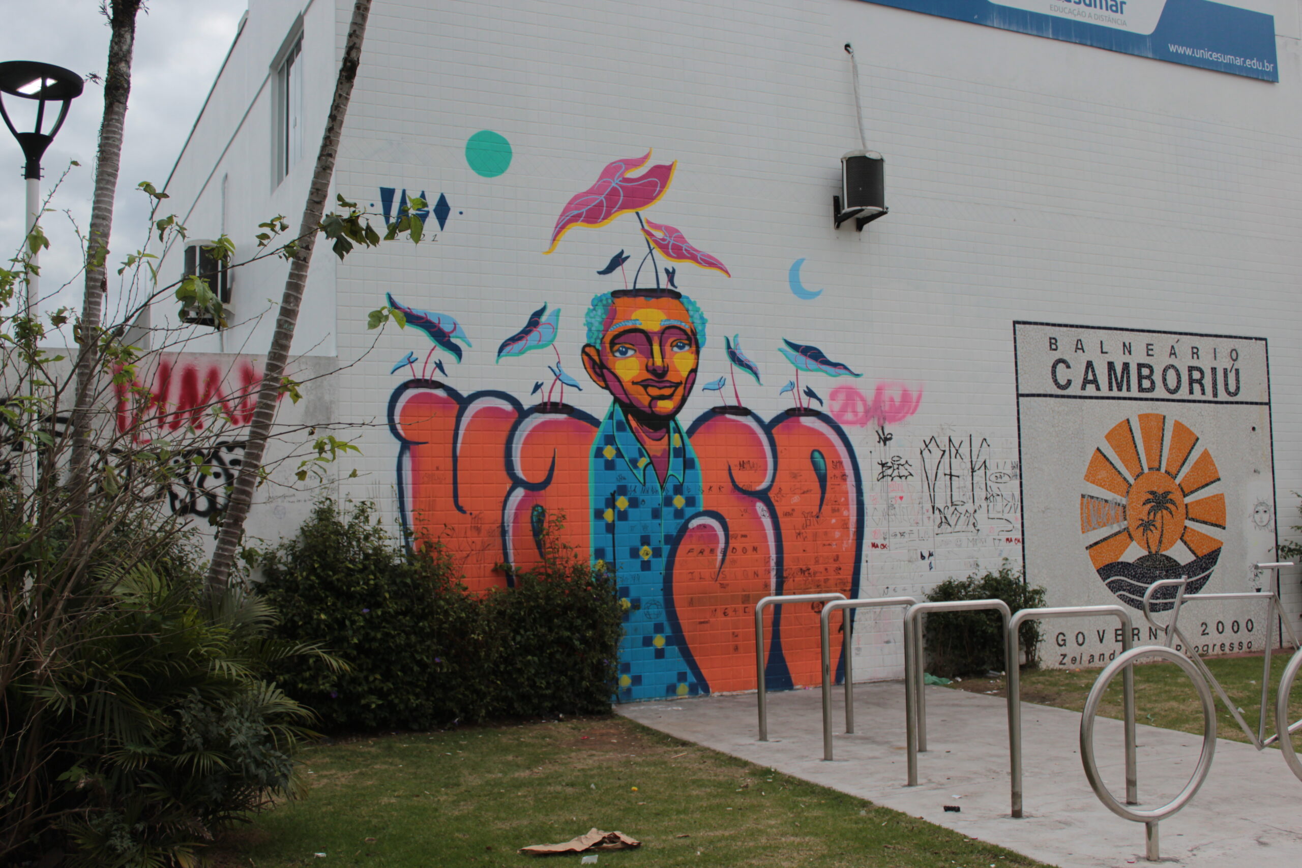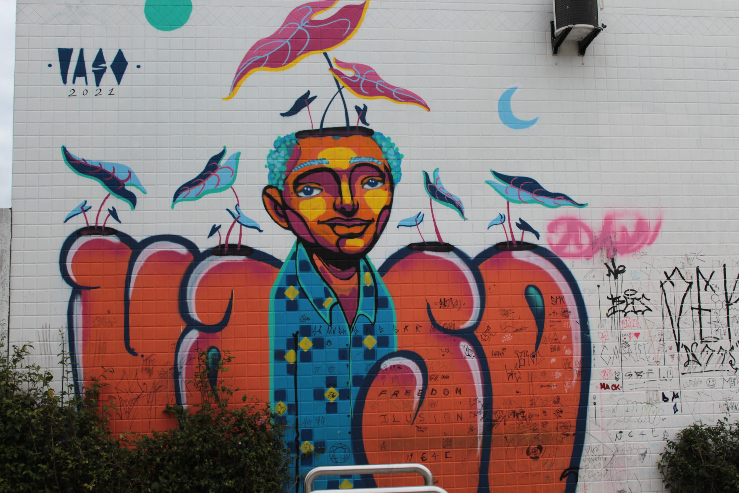A obra representa um personagem de roupas azuis em meio a letras em estilo trow up com a escrita “Vaso”( autor da obra).
