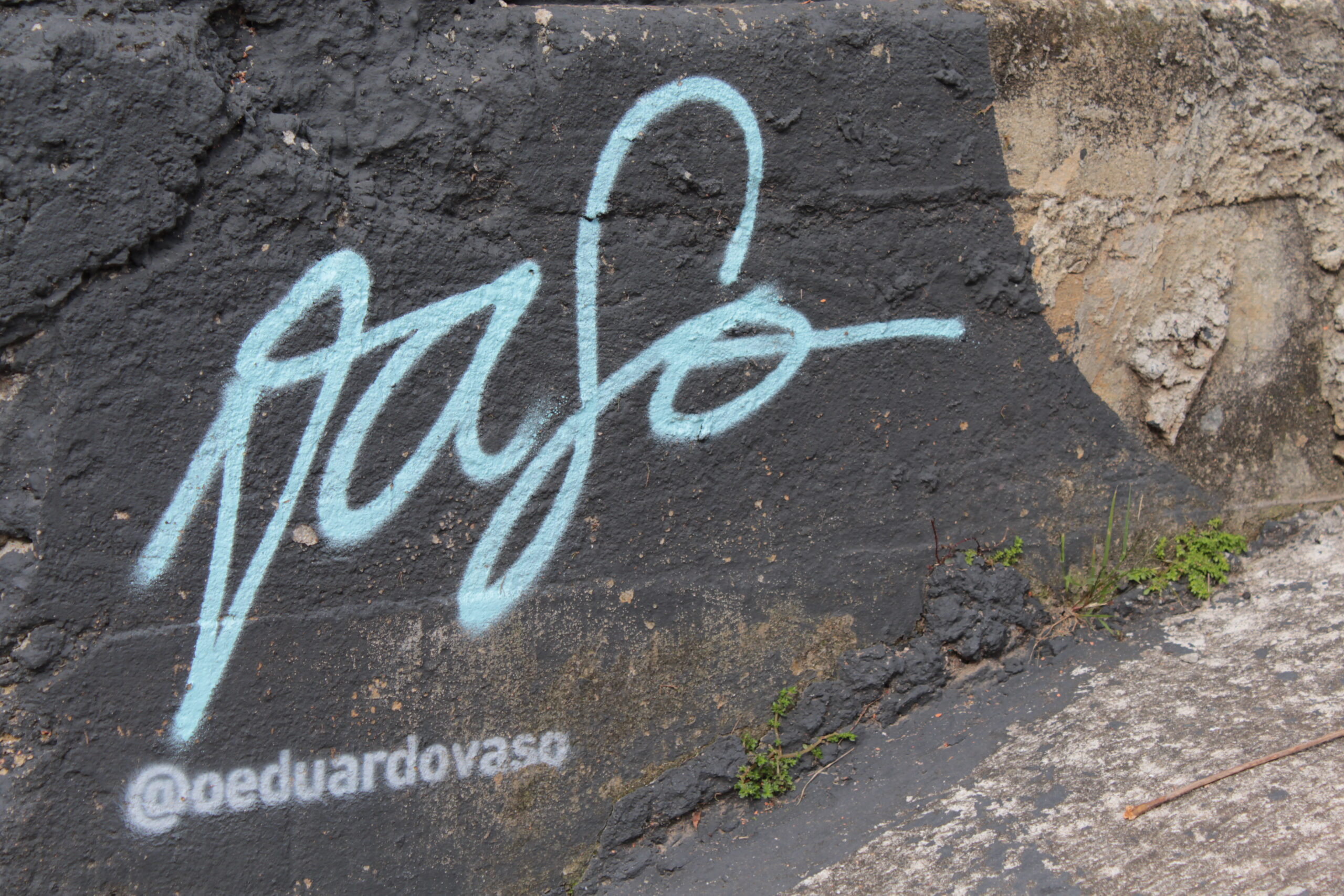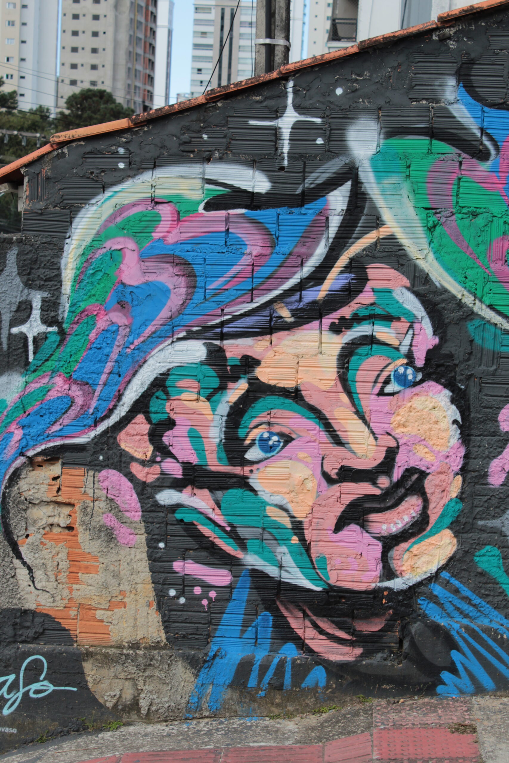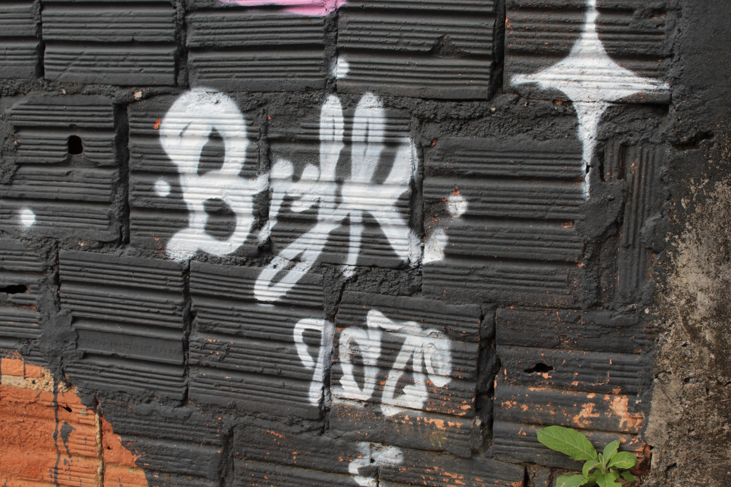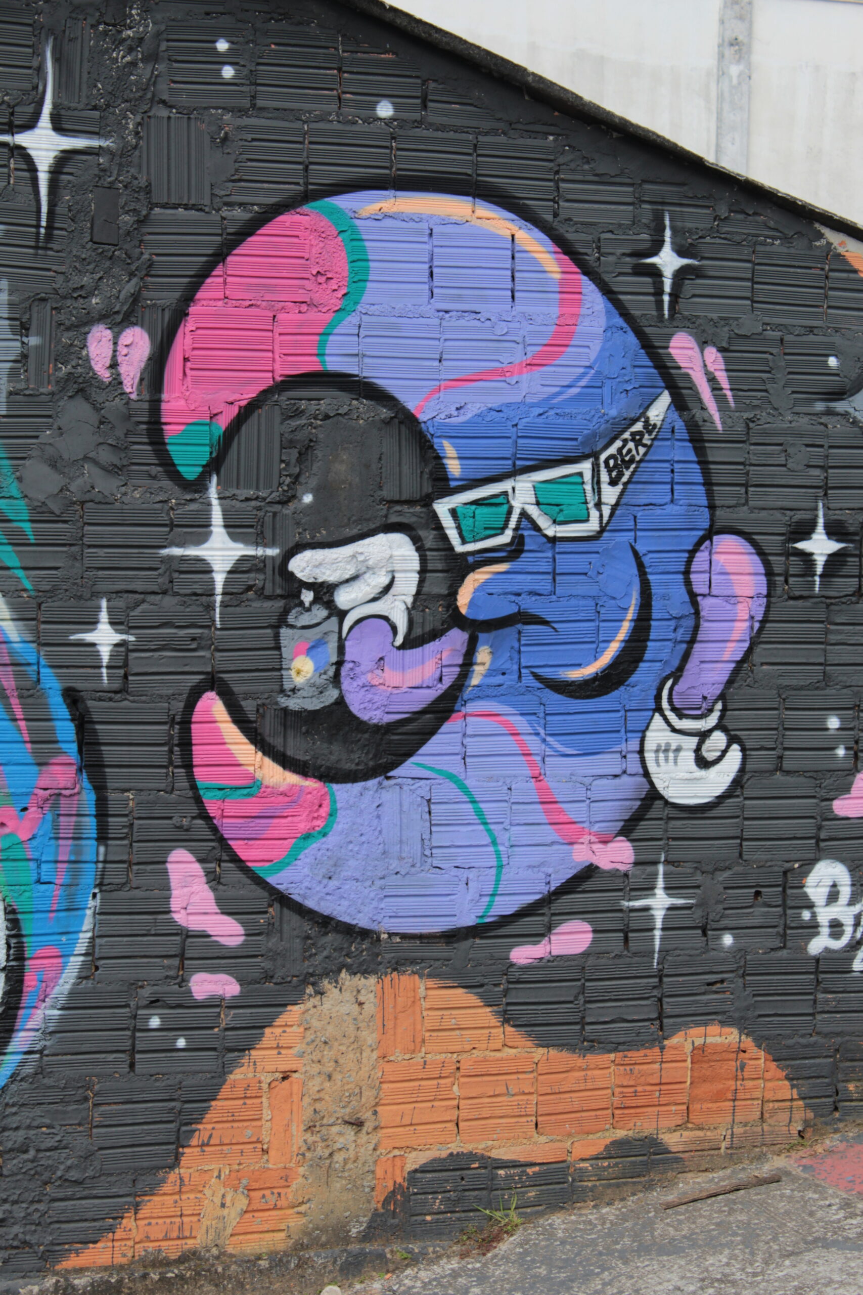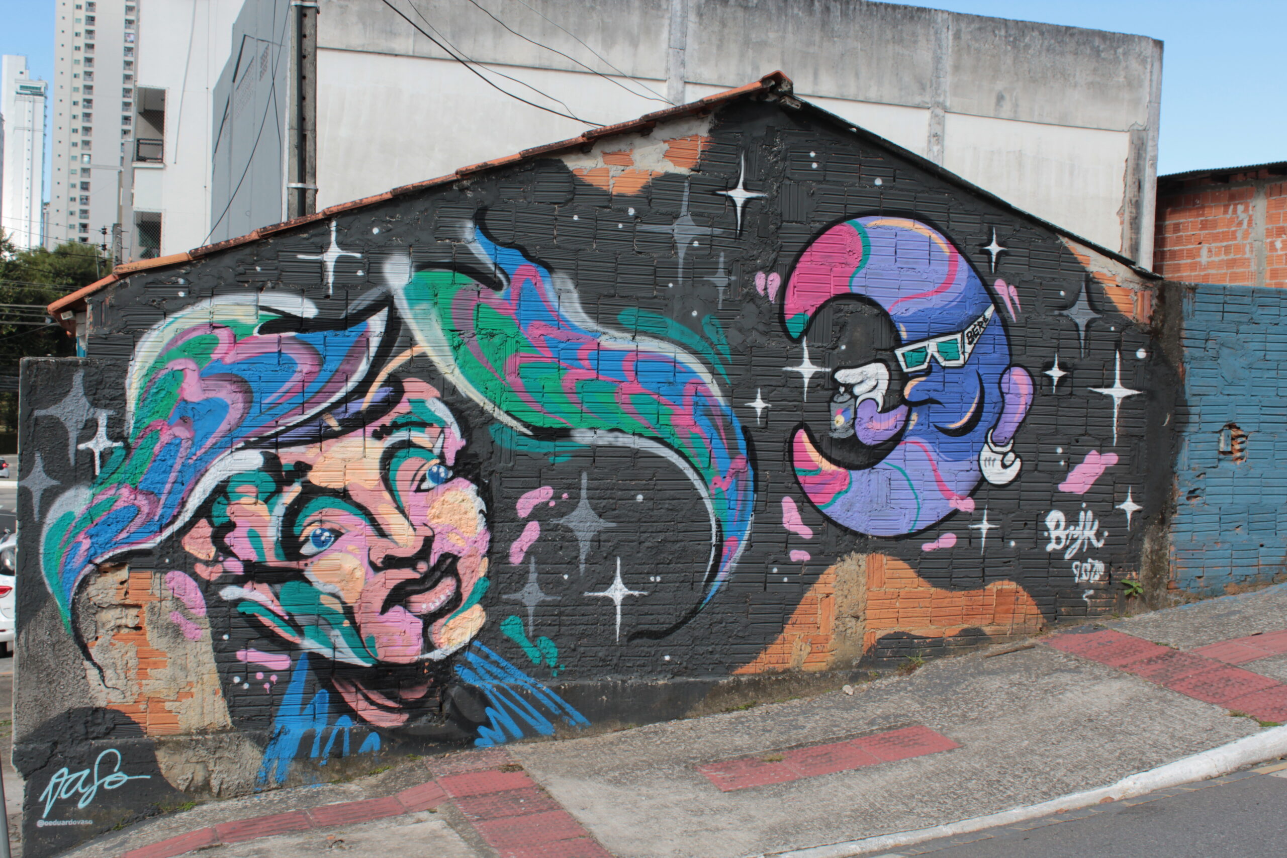 A obra tem a representação de dois personagens coloridos com uma figura abstrata ao meio sobre uma parede de tijolos com fundo preto.