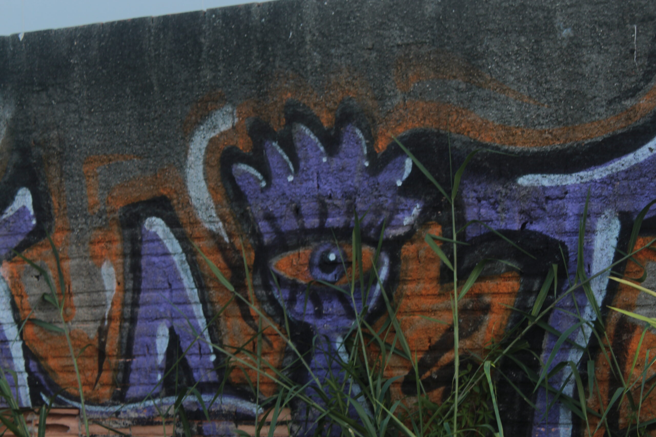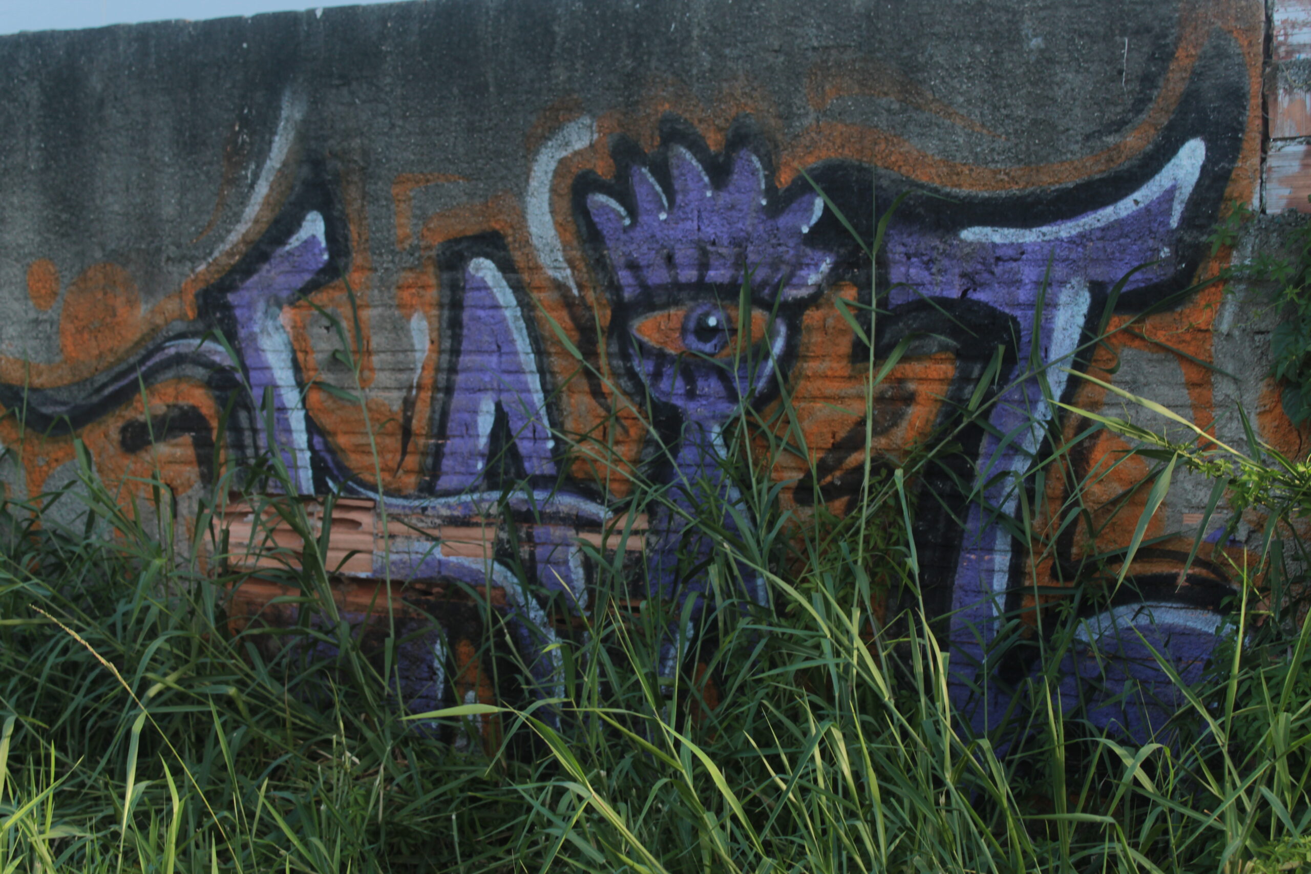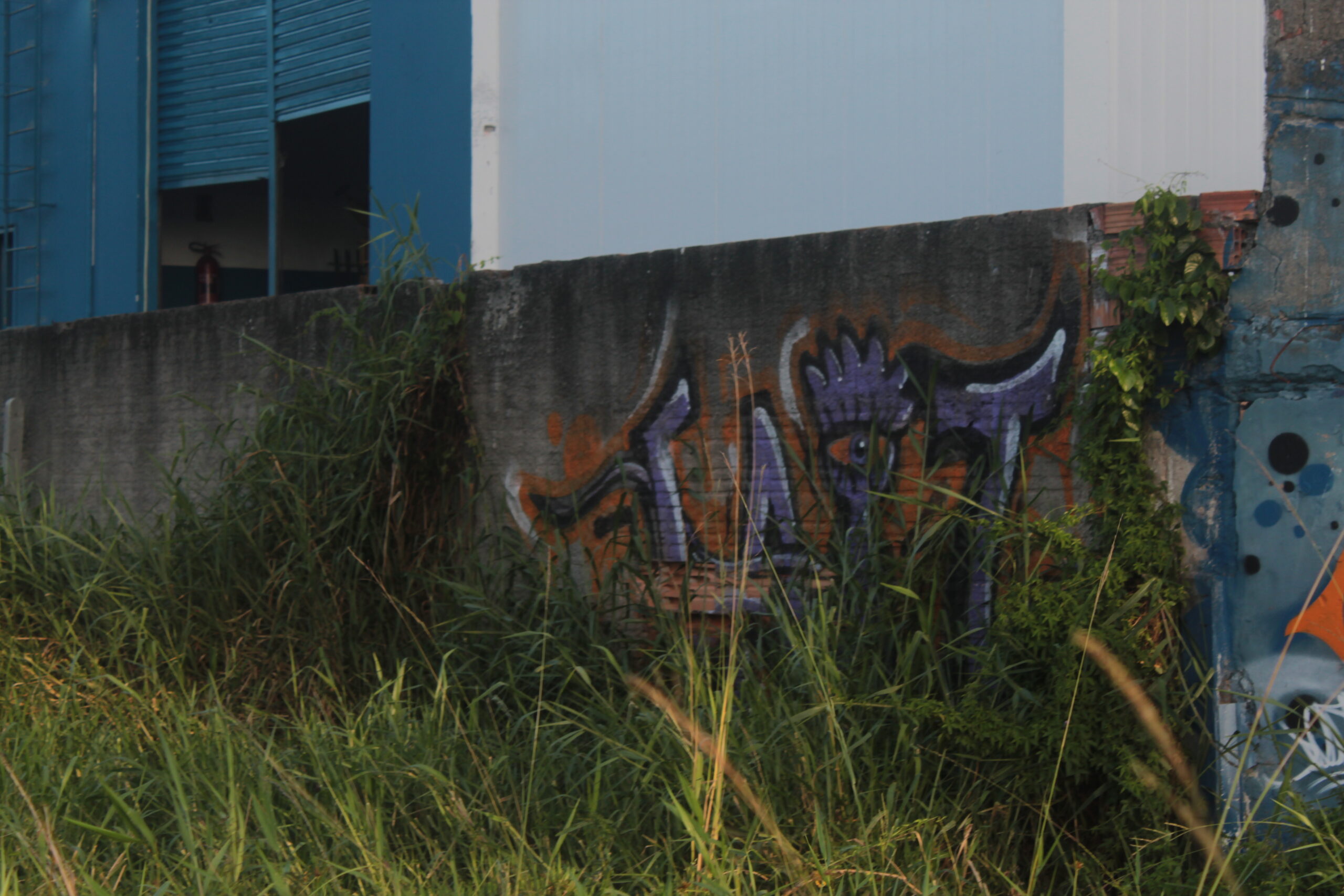 A obra representa um personagem lilás em meio as plantas sobre um muro sem reboco e sem chapisco.
