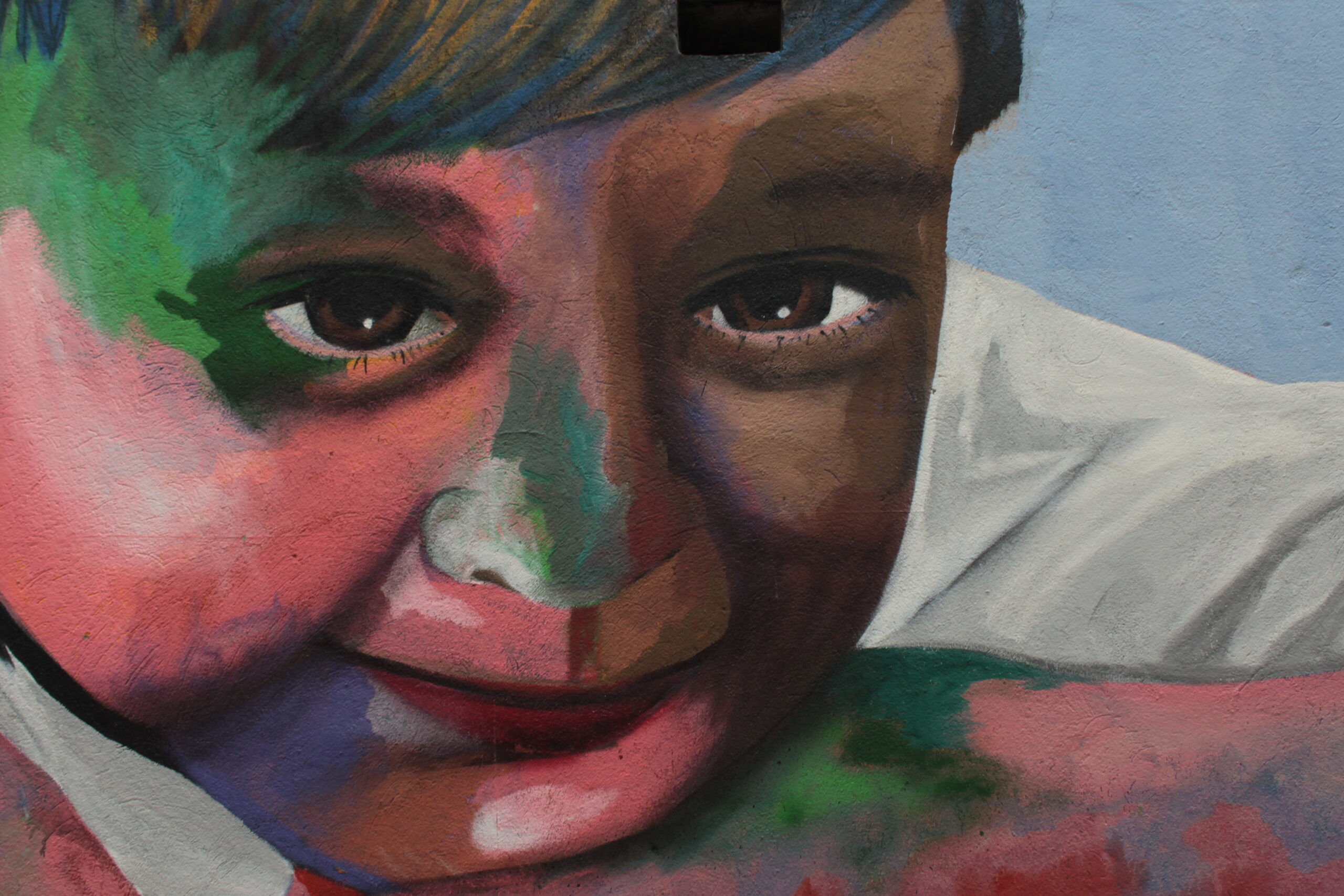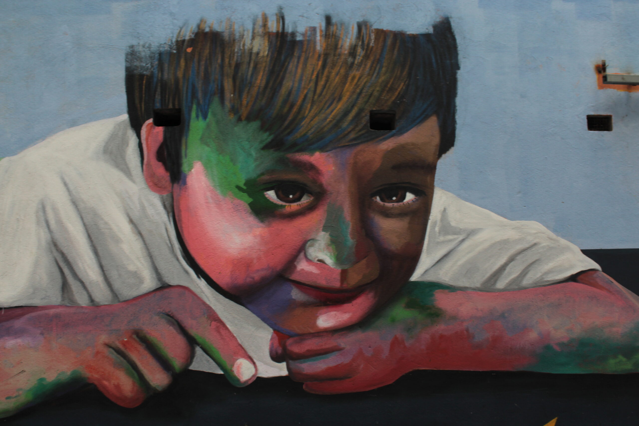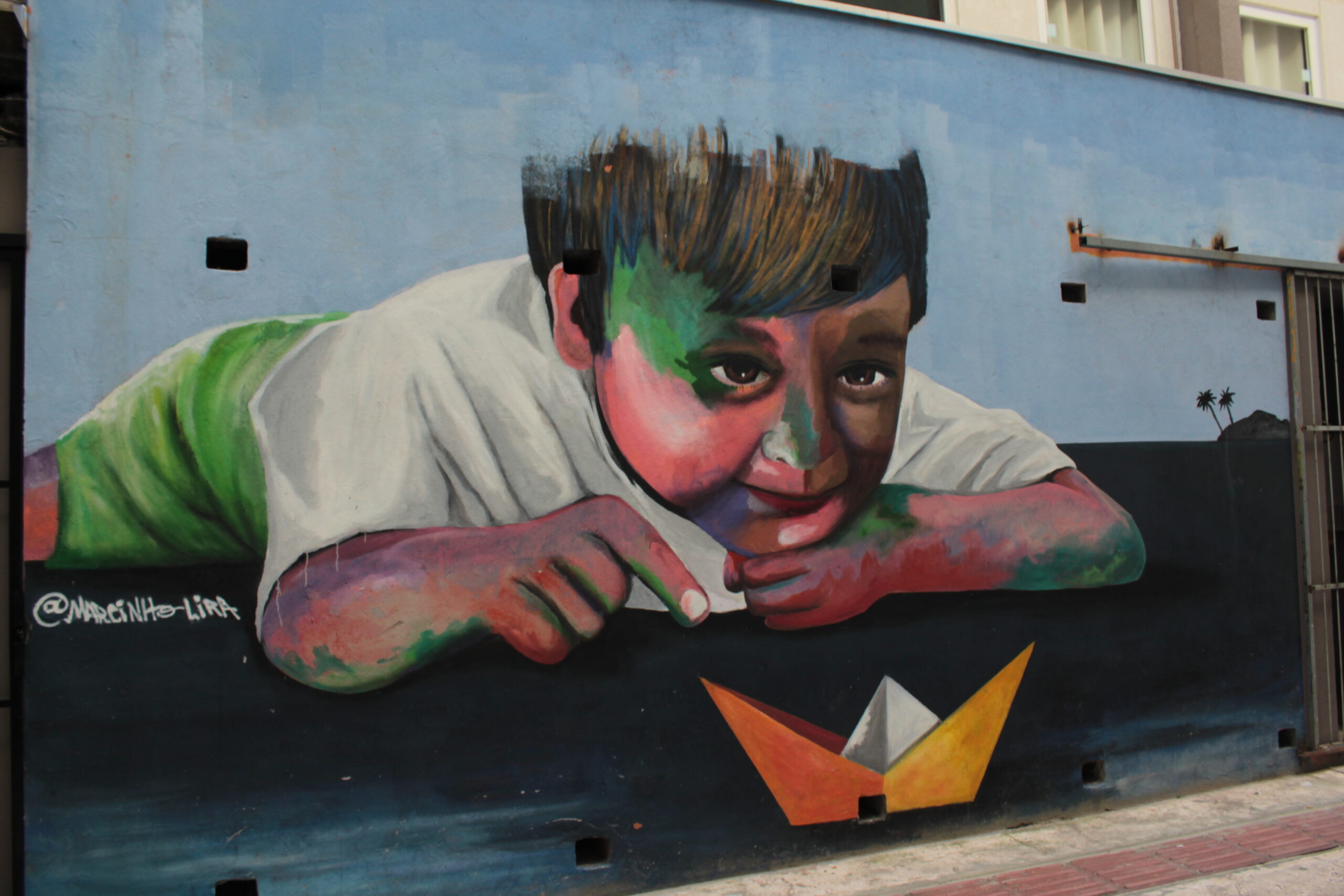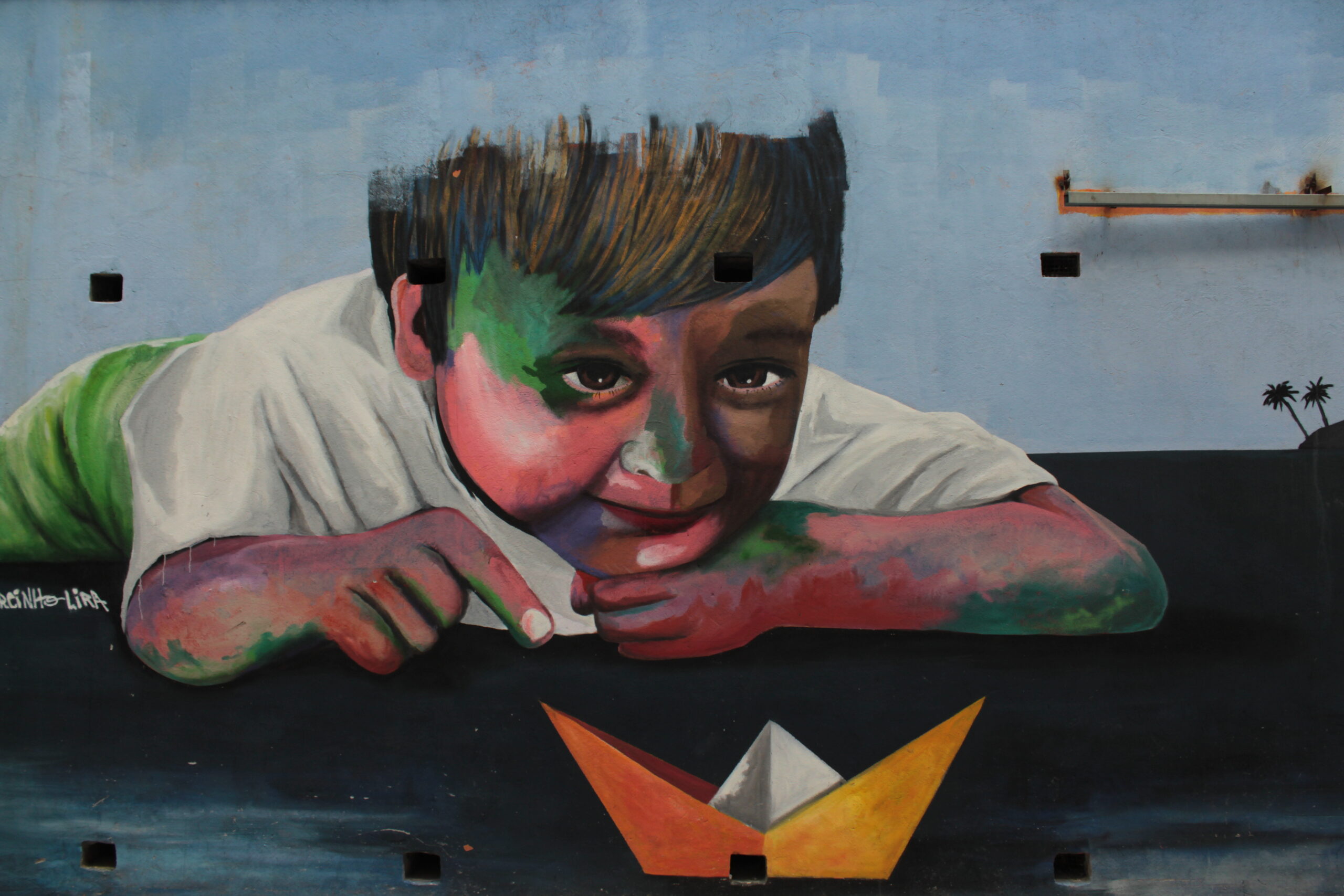 A obra representa uma criança brincando com um barquinho de papel.