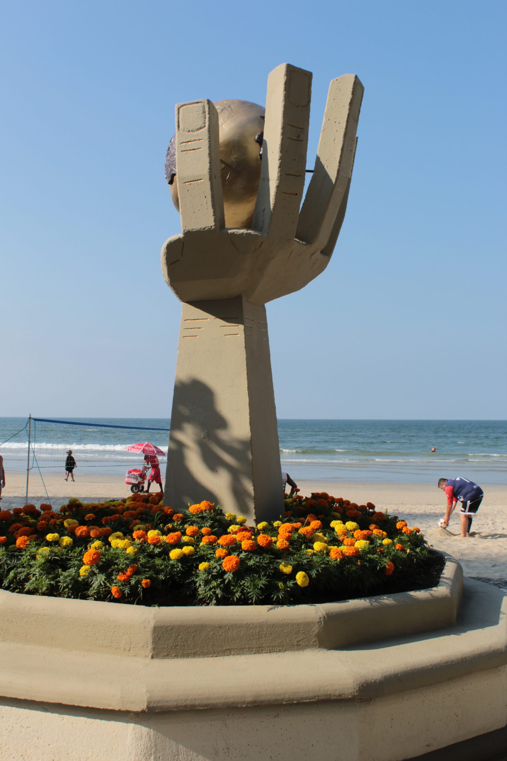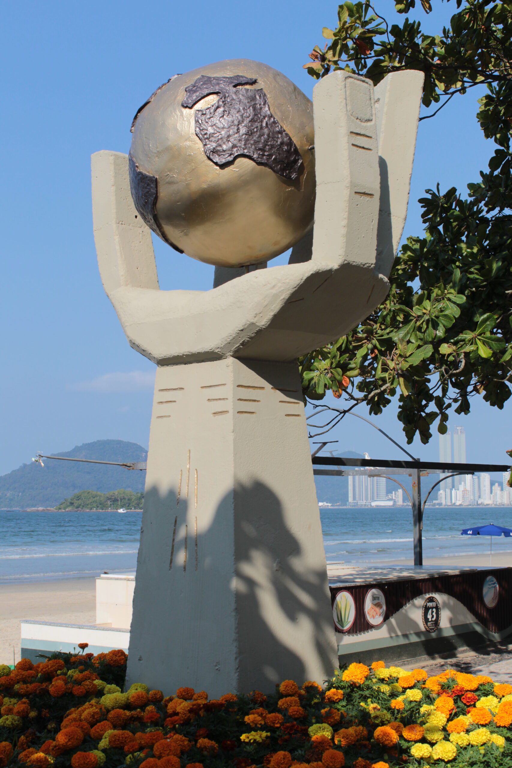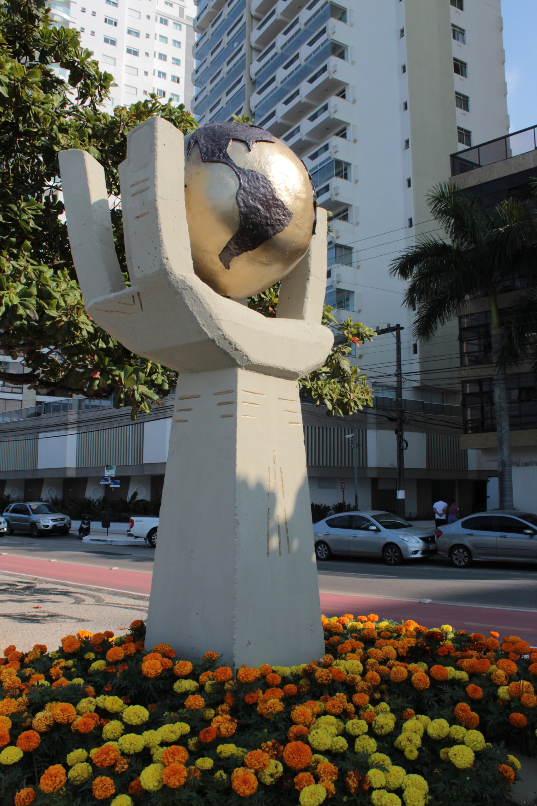 A obra representa uma mão segurando o globo terrestre e em sua base temos um jardim com flores amarelas e laranja.
