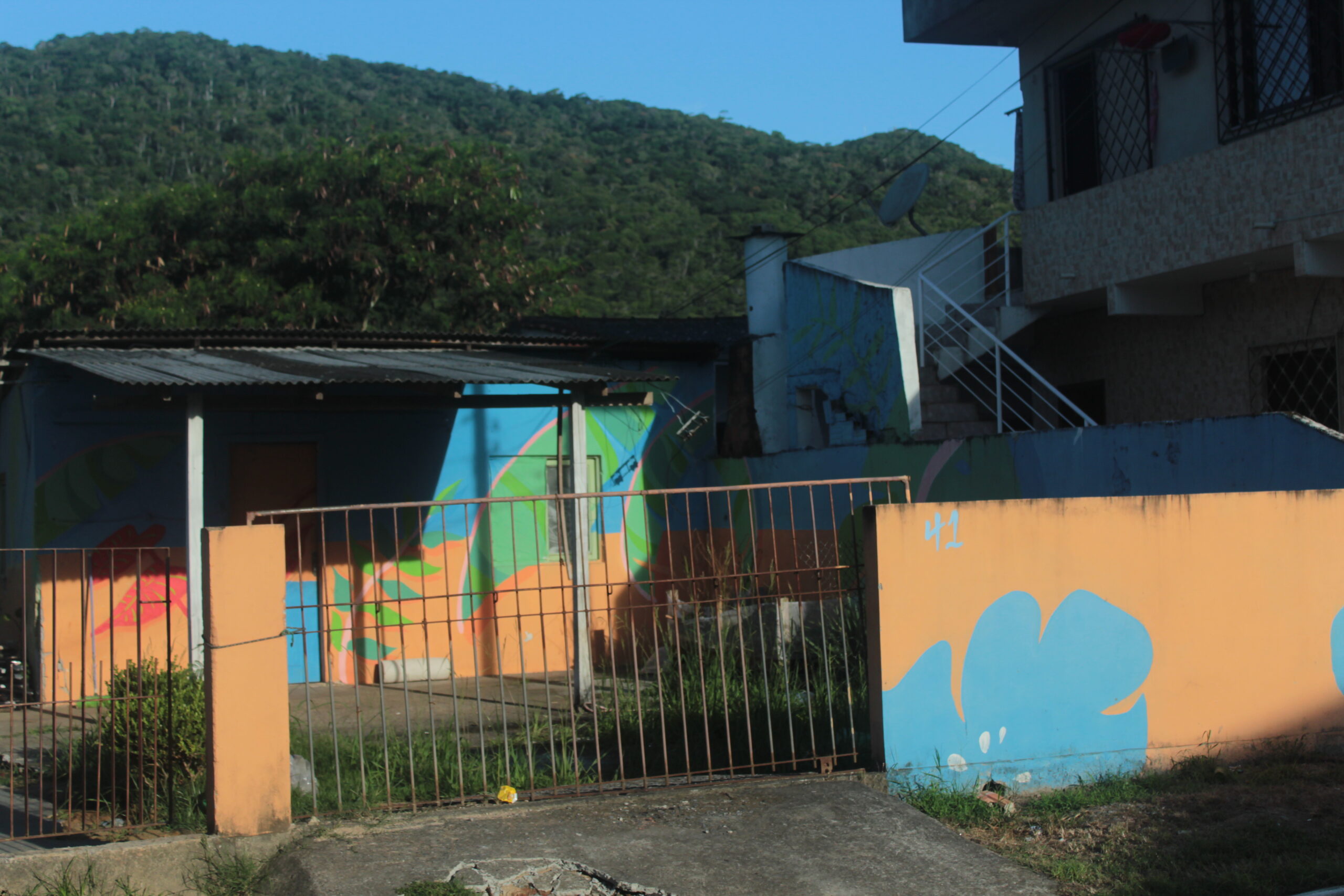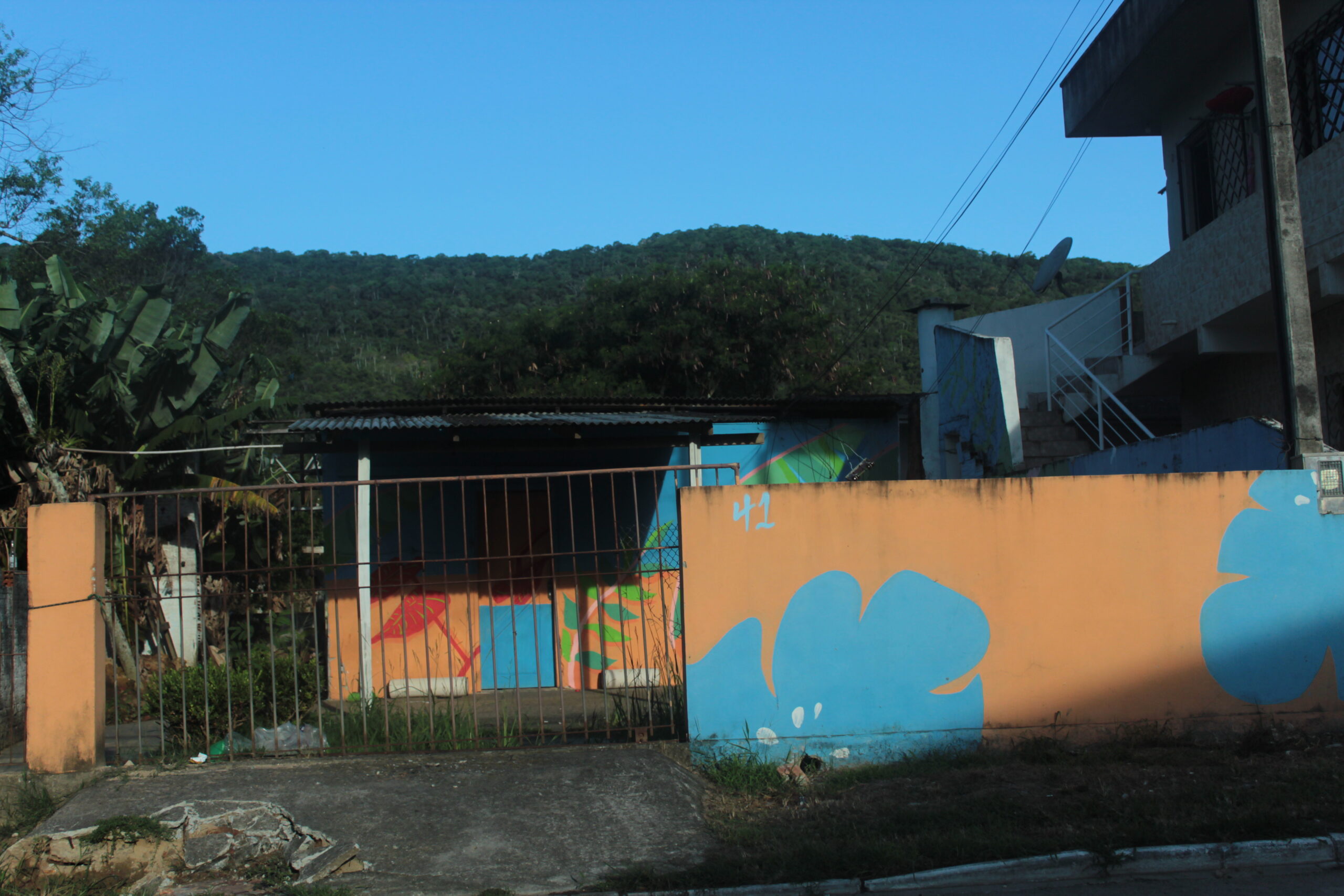 A intervenção na casa da dona Paula não foi ao acaso. Desde o início das pinturas no bairro, a moradora que sempre nos acolhei com alegria e disposição para ajudar com um cafézinho, uma boa comida ou a água necessária para pintura. Ela sempre deixou claro que poderíamos pintar na casa dela quando quiséssemos e finalmente com o recebimento das tintas enviadas pelo TDC pudemos realizar a intervenção. O objetivo inicial era deixar a casa mais parecida com a dona Paula, que remetesse à alegria e o sorriso em viver. Reunimos uma equipe composta pelo artista Fernando dos Santos, membro da equipe artística da passarela da Barra, o Bere, Luis Felipe Berejuk, e o grupo de voluntários do laboratório de criatividade da UNIVALI e propomos a pintura de elementos da natureza, com cores alegres que deixassem o dia a dia da Paula, do seu marido e de seu neto mais agradável. Desde de a intervenção sempre somos parados por algum dos moradores da casa quando passamos em frente e recebemos agradecimentos que sabemos que vem do coração.”(O.S.G.)