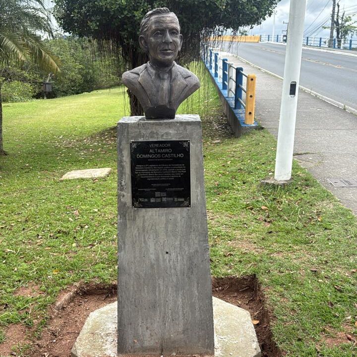 Escultura em formato de Busto, baseado em registros de fotografias do homenageado, representando a figura histórica do Vereador Altamiro Domingo Castilho.