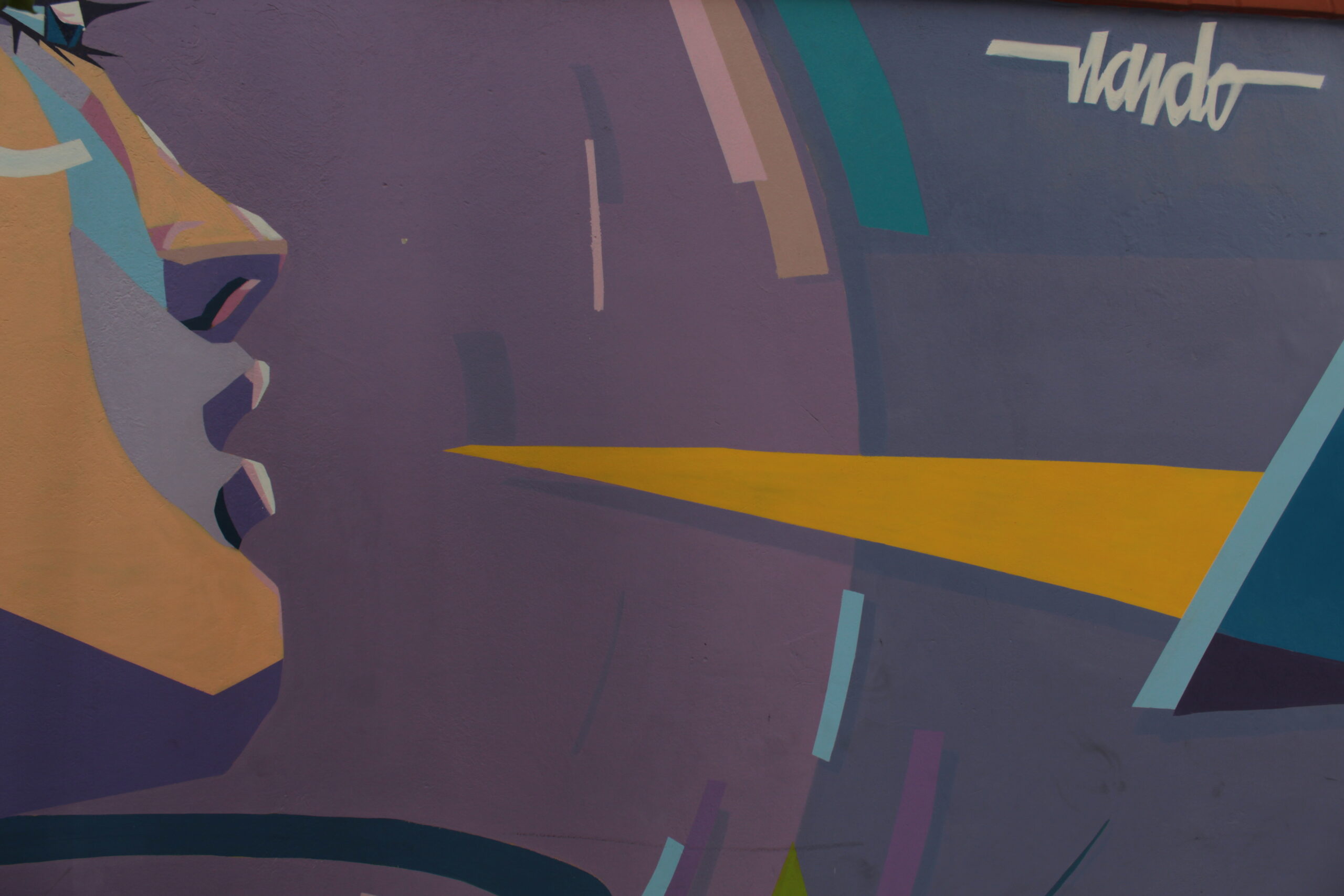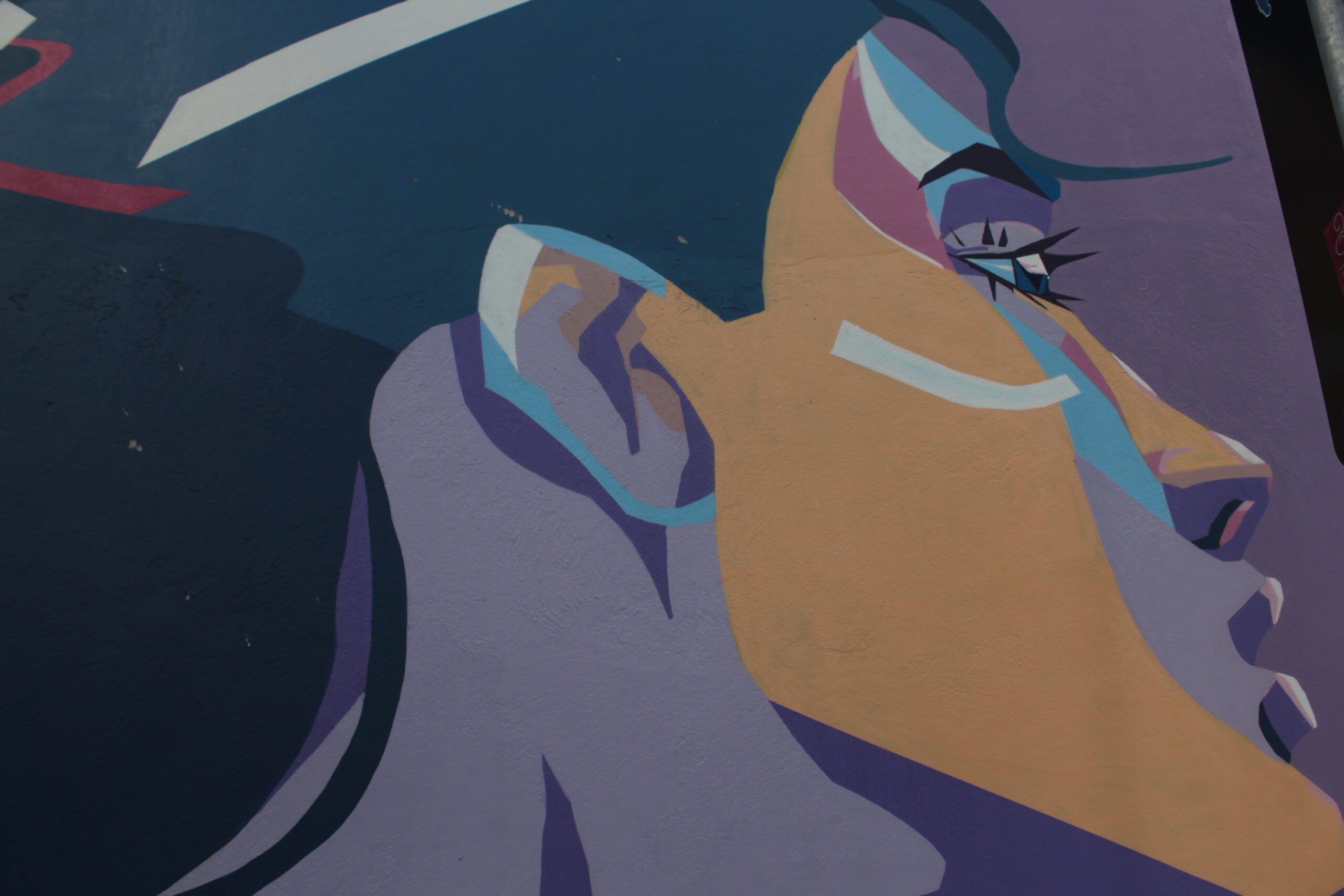 A obra representa uma figura feminina de perfil sobre um fundo de cores em tons de azul e lilás.