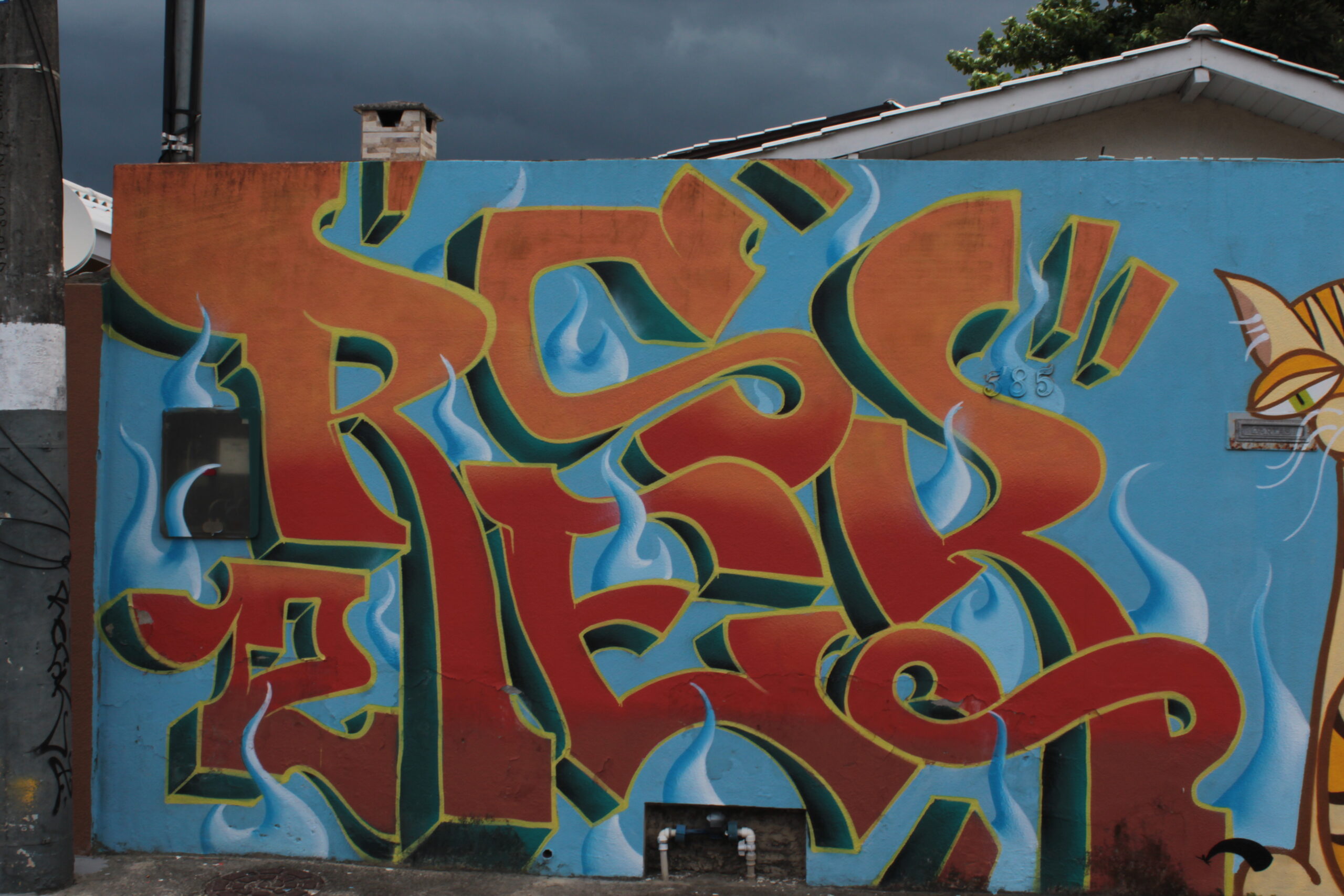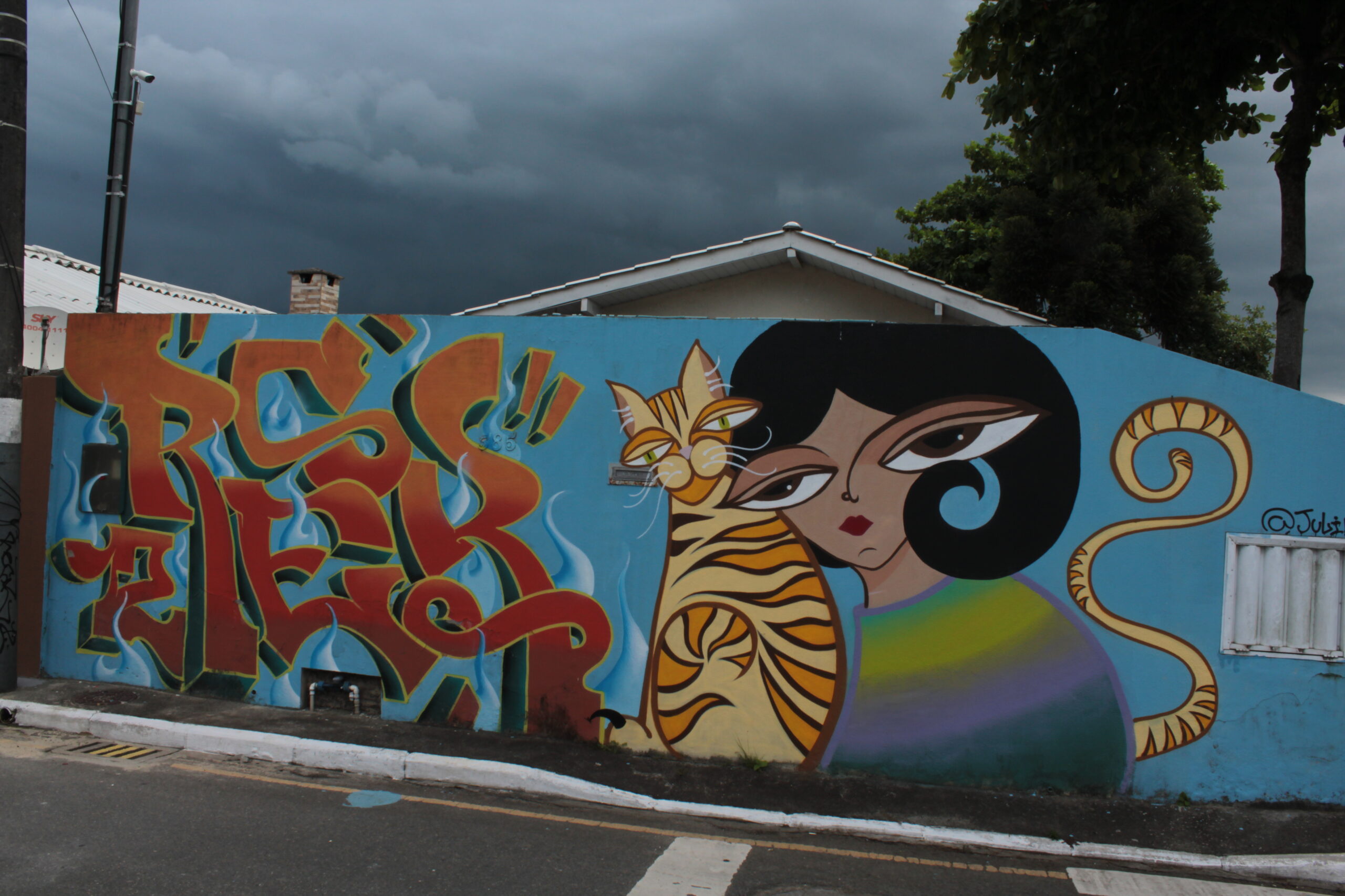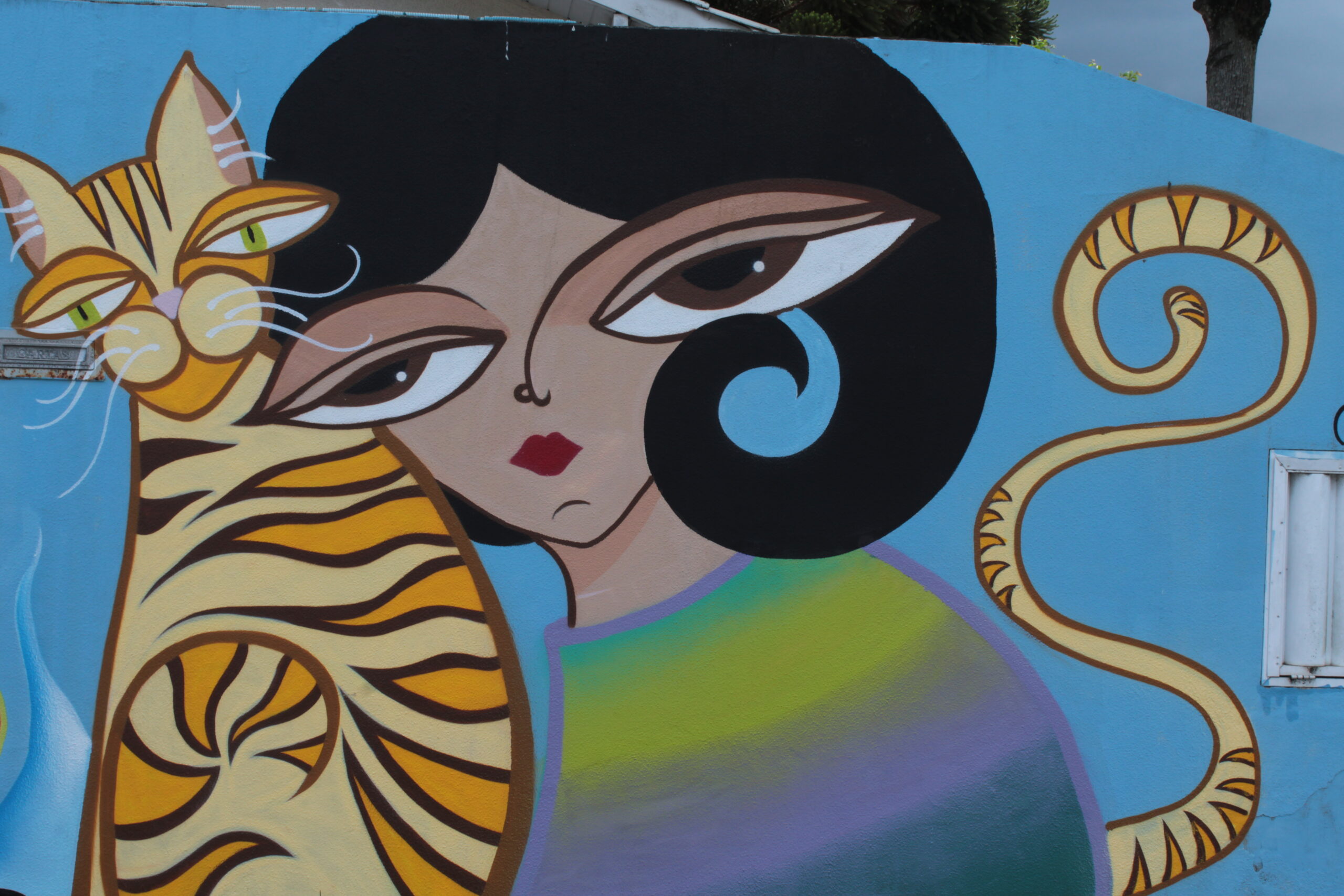 A obra representa uma personagem feminina com um gato à direita, e, a esquerda letras coloridas em tons de vermelho e laranja com o fundo azul.