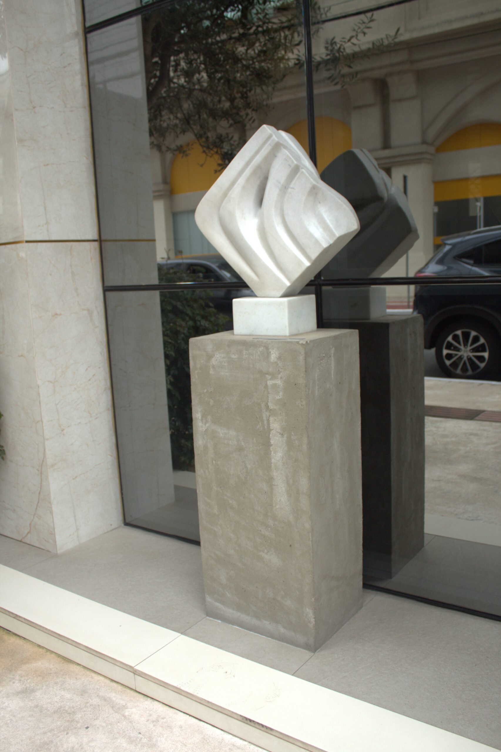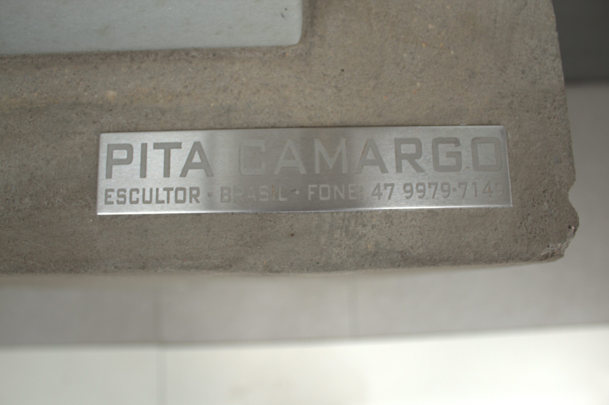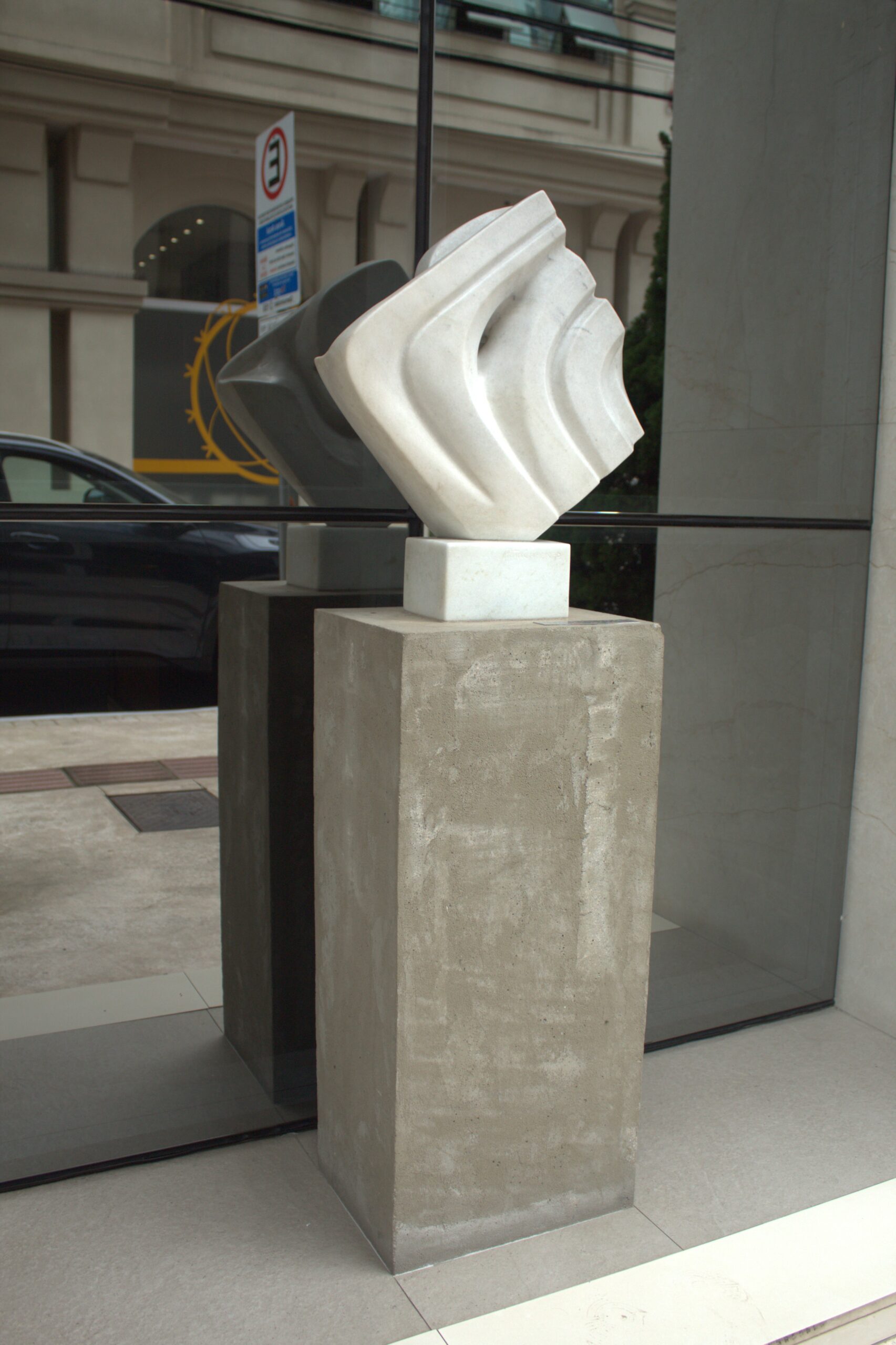 A obra é uma escultura de cor predominante branca com uma base longa na cor cinza.