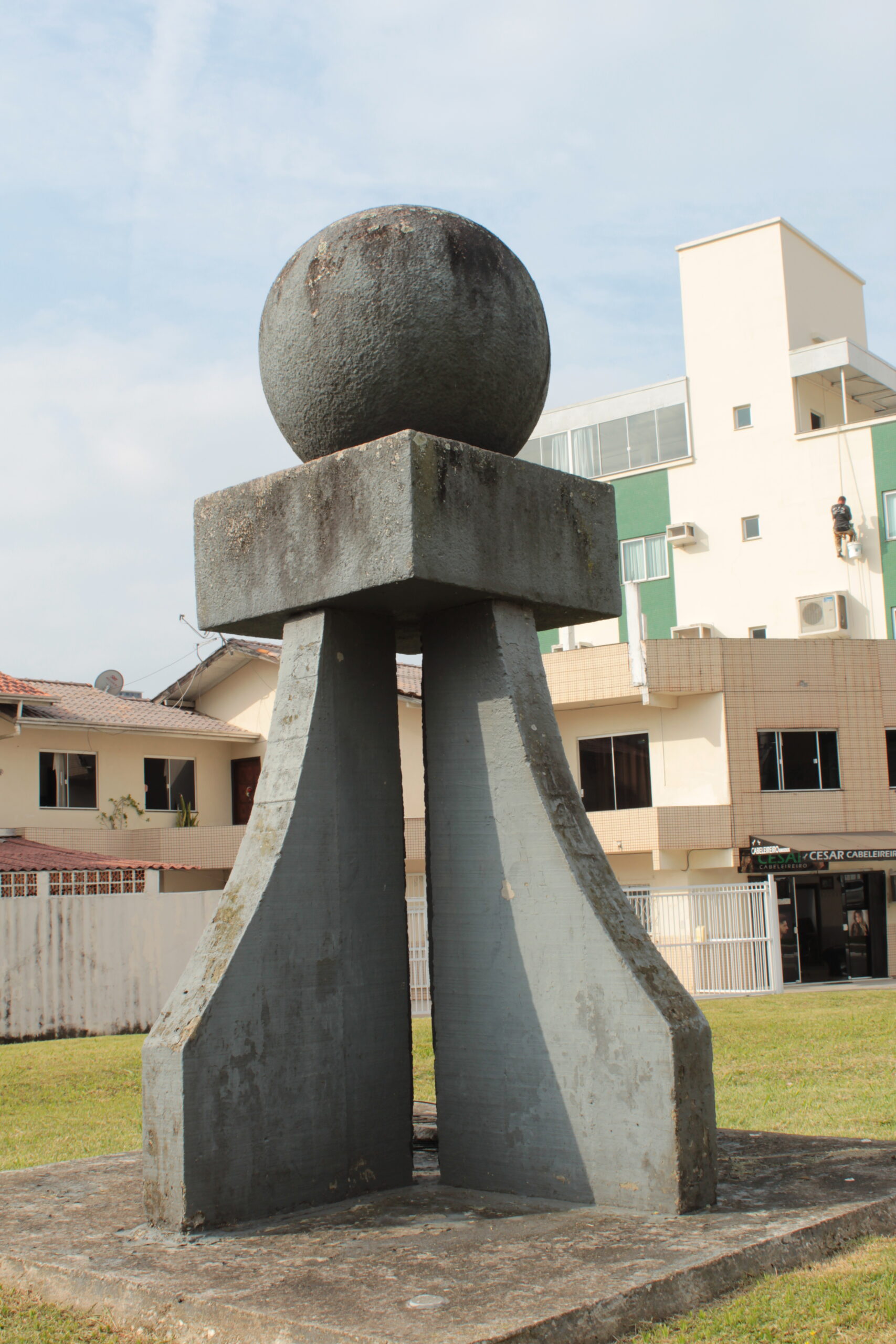 A obra representa um globo cinza em cima de uma base de mesma cor predominante.