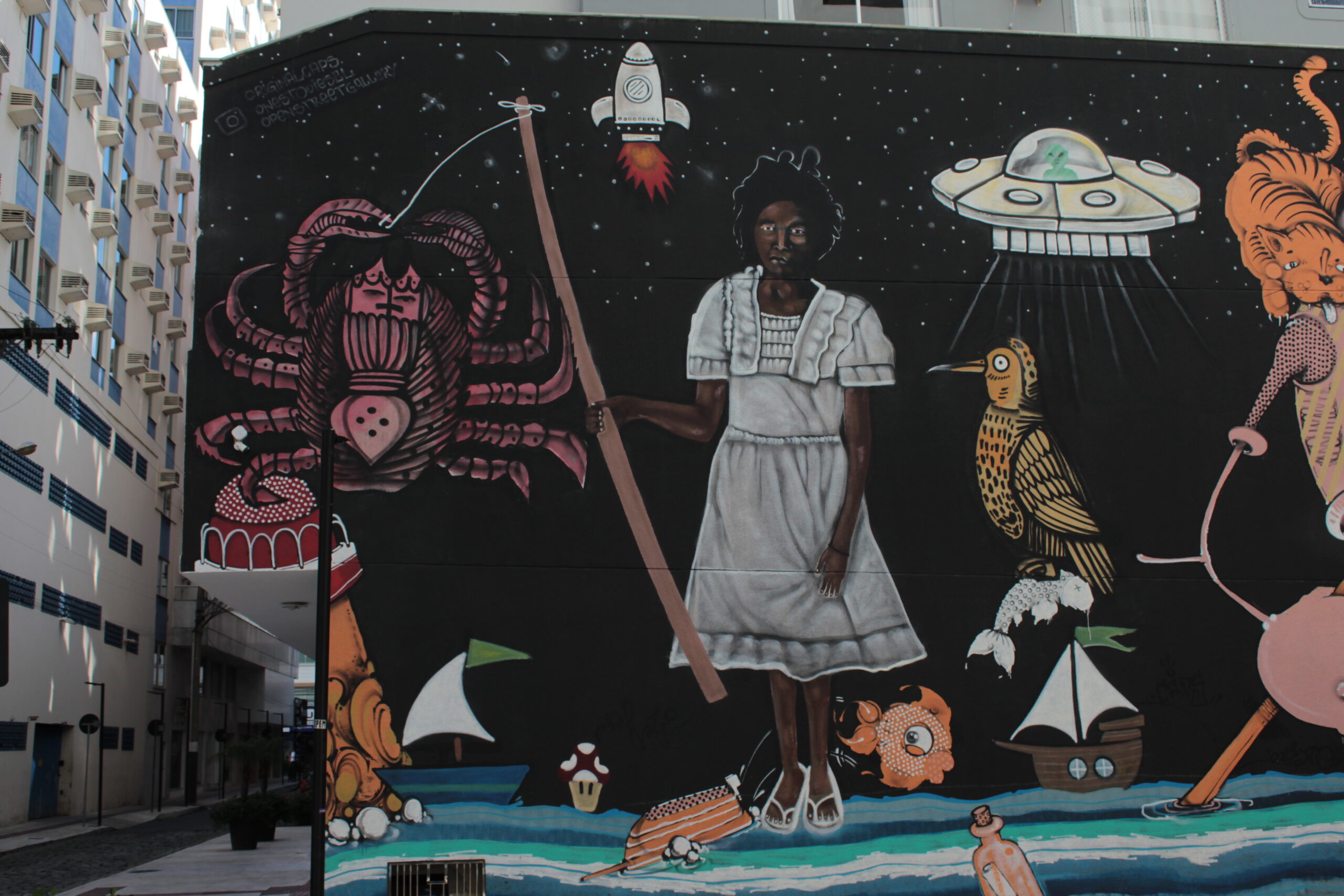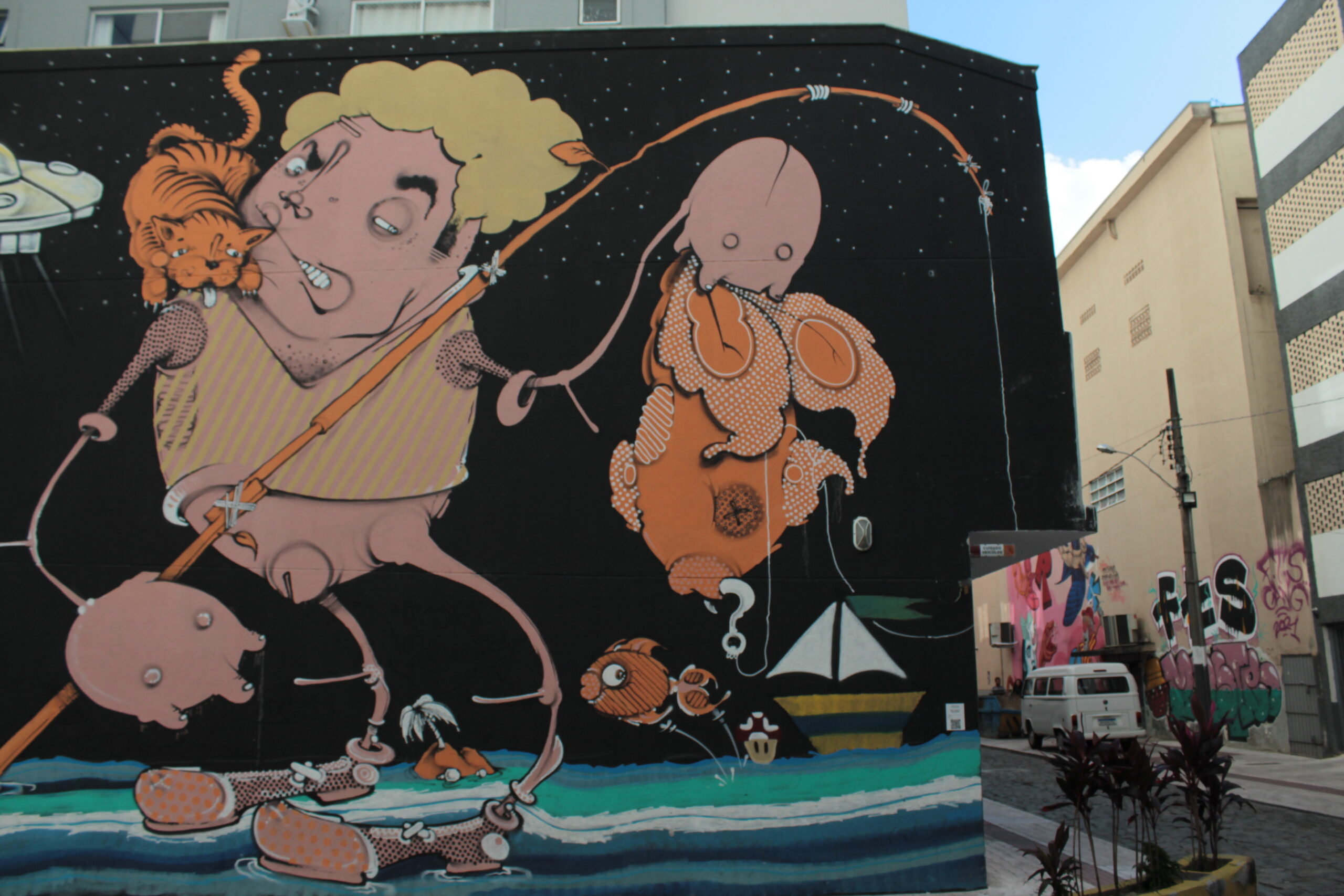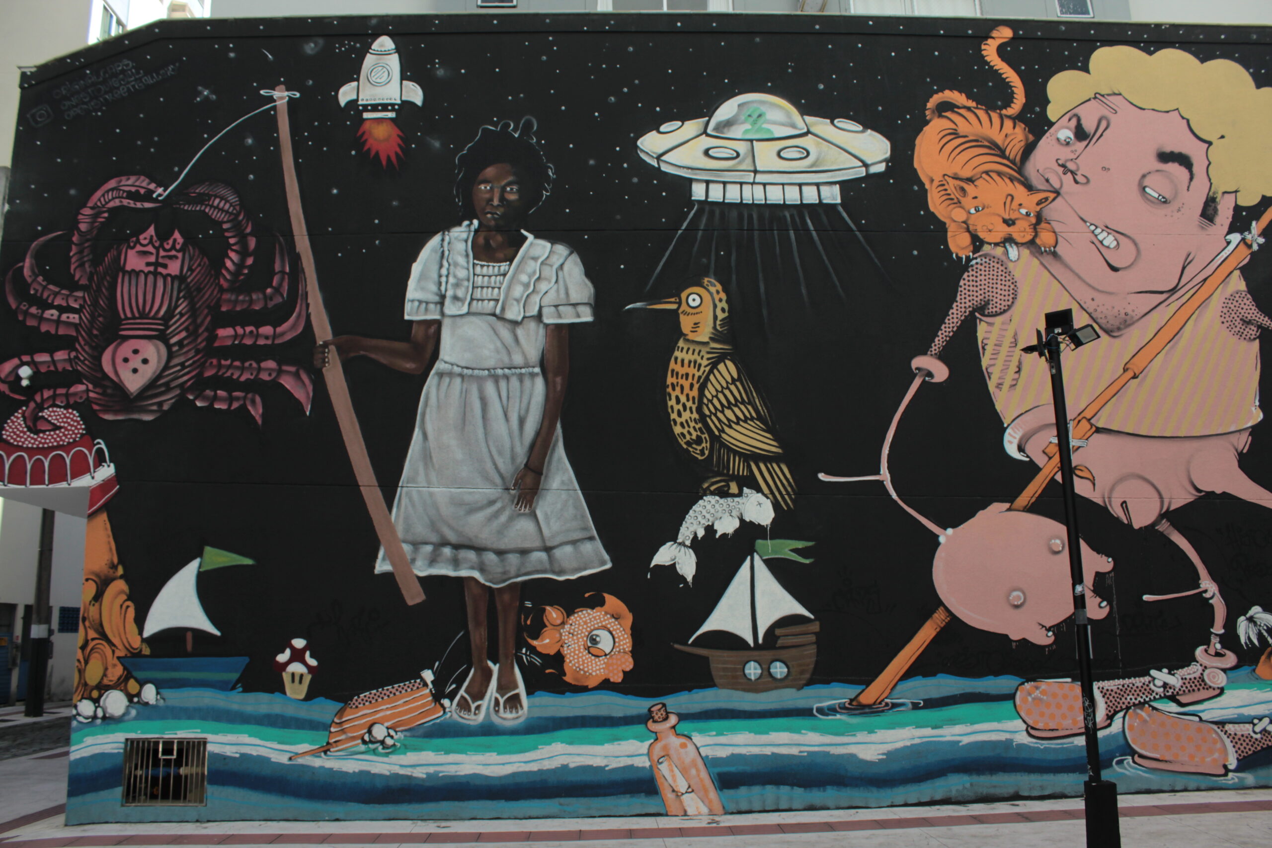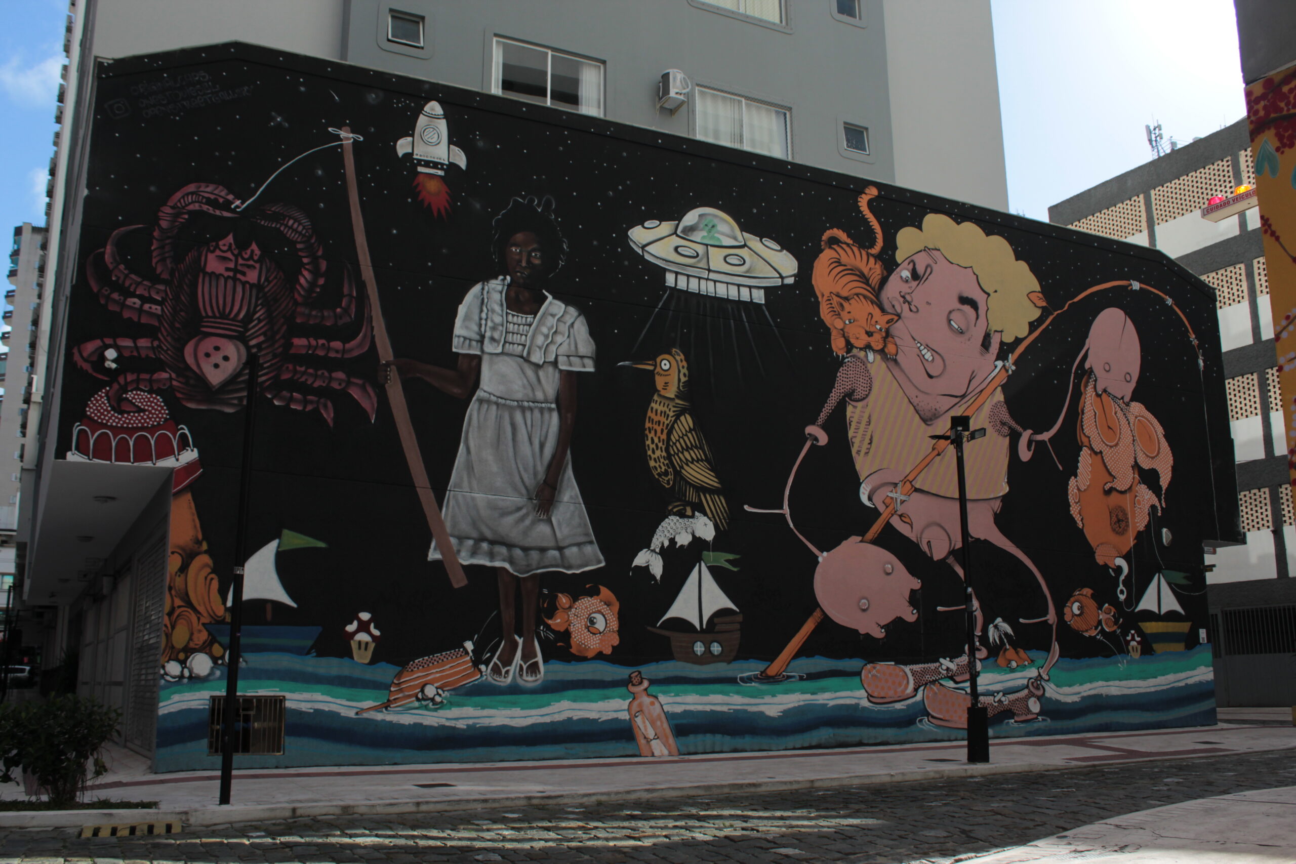 A obra representa vários personagens desenhados sobre um fundo preto, interagindo entre si, estimulando a imaginação de quem os vê, fazendo jus ao título da arte: “Histórias de pescador”.