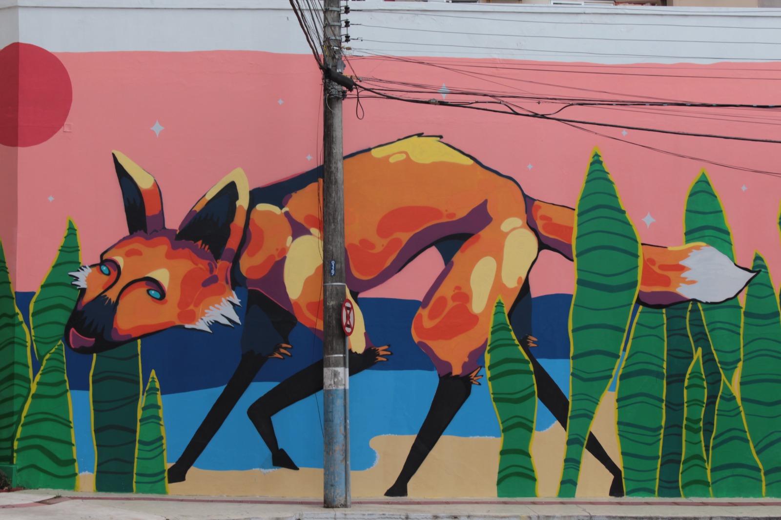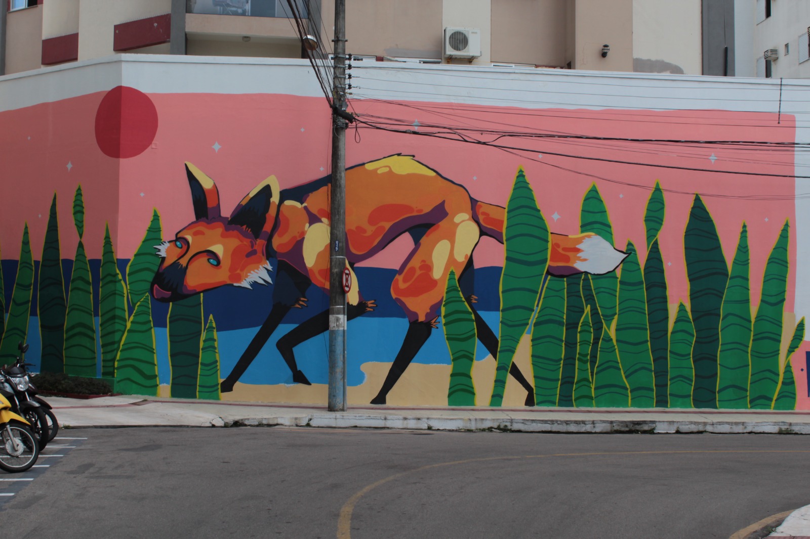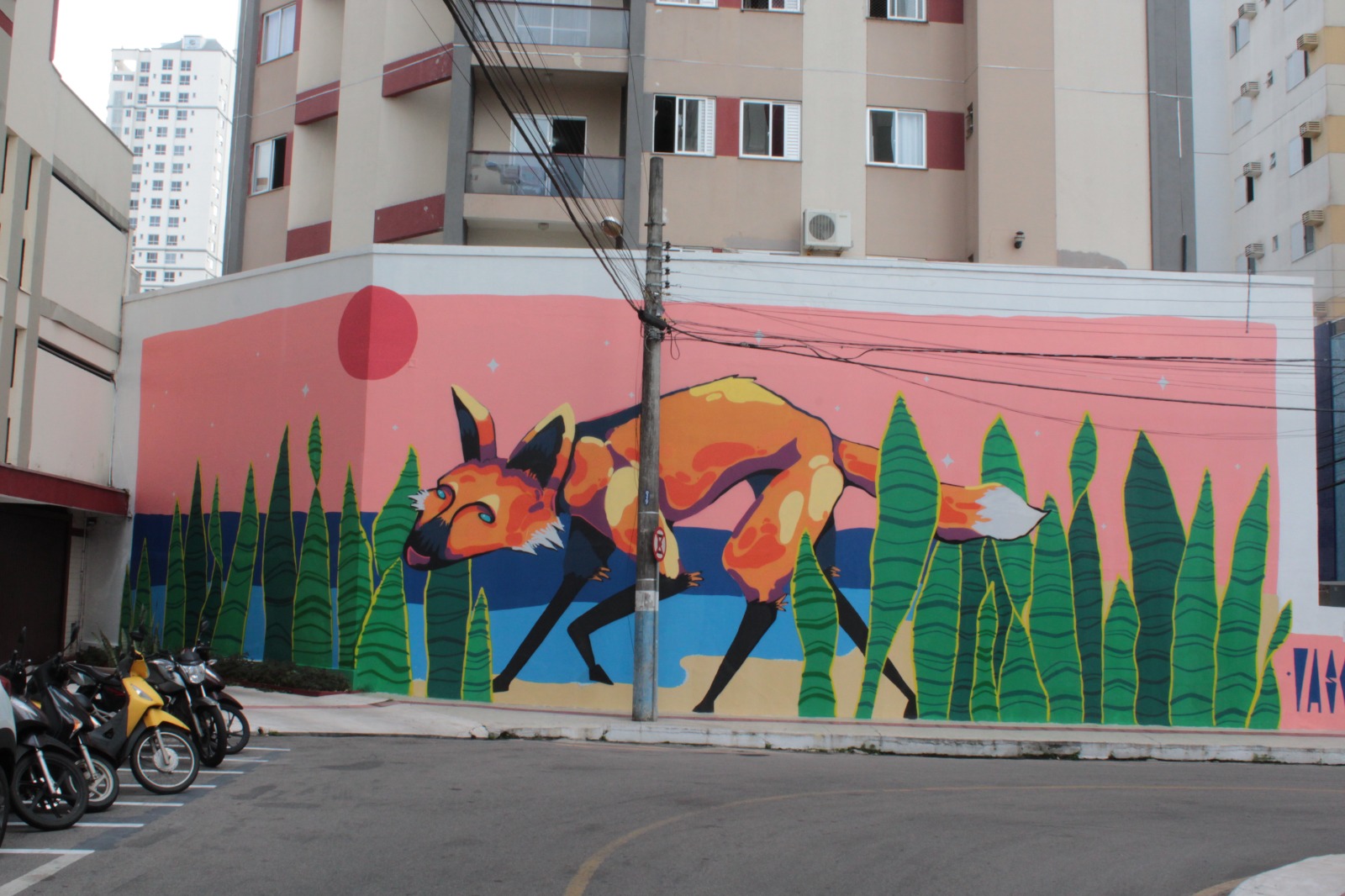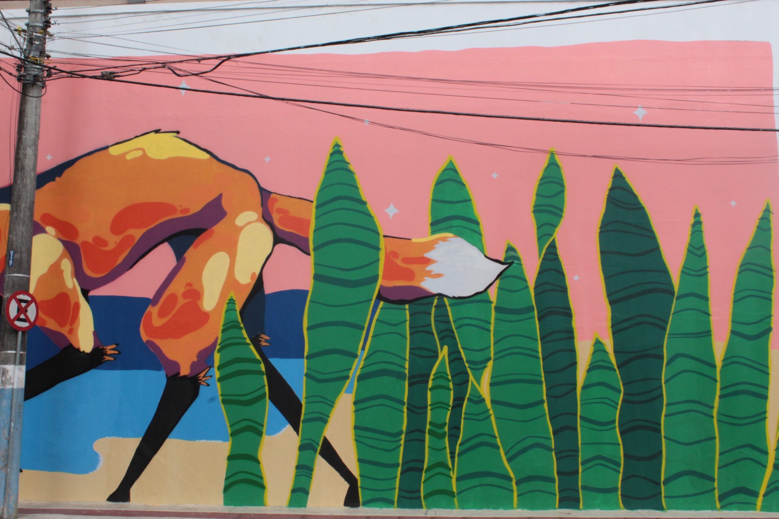 A obra representa a figura de um lobo guará em meio as plantas ( espadas de São Jorge).