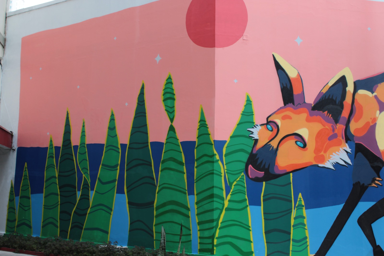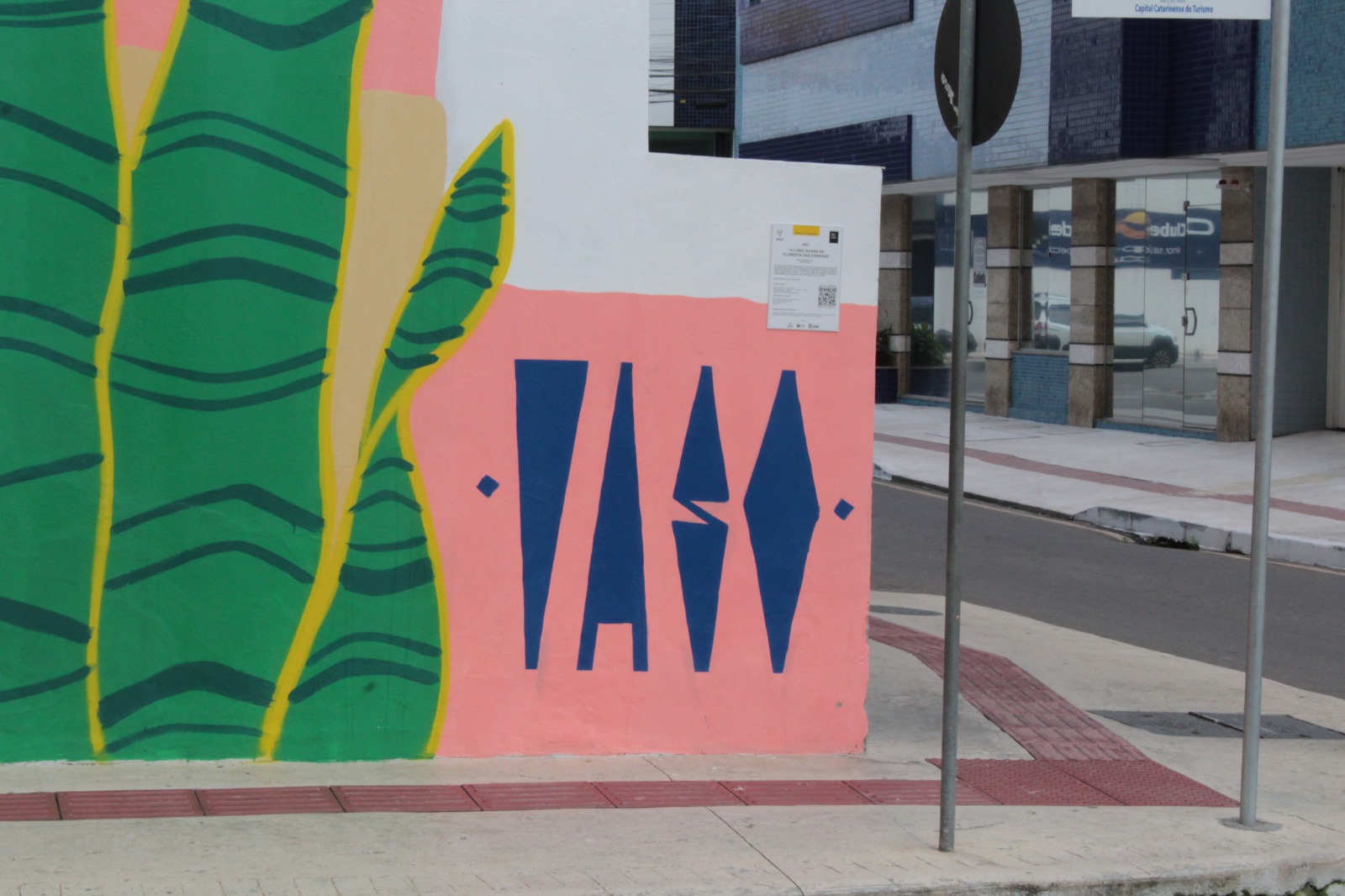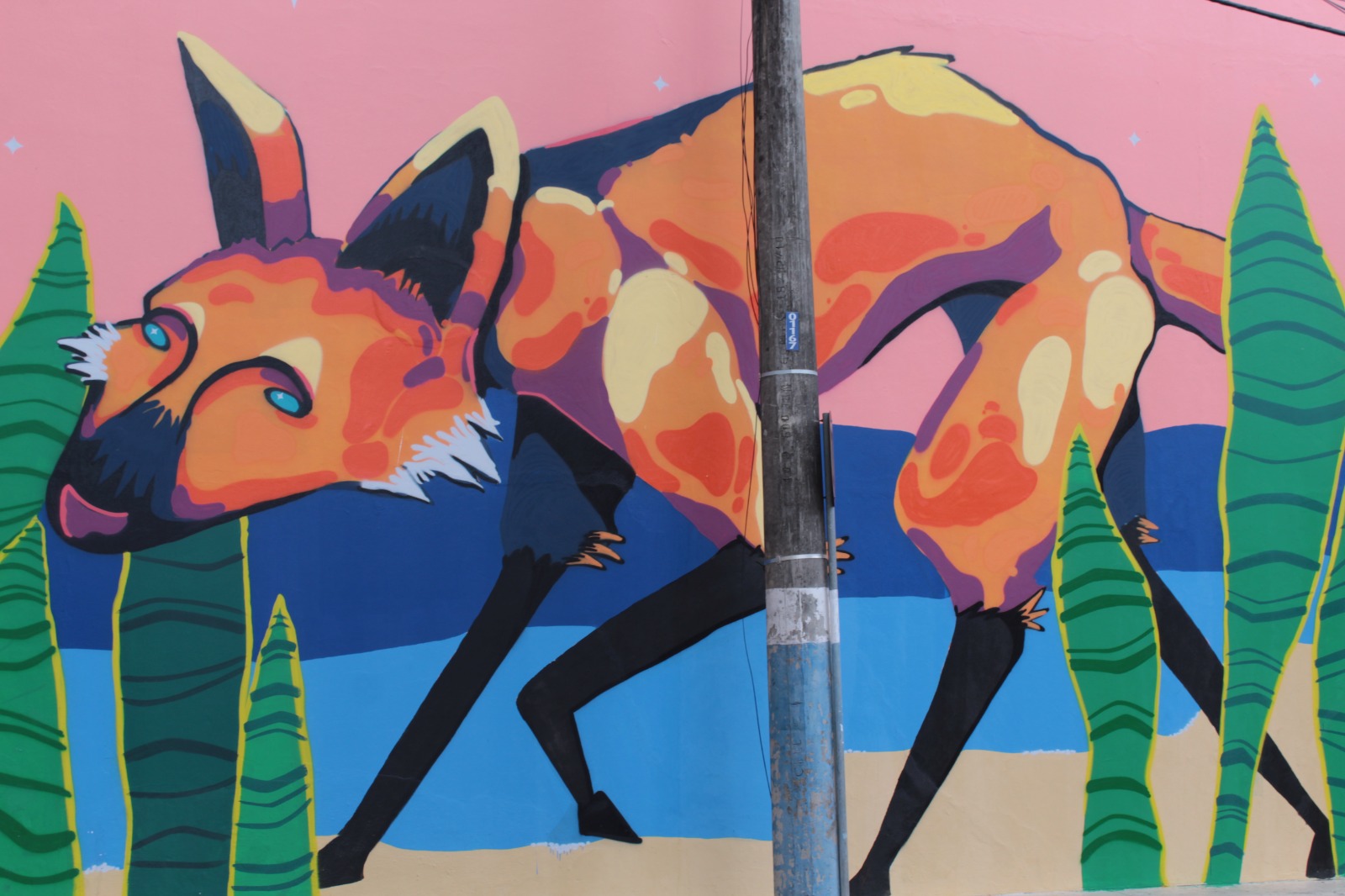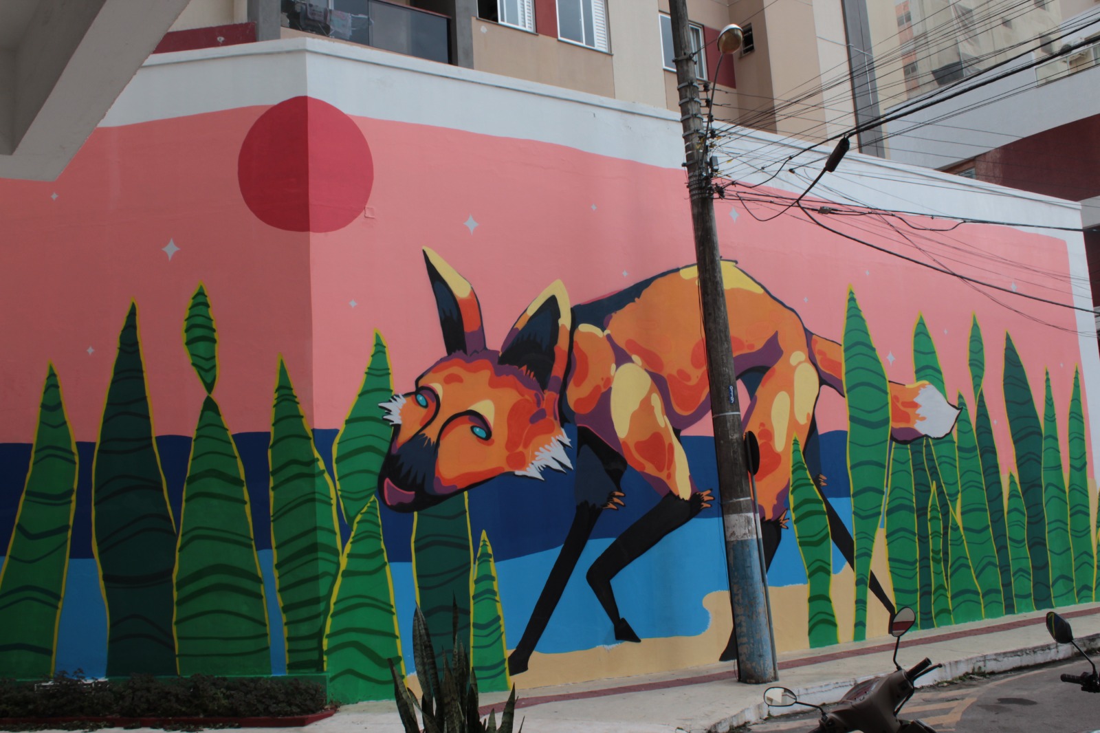 A obra representa a figura de um lobo guará em meio as plantas ( espadas de São Jorge).
