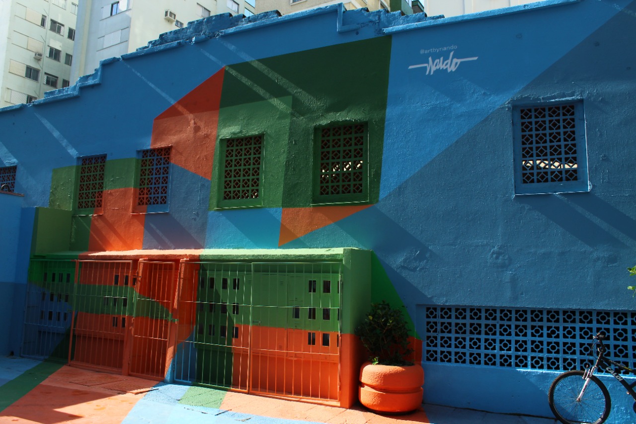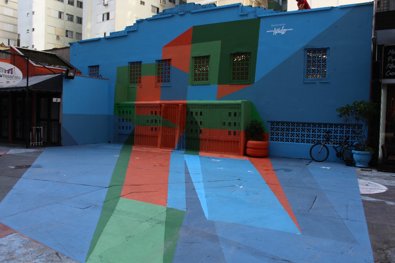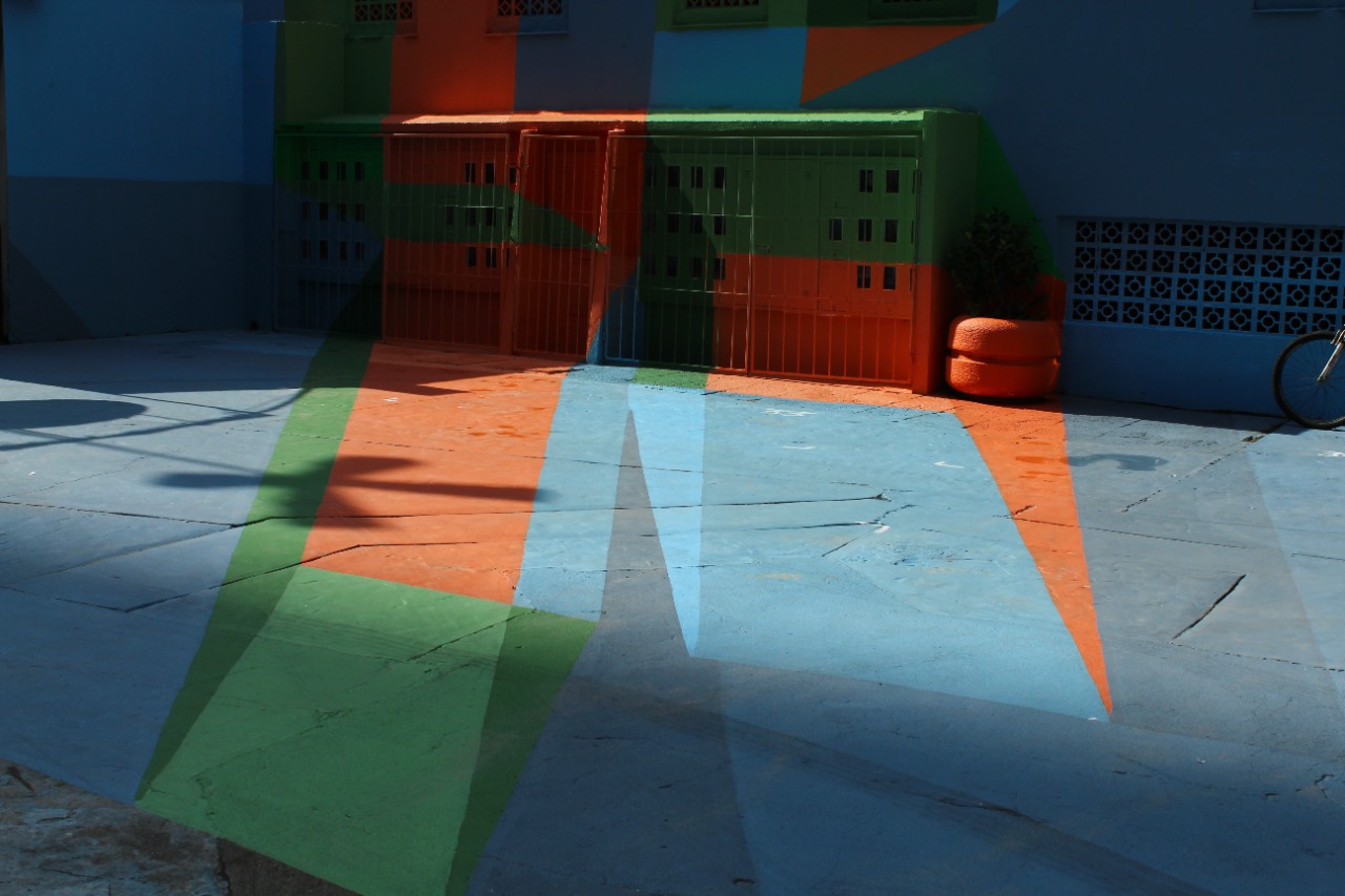 Mural anamórfico pintado com linhas com linhas dinâmicas e paralelas, fazendo o uso de três cores centrais, sendo elas, azul, laranja e verde.