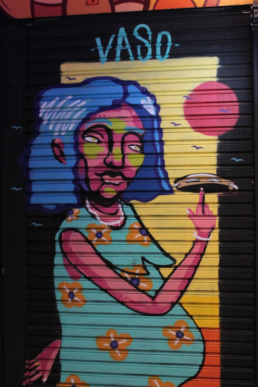 Representação de uma figura feminina de cabelos lilás manejando um pandeiro.