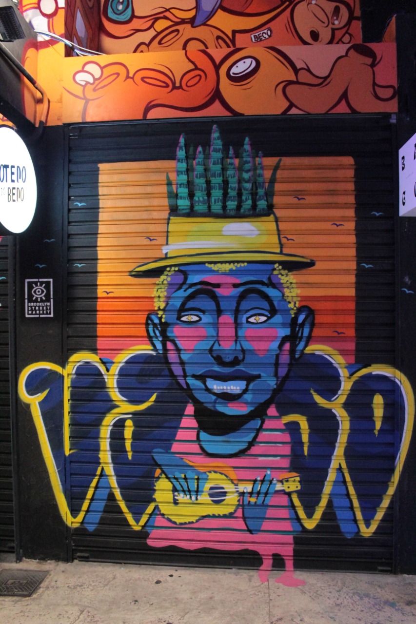 Representação de um personagem de chapéu com folhagens tocando um instrumento musical.