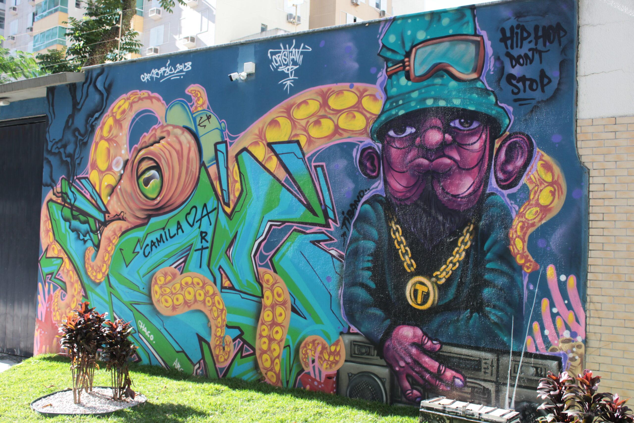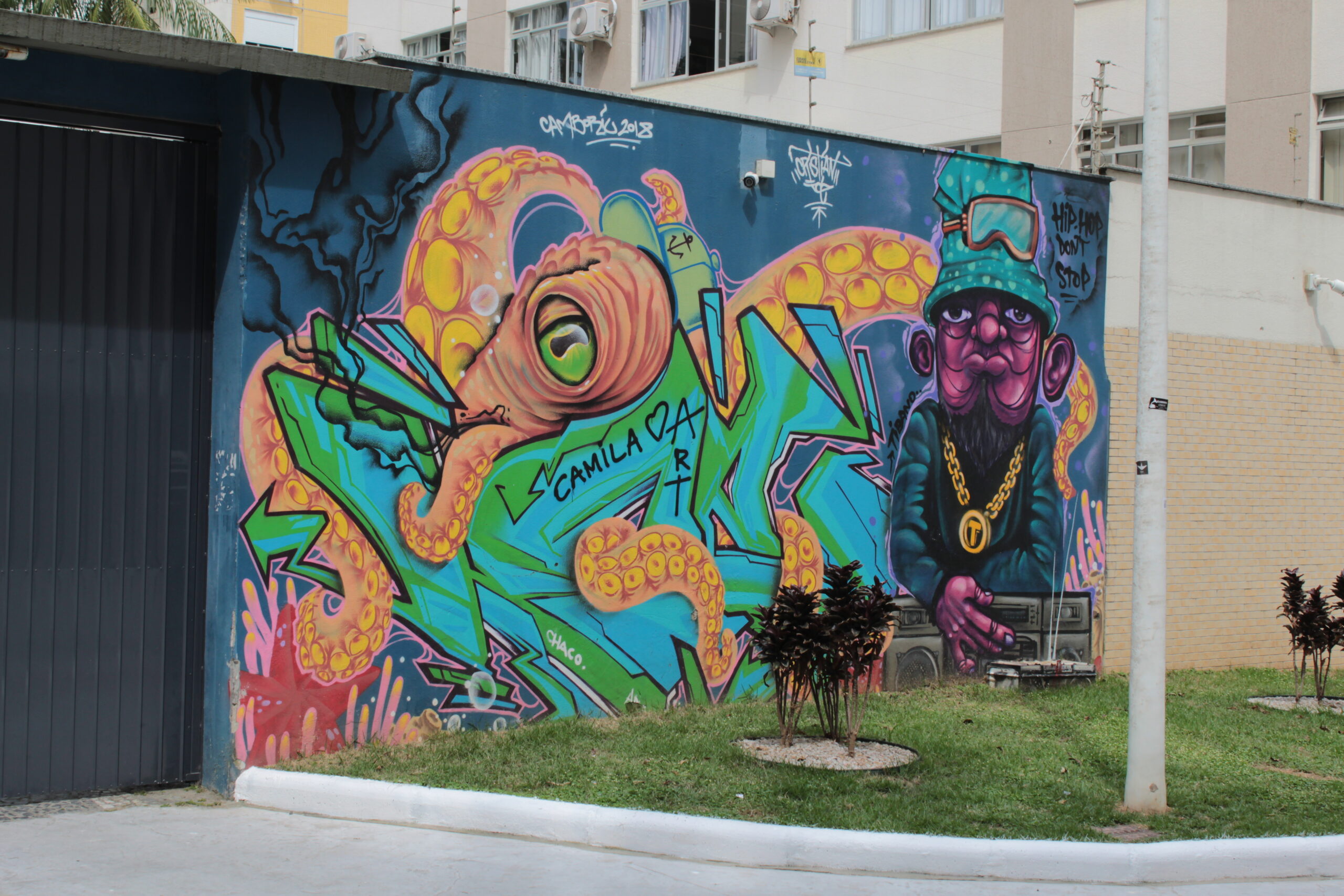 Representação de uma figura enaltecendo o hip hop juntamente com um polvo e elementos coloridos que agregam vida a obra.