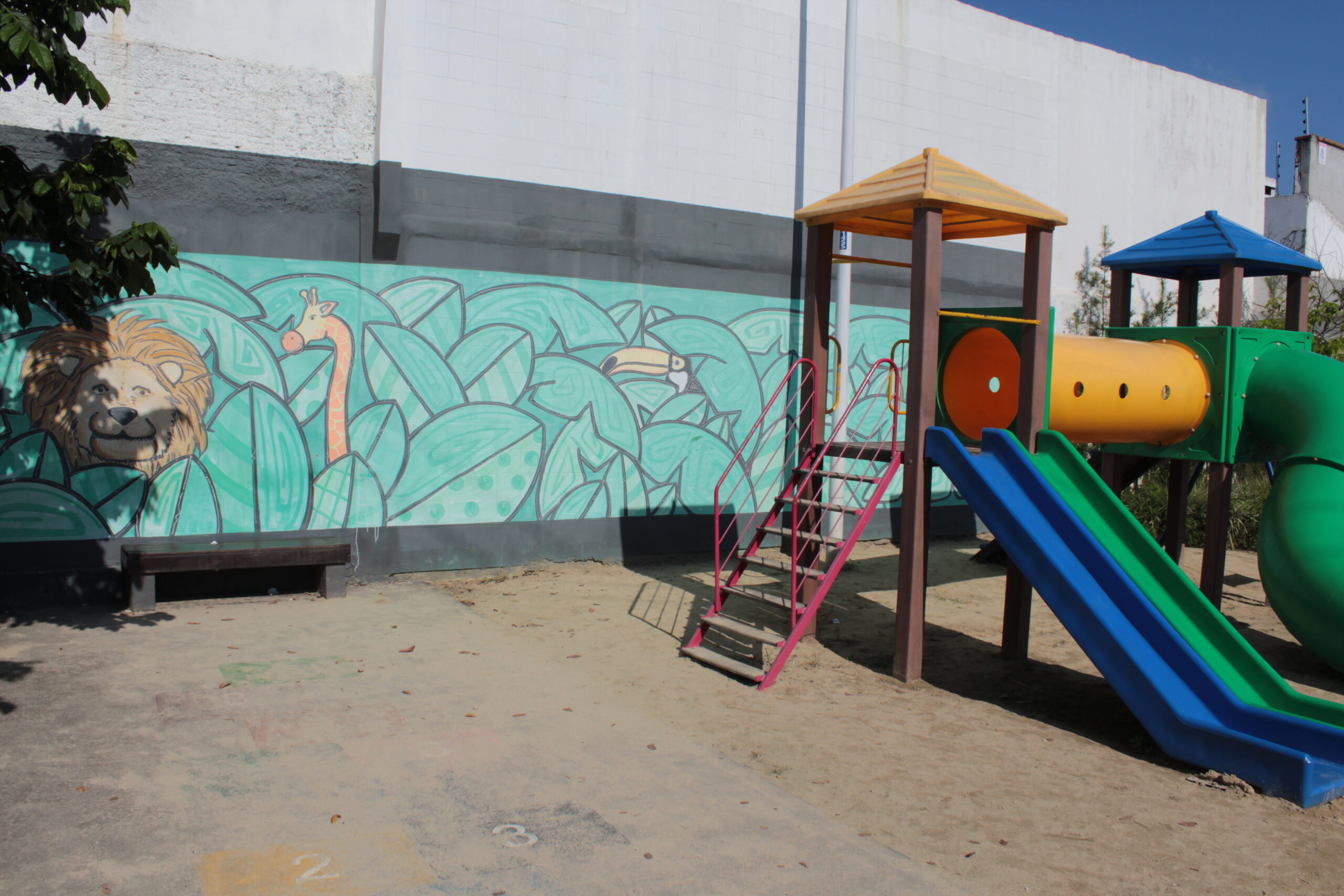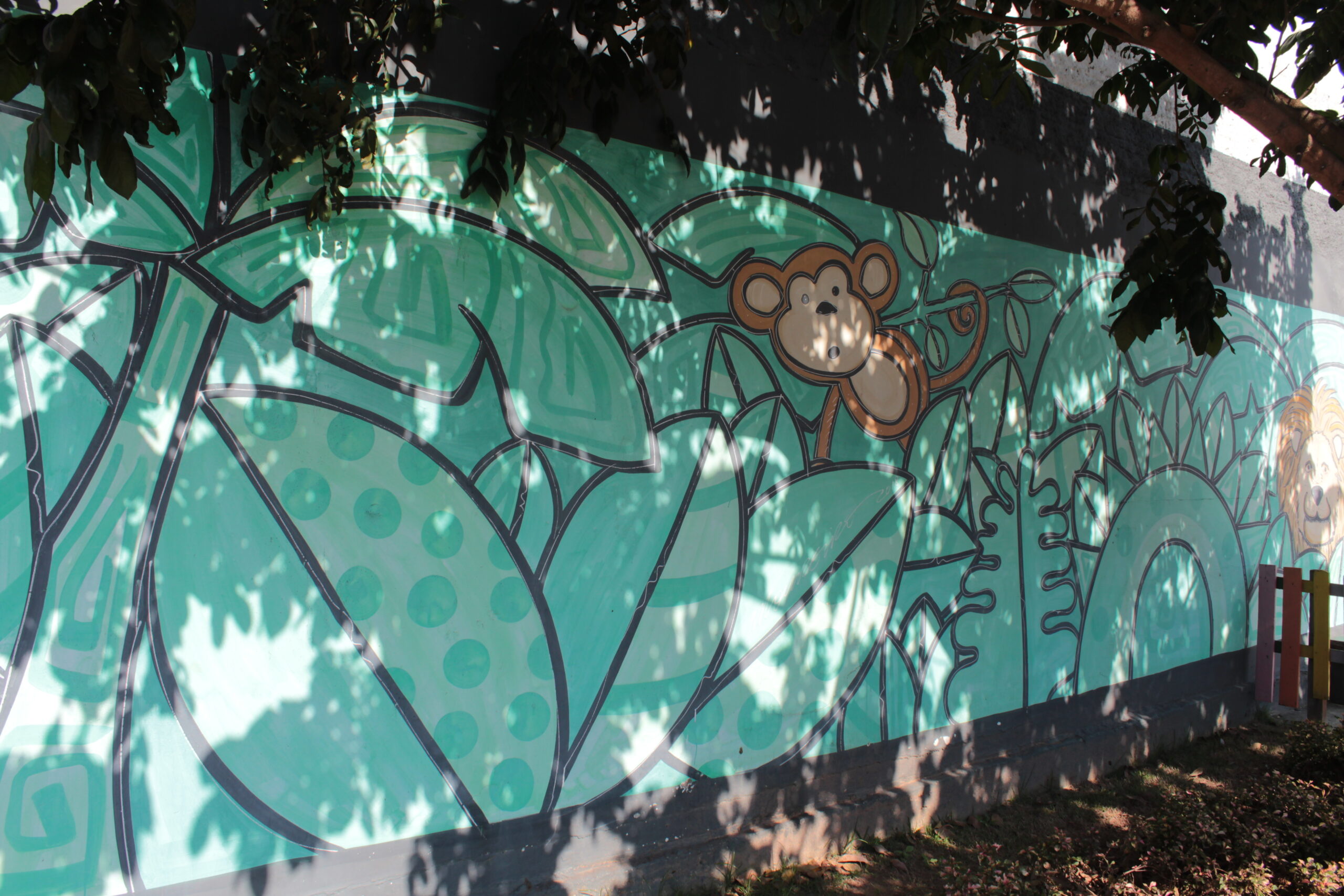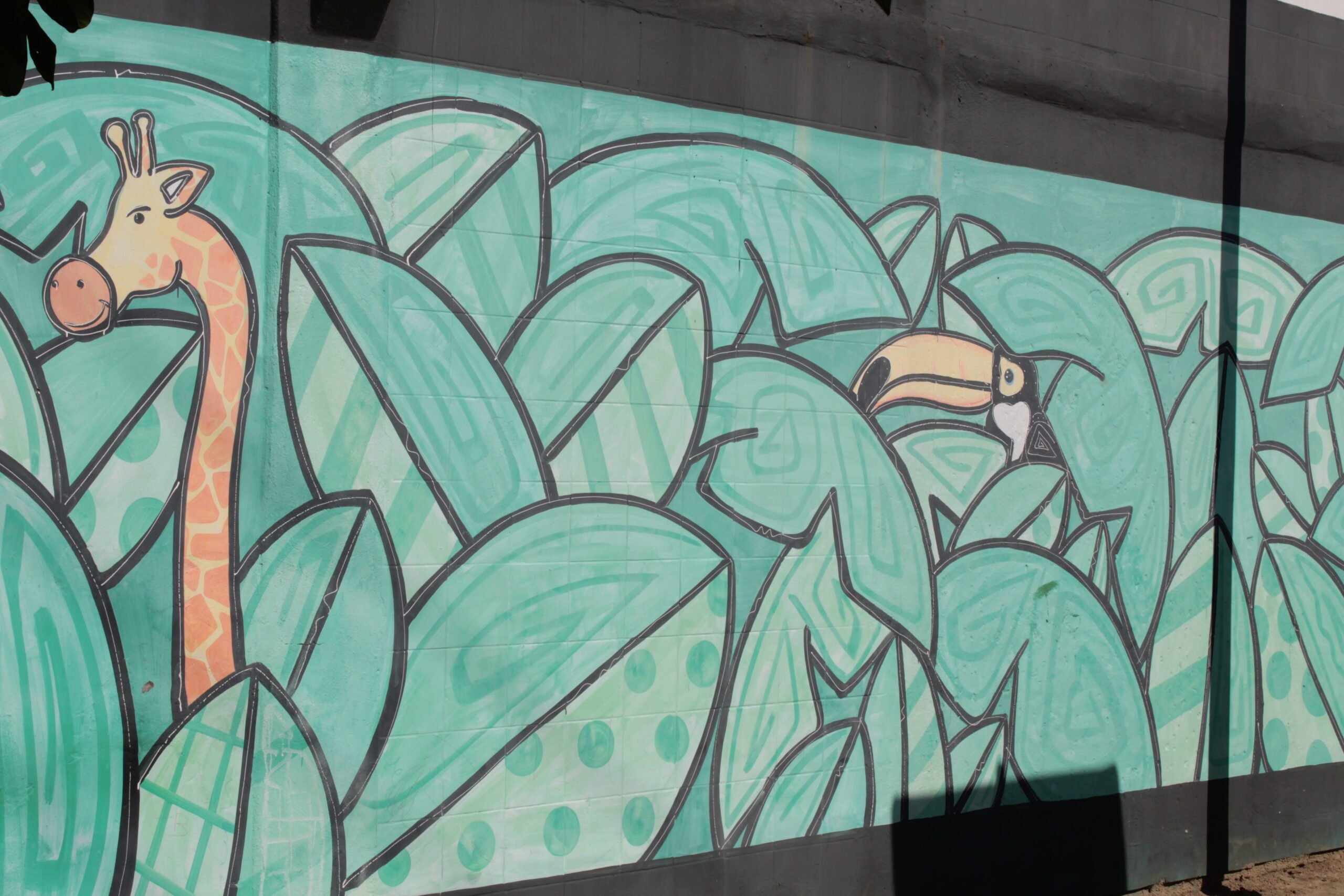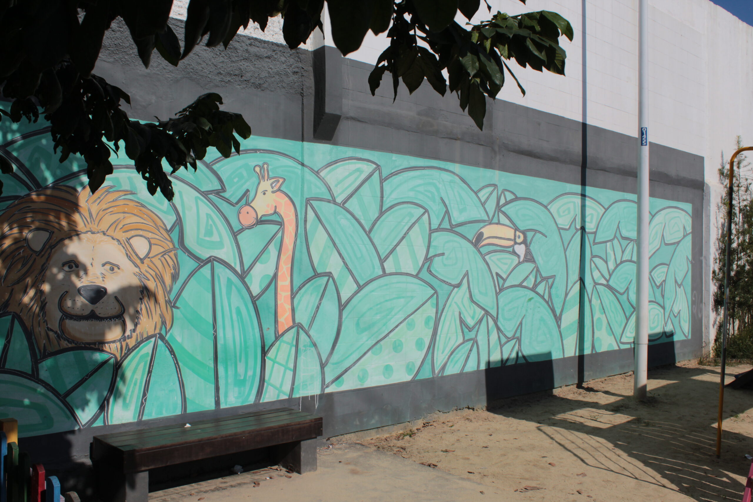 Três animais se destacam como elementos centrais entre folhagens verdes, sendo eles, girafa, leão e tucano.